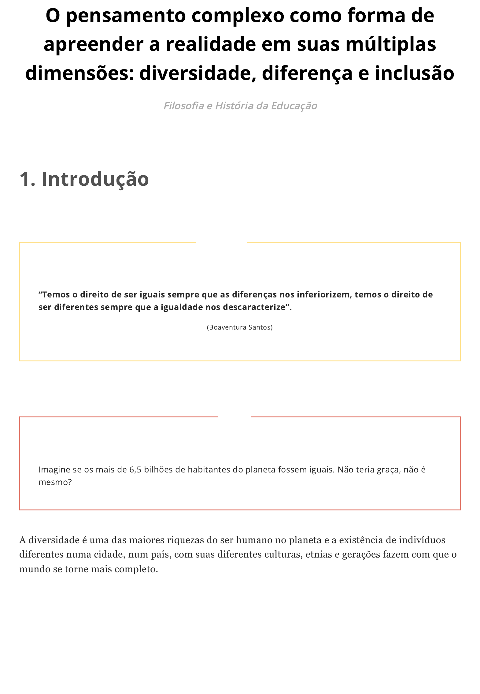 O pensamento complexo como forma de apreender a realidade em suas múltiplas dimensões: diversidade, diferença e inclusão Filoso�a e História da Educação 1. Introdução A diversidade é uma das maiores riquezas do ser humano no planeta e a existência de indivíduos diferentes numa cidade, num país, com suas diferentes culturas, etnias e gerações fazem com que o mundo se torne mais completo. “Temos o direito de ser iguais sempre que as diferenças nos inferiorizem, temos o direito de ser diferentes sempre que a igualdade nos descaracterize”. (Boaventura Santos) Imagine se os mais de 6,5 bilhões de habitantes do planeta fossem iguais. Não teria graça, não é mesmo? Mas essa convivência só se torna possível se as diferenças forem respeitadas. O artigo 2º da Declaração Universal dos Direitos Humanos (DUDH), aprovada na Assembleia Geral das Nações Unidas em 10 de dezembro de 1948, diz que não deve haver, em nenhum momento, discriminação por raça, cor, gênero, idioma, nacionalidade, opinião ou qualquer outro motivo. É possível que a extrema pobreza e a desigualdade sejam eliminadas, mas questões fundamentais ainda precisam ser enfrentadas, como a violência, a prostituição infantil, o trabalho escravo e diversos outros problemas. No Brasil, a proteção e a promoção dos direitos de todo ser humano são articuladas e colocadas em prática com o auxílio da Secretaria Especial dos Direitos Humanos (SDH), da Presidência da República. O órgão é responsável por colocar em prática princípios estabelecidos em estatutos e pela proteção dos direitos de cidadãos, das criança, dos adolescente, dos idosos, das minorias e das pessoas com deficiência. Imagine se fôssemos todos iguais? Diversidade, Inclusão e Convívio. https://cead.uvv.br/conteudo/wp-content/uploads/2019/04/aula_filedu_top10_img01.png https://cead.uvv.br/conteudo/wp-content/uploads/2019/04/aula_filedu_top10_img02-768x432.png 2. Diversidade Vivemos em um país e um mundo marcado pela diversidade, pelo pluralismo de etnias, povos, identidades, subjetividades e representações. O diverso é algo que compõe a condição humana e está intrinsecamente ligado à ideia de humanidade, que só existe e só é possível na diversidade. A diversidade pode ser entendida a partir de diferentes formas, sendo mais comumente relacionada às noções de variedade, pluralidade e diferença. O diverso, portanto, é o diferente na medida em que ele também é igual a mim, enquanto eu sou o diferente do outro. A diversidade é um dado, uma constatação da humanidade. O problema central e fundamental da diversidade gira em torno da forma pelo qual lidamos com essa diversidade, ou seja, com o diferente, com o outro. A cultura brasileira, apesar de ter construído historicamente mitos sobre o modo como lidamos com a diferença, é marcada por um sentimento de intolerância em relação ao outro. Não é incomum escutarmos notícias de agressões e mortes que acontecem com as pessoas mais vulneráveis dessa sociedade, o que desconstrói qualquer concepção mitológica sobre o modo como nos relacionamos com a diferença. Numa época marcada por intercâmbios culturais e o encurtamento de distâncias geográficas a diversidade passa a fazer cada vez mais parte do nosso cotidiano. No entanto, o medo do contato com o outro (diferente) pode fazer aflorar o fundamentalismo cultural, fazendo com que a intolerância seja elevada a princípio e dispositivo de determinada relação social. Desse modo, a interculturalidade e a construção de uma sociedade aberta ao plural e ao diverso se vê ameaçada pelo fundamentalismo e por práticas culturais fechadas à compreensão e respeito ao diverso. Esse medo do diferente é alimentado por uma série de preconceitos e pré-julgamentos que desumanizam sem, entretanto, conhecer. É verdade que se vive num tempo marcado pela afirmação das identidades culturais – tendo em vista os diversos significados que ela pode ter –, no entanto, a identidade não pode ser vista apenas na sua dimensão estática, mas também na sua dinamicidade, ou seja, nos correntes processos de identificação que ocorrem com grande frequência (HALL, 2004). Há décadas se fala no plano jurídico tanto nacional quanto internacional sobre o direito à diversidade, ou mesmo da produção de políticas públicas com o respeito à diversidade. Nessa perspectiva, pensar em um direito à diversidade hoje em dia implica em concebê-lo a partir de uma intervenção cultural, no plano do simbólico e da representação. Desse modo, os direitos à diversidade, bem como as políticas de diversidade, devem ser pensados com fulcro na transformação sociocultural e nas potencialidades que uma convivência harmônica, com respeito à diversidade, pode trazer não para um ou outro, mas para o conjunto da sociedade. O contato com as culturas diferentes é algo necessário, oportuno e importante para qualquer pessoa/grupo social, tendo em vista que nenhuma cultura é (e também nunca será) completa, como já disse Santos (2002). Assim, o contato com outras culturas permite compreender melhor o contexto sociocultural que as pessoas se encontram inseridas, como também conhecer diferentes formas de expressão cultural. É o contato que gera a empatia e trocas de experiências e visões de mundo, alimentando o respeito e a compreensão do outro diferente. Pensar a diversidade como direito implica em transcender os limites da tolerância e construir relações sociais que se pautem no respeito ao outro e na compreensão de que o diverso é fundamental, necessário e contingente. Trata-se de uma causa mais que necessária em um mundo onde o preconceito e a intolerância crescem todos os dias, e inclusive ganham projeção na esfera política, o que pode resultar em significativos retrocessos sociais (HALL, 2004). A diversidade, entendida como direito e trabalhada no plano da cultura, tem a potencialidade de desen