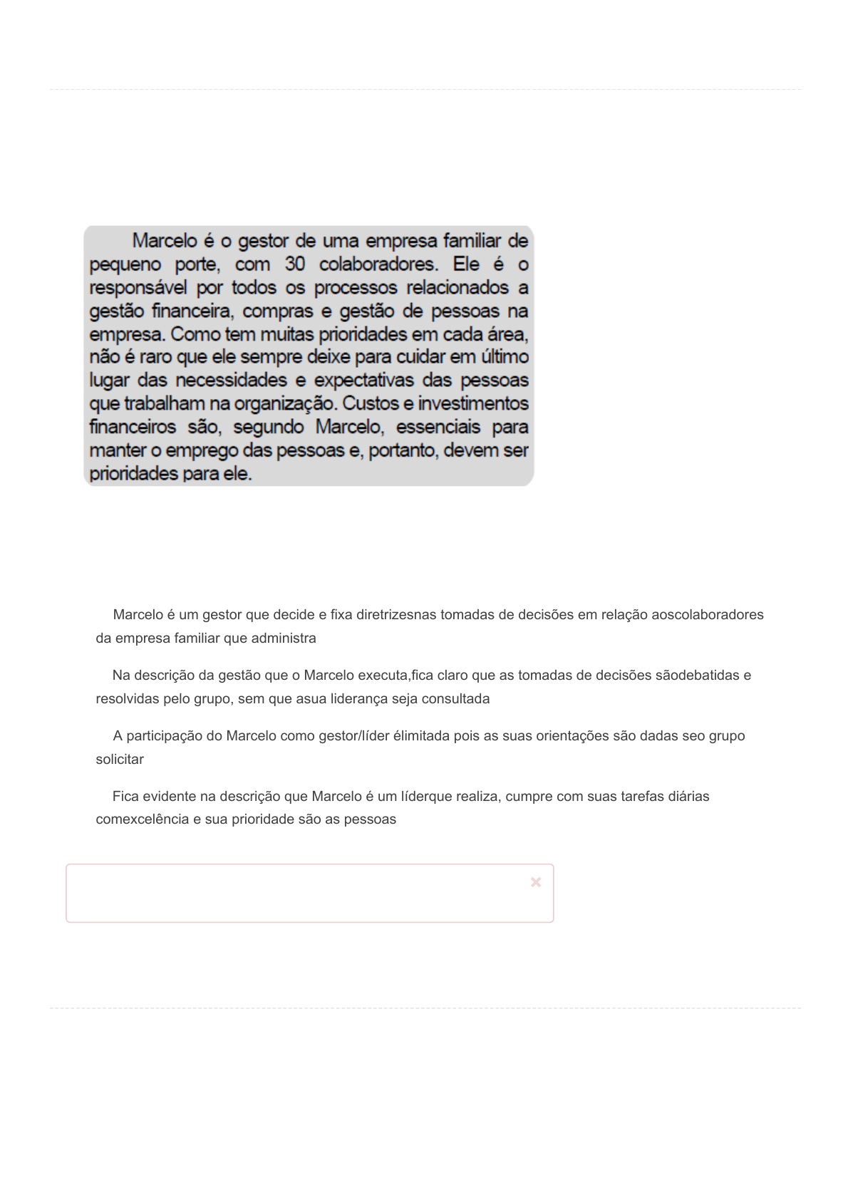 22/06/2021 Questões de Concursos e Perguntas de Concursos Públicos- Aprova Concursos https://www.aprovaconcursos.com.br/questoes-de-concurso/questoes/assunto/Empreendedorismo 1/4 1) Q795335 - IBFC - 2020 - EBSERH - Analista Administrativo Provas: IBFC - 2020 - EBSERH - Analista Administrativo Disciplina: Administração Geral - Assuntos: Empreendedorismo Administração geral Gestão organizacional e empresarial Processo decisório, liderança e gerência Analise o quadro a seguir. Em relação à gestão que Marcelo realiza, assinale a alternativa correta. Você errou. A alternativa correta é a letra (B) Assista ao comentário do professor e tire suas dúvidas clicando aqui. a) O gestor Marcelo dá total liberdade para quetodos atuem sem a sua intervenção direta ouindireta na organização b) Marcelo é um gestor que decide e fixa diretrizesnas tomadas de decisões em relação aoscolaboradores da empresa familiar que administra c) Na descrição da gestão que o Marcelo executa,fica claro que as tomadas de decisões sãodebatidas e resolvidas pelo grupo, sem que asua liderança seja consultada d) A participação do Marcelo como gestor/líder élimitada pois as suas orientações são dadas seo grupo solicitar e) Fica evidente na descrição que Marcelo é um líderque realiza, cumpre com suas tarefas diárias comexcelência e sua prioridade são as pessoas ×× 2) Q781350 - IDECAN - 2019 - IF-PB - Professor EBTT - Administração Geral Provas: IDECAN - 2019 - IF-PB - Professor EBTT - Administração Geral Disciplina: Administração Geral - Assuntos: Empreendedorismo A história do empreendedorismo e da criação de novos negócios é muitas vezes uma história de grandes fortunas e fracassos. Há de se considerar que o empreendedorismo é o processo de https://www.aprovaconcursos.com.br/questoes-de-concurso/questao/795335-ibfc-2020-ebserh-analista-administrativo https://www.aprovaconcursos.com.br/questoes-de-concurso/prova/ibfc-2020-ebserh-analista-administrativo https://www.aprovaconcursos.com.br/questoes-de-concurso/disciplina/administracao-geral https://www.aprovaconcursos.com.br/questoes-de-concurso/questoes/assunto/Empreendedorismo https://www.aprovaconcursos.com.br/questoes-de-concurso/questoes/assunto/Administra%C3%A7%C3%A3o+geral https://www.aprovaconcursos.com.br/questoes-de-concurso/questoes/assunto/Gest%C3%A3o+organizacional+e+empresarial https://www.aprovaconcursos.com.br/questoes-de-concurso/questoes/assunto/Processo+decis%C3%B3rio%2C+lideran%C3%A7a+e+ger%C3%AAncia https://www.aprovaconcursos.com.br/questoes-de-concurso/questao/781350-idecan-2019-if-pb-professor-ebtt-administracao-geral https://www.aprovaconcursos.com.br/questoes-de-concurso/prova/idecan-2019-if-pb-professor-ebtt-administracao-geral https://www.aprovaconcursos.com.br/questoes-de-concurso/disciplina/administracao-geral https://www.aprovaconcursos.com.br/questoes-de-concurso/questoes/assunto/Empreendedorismo 22/06/2021 Questões de Concursos e Perguntas de Concursos Públicos- Aprova Concursos https://www.aprovaconcursos.com.br/questoes-de-concurso/questoes/assunto/Empreendedorismo 2/4 Você errou. A alternativa correta é a letra (C) a) analisar o mercado, identificar produtos, selecionar nichos e assumir riscos. b) explorar os recursos naturais, planejar, organizar e operar um novo negócio. c) planejar, organizar, operar um novo negócio e assumir riscos por ele. d) criar novos produtos, organizar, identificar nichos e adentrar em mercados já consolidados. e) elaborar um plano de negócios, explorar o pioneirismo, planejar e operar. ×× 3) Q783452 - FCC - 2019 - TJ-MA - Técnico Judiciário - Apoio Técnico Administrativo Provas: FCC - 2019 - TJ-MA - Técnico Judiciário - Apoio Técnico Administrativo Disciplina: Administração Geral - Assuntos: Empreendedorismo Comportamento Organizacional Administração geral Gestão organizacional e empresarial Modelos de gestão Novas Abordagens da Administração O setor público atua em diversas esferas de serviços, tais como saúde, educação, segurança, transporte, dentre outros, sendo que há alta demanda e complexidade para a prestação desses serviços com eficiência. Nesse sentido, é correto afirmar que o aprimoramento de estratégias e técnicas administrativas, aliados ao desenvolvimento e aplicação de novas tecnologias, podem ser considerados como Você errou. A alternativa correta é a letra (D) Assista ao comentário do professor e tire suas dúvidas clicando aqui. a) gestão burocrática gerencial, a fim de preservar o patrimônio público em todas as esferas de serviços. b) modelo de Administração pública gerencial, que emprega principalmente um controle rígido dos processos. c) modelo de gestão patrimonialista, que vem sendo empregado nos dias atuais a fim de garantir sustentabilidade e inovação no setor público. d) empreendedorismo no setor público, que se refere a processos de aperfeiçoamento e de inovação. e) modelo de gestão de inovação gerencial burocrática, com o objetivo de garantir que haja impessoalidade e combate à corrupção. ×× 4) Q768752 - IFMS - 2019 - IFMS - Administrador Provas: IFMS - 2019 - IFMS - Administrador Disciplina: Administração Geral - Assuntos: Empreendedorismo Julgue as afirmativas sobre a inovação tecnológica e o processo empreendedor e assinale a alternativa INCORRETA: https://www.aprovaconcursos.com.br/questoes-de-concurso/questao/783452-fcc-2019-tj-ma-tecnico-judiciario-apoio-tecnico-administrativo https://www.aprovaconcursos.com.br/questoes-de-concurso/prova/fcc-2019-tj-ma-tecnico-judiciario-apoio-tecnico-administrativo https://www.aprovaconcursos.com.br/questoes-de-concurso/disciplina/administracao-geral https://www.aprovaconcursos.com.br/questoes-de-concurso/questoes/assunto/Empreendedorismo https://www.aprovaconcursos.com.br/questoes-de-concurso/questoes/assunto/Comportamento+Organizacional https://www.aprovaconcursos.com.br/questoes-de-concurso/questoes/assunto/Administ