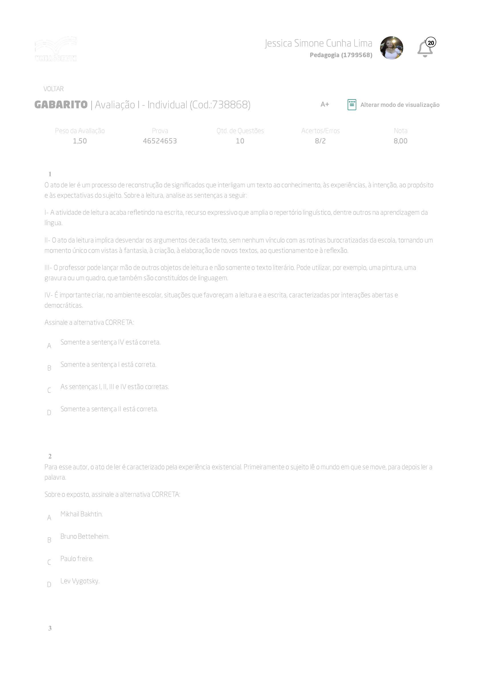 17/05/2022 14:16 AVA https://ava2.uniasselvi.com.br/subject/grades-and-tests/answer-book/eyJ0ZXN0Ijp7InRlc3RDb2RlIjoiNzM4ODY4IiwiZGVzY3JpcHRpb24iOiJBdmFsaWHDp8OjbyBJIC0gSW5kaXZpZHVhbCIsInBhcmFtZXRlciI6MTI5MjEzLCJle… 1/4 GABARITO | Avaliação I - Individual (Cod.:738868) Peso da Avaliação 1,50 Prova 46524653 Qtd. de Questões 10 Acertos/Erros 8/2 Nota 8,00 O ato de ler é um processo de reconstrução de significados que interligam um texto ao conhecimento, às experiências, à intenção, ao propósito e às expectativas do sujeito. Sobre a leitura, analise as sentenças a seguir: I- A atividade de leitura acaba refletindo na escrita, recurso expressivo que amplia o repertório linguístico, dentre outros na aprendizagem da língua. II- O ato da leitura implica desvendar os argumentos de cada texto, sem nenhum vínculo com as rotinas burocratizadas da escola, tornando um momento único com vistas à fantasia, à criação, à elaboração de novos textos, ao questionamento e à reflexão. III- O professor pode lançar mão de outros objetos de leitura e não somente o texto literário. Pode utilizar, por exemplo, uma pintura, uma gravura ou um quadro, que também são constituídos de linguagem. IV- É importante criar, no ambiente escolar, situações que favoreçam a leitura e a escrita, caracterizadas por interações abertas e democráticas. Assinale a alternativa CORRETA: A Somente a sentença IV está correta. B Somente a sentença I está correta. C As sentenças I, II, III e IV estão corretas. D Somente a sentença II está correta. Para esse autor, o ato de ler é caracterizado pela experiência existencial. Primeiramente o sujeito lê o mundo em que se move, para depois ler a palavra. Sobre o exposto, assinale a alternativa CORRETA: A Mikhail Bakhtin. B Bruno Bettelheim. C Paulo freire. D Lev Vygotsky. VOLTAR A+ Alterar modo de visualização 1 2 3 Jessica Simone Cunha Lima Pedagogia (1799568) 20 17/05/2022 14:16 AVA https://ava2.uniasselvi.com.br/subject/grades-and-tests/answer-book/eyJ0ZXN0Ijp7InRlc3RDb2RlIjoiNzM4ODY4IiwiZGVzY3JpcHRpb24iOiJBdmFsaWHDp8OjbyBJIC0gSW5kaXZpZHVhbCIsInBhcmFtZXRlciI6MTI5MjEzLCJle… 2/4 O ato de ler, de autoria de Irismar Oliveira Santos-Théo, o qual aborda a relação que se estabelece entre o autor e o leitor, bem como os tipos de leitura, como possibilidade de melhor compreensão e aproveitamento do ato de ler, complementa as informações e reflexões acerca do processo de leitura. Sobre o que a leitura intelectual aborda, segundo esse autor, assinale a alternativa CORRETA: A Tem muito racionalismo e nem sempre é verdadeira. B Um processo de análise que procura detectar a organização do texto, percebendo como ele constitui uma unidade e como as partes a relacionam para formar essa unidade. C A consciência permanente de que todo texto é um ato de comunicação, respondendo, portanto, a um projeto de quem o produz. D Conhecimento do texto propriamente dito, percorrendo as páginas e travando contato com o conteúdo. O texto tem uma existência física, podendo ser um romance, uma epopeia, um filme, um anúncio, um conto ou uma música e se destina à interpretação do leitor. Sobre o texto, analise as sentenças a seguir: I- O texto é uma espécie de teia de linguagem, que interliga o produto do trabalho literário a outros discursos. II- O texto encontra no leitor uma experiência que se abre a múltiplas direções e que estabelece ligações com o mundo de significados sempre em expansão. III- O texto não existe antes de sua leitura e esta não se constitui em algo de aceitação passiva, mas, no seu processo, o leitor ativa mecanismos que desconstroem e constroem significados. IV- A produção de um texto acontece sempre em um determinado momento histórico, no qual se encontra a vivência de um horizonte de expectativas, proveniente de um conjunto de conhecimentos e informações disponível e compartilhado pelos possíveis interlocutores. Assim, ao fazer a produção de um texto, o autor pretende alguns sentidos, esses vindos da forma de compreensão de mundo, constituída naquele momento histórico específico e em uma determinada cultura. Assinale a alternativa CORRETA: A As sentenças I, II, III e IV estão corretas. B Somente a sentença IV está correta. C Somente a sentença I está correta. D Somente a sentença III está correta. "A palavra é precedida da leitura do mundo. O ato de ler é caracterizado pela experiência existencial. O sujeito lê o mundo em que se move, para depois ler a palavra." Sobre o autor desse pensamento, assinale a alternativa CORRETA: A Paulo Freire. B Erico Verissimo. C Jean Piaget. D Célestin Freneit. 4 5 Jessica Simone Cunha Lima Pedagogia (1799568) 20 17/05/2022 14:16 AVA https://ava2.uniasselvi.com.br/subject/grades-and-tests/answer-book/eyJ0ZXN0Ijp7InRlc3RDb2RlIjoiNzM4ODY4IiwiZGVzY3JpcHRpb24iOiJBdmFsaWHDp8OjbyBJIC0gSW5kaXZpZHVhbCIsInBhcmFtZXRlciI6MTI5MjEzLCJle… 3/4 Define um processo pelo qual o indivíduo se utiliza dos sinais gráficos para escrever, e os identifica, através da leitura. Sobre esse conceito, assinale a alternativa CORRETA: A Leitura. B Letramento. C Alfabetização. D Interpretação. Não se limita a analisar os textos. Na realidade, o que se fundamenta é a consciência permanente de que todo texto é um ato de comunicação, respondendo, portanto, a um projeto de quem o produz. Essa leitura não deve ser vista como uma forma de abordar os textos, reduzindo-os a feixes de conceitos incapazes de despertar qualquer prazer. Ela começa por um processo de análise que procura detectar a organização do texto, percebendo como ele constitui uma unidade e como as partes a relacionam para formar essa unidade. Sobre esse tipo de leitura, assinale a alternativa CORRETA: A Leitura emocional. B Leitura normal. C Leitura intelectual. D Leitura sensorial. O diálogo, no sentido estrito do termo, não constitui, é claro, senão uma das formas é verdade que das mais importa