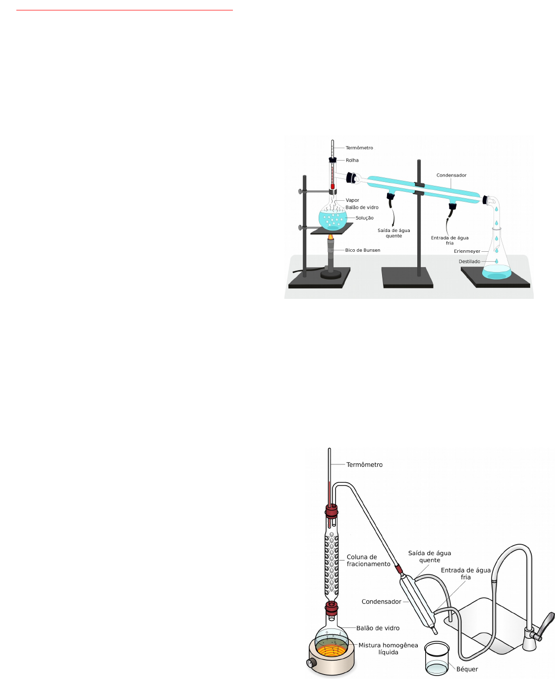 PROCESSOS DE SEPARAÇÃO DE MISTURAS 1 - Separação de misturas heterogêneas Misturas sólido – sólido ➢ Catação: usando a mão ou pinças, separa-se os componentes sólidos. Exemplo: separar os grãos do feijão. ➢ Ventilação: o sólido menos denso (mais leve) é separado da mistura através de uma corrente de ar. Exemplo: remoção das cascas de amendoim. ➢ Levigação: o sólido menos denso (mais leve) é separado da mistura através de uma corrente de água que carrega consigo o sólido mais leve. Exemplo: separação de areia e ouro no processo de mineração. ➢ Separação magnética: um dos sólidos é atraído por um ímã e separado da mistura. Exemplo: separação do minério de ferro de outras impurezas durante a mineração. ➢ Dissolução fracionada: um dos componentes sólidos é dissolvido em um líquido. A solução resultante é separada do sólido insolúvel por filtração. Exemplo: separação da mistura areia + sal usando água. O sólido dissolvido no líquido é recuperado pela vaporização do mesmo. ➢ Flotação: usa-se um líquido de densidade intermediria aos constituintes da mistura, o material mais denso afunda e o menos denso flutua. Exemplo: serragem + areia. ➢Peneiração ou tamisação: método no qual utiliza- se uma peneira para separar grãos sólidos de tamanho maior presentes em uma mistura. Peneirar a farinha de trigo Misturas sólido – líquido ➢ Decantação ou sedimentação: a fase sólida, por ser mais densa, sedimenta-se (deposita-se) no fundo do recipiente. O líquido sobrenadante pode ser removido vertendo-se o recipiente com cuidado. Exemplo: separação da mistura de água + barro. ➢ Filtração simples: a fase sólida é separada da líquida através de um filtro de papel. Exemplo: coando café; separação da mistura de água + barro. ➢Centrifugação: é um método que acelera o fenômeno da decantação, quando a mistura é submetida a movimentos de translação em um equipamento denominado centrífuga Misturas líquido – líquido ➢ Decantação: separam-se líquidos imiscíveis com densidades diferentes. O mais pesado (mais denso) acumula-se na parte inferior do recipiente e o mais leve (menos denso) fica no topo. Para fazer esse tipo de separação em um laboratório, usa-se o funil de separação (ou funil de decantação). Exemplo: separação da mistura água + óleo. Misturas sólido – gás ➢ Filtração: separação da poeira do ar. Exemplo: aspirador de pó. 2) Separação de misturas homogêneas Misturas sólido – líquido ➢ Evaporação: a mistura é aquecida até que o líquido sofra evaporação (em uma temperatura acima do seu ponto de ebulição). Nesse caso, o líquido é perdido. Exemplo: separação da mistura água + sal. ➢ Destilação simples: a mistura é aquecida em uma aparelhagem apropriada de tal forma que o componente líquido seja evaporado e, a seguir, sofra condensação, sendo recolhido em outro frasco. Exemplo: separação de água + sal. Nesse caso, tanto o líquido quanto o sólido são recuperados. A aparelhagem necessária para uma destilação simples é mostrada na figura a seguir. Misturas líquido – líquido ➢ Destilação fracionada: consiste no aquecimento da mistura de líquidos miscíveis, cujos pontos de ebulição (PE) são diferentes. Os líquidos são separados a medida em que cada um dos seus pontos de ebulição é atingido. Inicialmente, é separado o líquido de menor PE, depois, o líquido com PE intermediário e assim por diante. A aparelhagem usada é a mesma de uma destilação simples, com o acréscimo de uma coluna de fracionamento, conforme representado na figura a seguir. Exemplo: separação da mistura água + álcool. Misturas gás – gás ➢ Liquefação fracionada: a mistura de gases passa por um processo de liquefação e, posteriormente, pela destilação fracionada. Uma aplicação prática desse processo é a separação dos dois principais 1 https://brasilescola.uol.com.br/quimica/tamisacao-ventilacao-imantacao.htm https://brasilescola.uol.com.br/quimica/centrifugacao-sifonagem-destilacao.htm componentes do ar atmosférico: os gases oxigênio (O2) e nitrogênio (N2). Exercícios: ´ 1, (UFRJ) Com a adição de uma solução aquosa de açúcar a uma mistura contendo querosene e areia, são vistas claramente três fases. Para separar cada componente da mistura final, a melhor sequência é: a) filtração, decantação e destilação. b) cristalização, decantação e destilação. c) filtração, cristalização e destilação. d) centrifugação, filtração e decantação. e) destilação, filtração e decantação. 2. O “funil de bromo” também conhecido como funil de decantação é usado em laboratório para separar algumas misturas. Qual das misturas abaixo poderia ser separada usando esse tipo de funil? a) Água e glicose dissolvida. b) Água e óleo. c) Água e álcool, dois líquidos miscíveis. d) Água e areia. e) Areia e pó de ferro. 3, Relacione as colunas abaixo, indicando corretamente qual é o processo de separação mais adequado para cada mistura: Coluna 1: Coluna 2: I. Filtração a) limalhas de ferro na areia. II.Decantação b) ouro no barro e areia. III.Separação magnética c) amendoim torrado e suas cascas IV. Ventilação d) cascalho na areia. V.Tamisação e) pó de café na água. VI.Levigação f) água com areia. 4. Quando prepararmos o nosso cafezinho de cada dia, costumam-se realizar dois tipos principais de separação de misturas, que são: a) Decantação e filtração. b) Filtração e sedimentação. c) Filtração e sifonação. d) Decantação e extração. e) Extração e filtração. 5. (G1 - cftmg 2014) Considere que uma mistura formada por água, óleo de soja, cloreto de sódio e areia seja agitada vigorosamente em um recipiente fechado. A sequência correta de métodos capazes de separar cada substância dessa mistura é a) decantação, filtração e centrifugação. 