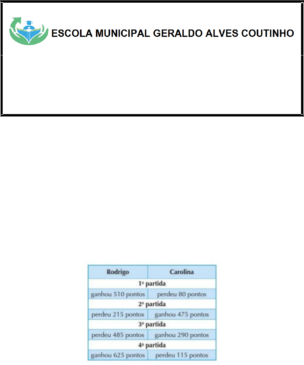 COMUNIDADE DE TABUAL AVALIAÇÃO DE MATEMÁTICA 1º BIMESTRE – 7º ANO ALUNO (A): ___________________________________________ TURNO: ___________________ PROFESSOR (A):________________________________________ANO/SÉRIE: _______________ DISCIPLINA: __________________________________________ DATA: ______/______/______ Questão 1: Expresse, utilizando a adição de números inteiros, cada situação que segue e dê o resultado. (Fazer os cálculos e deixar na prova ou em folha separada). a) Em um jogo, Alice ganhou 12 pontos e perdeu 7. b) Uma comida congelada estava sendo mantida a temperatura de ‒20 ºC e sofreu uma variação de ‒ 5 ºC. c) Em um torneio de futebol, um time tem 14 pontos ganhos e 20 pontos perdidos. d) Seu João depositou R$239,00 em sua conta corrente, que estava com um saldo devedor de R$540,00. Questão 2: Num jogo de baralho, Rodrigo e Carolina obtiveram os seguintes resultados: (Fazer os cálculos e deixar na prova ou em folha separada): a) Qual é o número total de pontos de Carolina após as quatro partidas? b) Qual é o número total de pontos de Rodrigo após as quatro partidas? c) De quem foi a vantagem final? Quantos pontos de diferença? Questão 3: Considere os seguintes números: Escolha dois deles, de modo que: (Fazer os cálculos e deixar na prova ou em folha separada). a) a soma seja zero. b) a soma seja –8. c) a soma seja –50. d) a soma seja 3. Questão 4: Os resultados de + 9 – 5 e + 5 – 9 são, respectivamente iguais a: (Fazer os cálculos e deixar na prova ou em folha separada). a) + 4 e + 4 b) + 4 e – 4 c) - 4 e + 4 d) – 4 e – 4 Questão 5: Sr. Manoel no dia 15/02 tinha no banco R$ 160,00. Durante os dias a seguir fez as seguintes movimentações: 16/02 – Depositou R$ 300,00. 17/02 – Retirou R$ 400,00 18/02 – Depositou R$ 150,00 19/02 – Retirou R$ 50,00 20/02 – Depositou R$ 30,00. Qual foi o saldo final do Sr. Manoel no dia 20/02? (Fazer os cálculos e deixar na prova ou em folha separada). Questão 6: Desenhe a reta numérica e resolva: a) Quantas unidades você tem que andar para ir no -8 ao +1? b) Quantas unidades você tem que andar para ir no +6 ao -2? c) Quantas unidades você tem que andar para ir no -5 ao +4? Questão 7: Na reta numérica, indique os pontos A, de coordenada -5; C, de coordenada 3; B, simétrico de A em relação à origem; e D, simétrico de C em relação à origem. a) A e B b) A e D c) C e D d) B e D Questão 8: Observe a previsão do tempo de uma cidade a) Organize as quatro temperaturas informadas em ordem crescente: b) Complete as lacunas corretamente: · A temperatura mais alta é igual a ______________ e a temperatura mais baixa é igual a _______________. · A diferença entre a temperatura mais alta e a mais baixa é igual a ______________. Questão 9: Determine: (Fazer os cálculos e deixar na prova ou em folha separada). a) O oposto de −4 b) O oposto do oposto de 11 c) O módulo do simétrico de −8 Questão 10: Escreva os números inteiros: (Fazer os cálculos e deixar na prova ou em folha separada): a) Entre −3 e 3 b) De −5 até 2 c) Maiores que −2 Questão 11: O último jogo de futebol que aconteceu no Maracanã teve a presença de 80 080 torcedores. O número de torcedores que compareceram no estádio por extenso é: a) oitenta mil e oito torcedores. b) oito mil e oitenta torcedores. c) oitocentos e oitenta torcedores. d) oitenta mil e oitenta torcedores. Questão 12: Ao redor da mesa da sala de jantar, estão sentados 4 garotos e 7 garotas. Quantas pessoas estão sentadas ao redor da mesa?