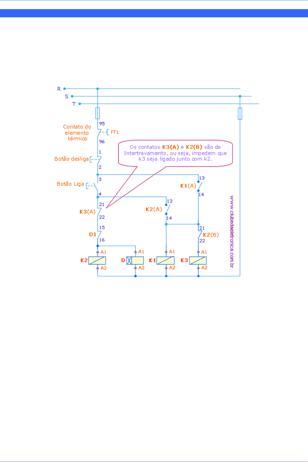 Clube da eletrônica Eletricidade Autor: Clodoaldo Silva – Partida estrela triângulo – Versão 05Mai2006 1 Atividade prática – Partida estrela triângulo A partida estrela triângulo, consiste na alimentação do motor com redução de tensão nas bobinas, durante a partida. Assim as bobinas do motor recebem somente 58% (1 ÷ √3) da tensão nominal e após a haverá comutação automática para triângulo e as bobinas passam a receber 100% da tensão nominal. Este tipo de chave proporciona uma redução da corrente de partida em aproximadamente 33% do seu valor de partida direta. O diagrama de comando A seqüência operacional A partida como, pode-se ver, é composta de três contatores comandados por botões. Na condição inicial de partida do motor (em estrela), K1, K2 e K3, estão desligados e a rede trifásica R, S, T, ou seja, há diferença de potencial (d.d.p) na rede. Pulsando-se o botão Liga ( S1 ) , a bobina do contator ( K2 ) e o relé temporizador ( D ) serão alimentados, fechando seu contato K2(A) e abrindo o contato K2(B). Assim os contatos principais dos contatores ( K2 ) e ( K1 ) serão fechados partindo o motor em estrela, note que também será fechado o contado auxiliar do contator K1(A). Neste momento K1 e K2 estão energizados. (Ligação Y) Decorrido o tempo pré-ajustado o temporizador ( D ) abre seu contado ( D1 ) retirando a energia de ( K2 ) abrindo seu contato K2(A) e fechando seu contato K2(B) energizando. Assim ( k3 ) que abre seu contato auxiliar K3(A) e fecha seus contatos principais. Os contatos principais do contatos ( K1 ) continuam energizados através do contado K1(A). Neste momento K1 e K3 estão energizados. (Ligação ∆) Clube da eletrônica Eletricidade Autor: Clodoaldo Silva – Partida estrela triângulo – Versão 05Mai2006 2 O motor em estrela e triângulo K1 e K2 - Bobinas ligadas em estrela K2 e k3 - Bobinas ligadas em triângulo O diagrama de força Uma vez montado e testado o diagrama de comando podemos ligar o motor. Atividades teóricas – Cálculos básicos sobre eletrotécnica 1- Qual a corrente drenada pelo motor trifásico? Clube da eletrônica Eletricidade Autor: Clodoaldo Silva – Partida estrela triângulo – Versão 05Mai2006 3 2- Um motor de trifásico possui os seguintes informes: Potência = 10 hp, cosϕ = 0,8 e η = 0,8. Pedem-se as potências aparente e reativa, drenada da rede. 3- Em uma rede trifásica 220 V são ligadas duas cargas trifásicas, puramente resistivas, sendo uma ligada em estrela e outra em triângulo. Pede-se a potência de linha para as duas conexões: (2,0 pontos) Potência para conexão estrela = Potência para conexão triângulo = 4- O circuito ao lado ilustra uma rede trifásica com tensão de linha (primário do transformador) de 15240 V passando por um transformador cuja relação de transformação é 60:1 e no secundário estão conectados duas cargas, puramente resistivas, equilibradas, sendo uma ligada em estrela e outra em triângulo. Pedem- se: As tensões de fase para as cargas ligadas em: Estrela= Triângulo= 5- Para o circuito abaixo calcule: VLP= VFP= VFS= VLS= VF (carga)= IF (carga)= ILS= IFS= IFP= ILP= Clube da eletrônica Eletricidade Autor: Clodoaldo Silva – Partida estrela triângulo – Versão 05Mai2006 4 Alguns testes úteis 6- Qual a velocidade síncrona de um motor de indução trifásico, 60Hz, 4 pólos, ligado em estrela? (A) 3600 RPM (B) 600 RPM (C) 1800 RPM (D) 1200 RPM (E) 900 RPM 7- Em uma rede trifásica 440V (tensão medida entre fases), teremos: (A) 440V entre fase e neutro (B) 220V entre fase e neutro (C) 127V entre fase e neutro (D) 254V entre fase e neutro (E) 760V entre fase e neutro 8- Quanto à proteção dos motores trifásicos, é correto dizer que: (A) Somente o relé térmico protege o motor, não havendo necessidade de fusíveis (B) O fusível de efeito rápido é suficiente para a proteção do motor (C) Somente os fusíveis protegem, sem a necessidade do relé térmico (D) Na proteção são necessários: os fusíveis de efeito rápido, contatores e o relé térmico (E) Na proteção são necessários: os fusíveis de efeito retardado e relé térmico 9- Um motor absorve da rede elétrica uma potência de 1k W e desenvolve uma potência de saída de 920 W. Qual rendimento desse motor? (A) 0,92 (B) 1,08 (C) 0,86 (D) 0,90 (E) 1,00 10- Qual das equações corresponde ao fator de potência? (A) S ÷ P (B) P ÷ S (C) Q ÷ S (D) S ÷ Q (E) Q ÷ P 11- Sobre as letras e os números encontrados nos esquemas elétricos não é correto afirmar que: (A) A1 e A2 servem para alimentação da bobina do contator (B) K representa a bobina do contator (C) 61 e 62 são contados normalmente fechados (D) D representa o temporizador (E) 53 e 54 são contatos normalmente fechados 12- Um motor de indução trifásico, 60Hz, 6 pólos desenvolve uma rotação de 1170 RPM. Qual o percentual de escorregamento desse motor? (A) 1,5% (B) 2,5% (C) 3,5% (D) 4,5% (E) 5,0% 13- Partindo um motor em estrela, haverá uma redução de corrente de aproximadamente: (A) 100% (B) 57,74% (C) 42,26% (D) 90% (E) 30% Gabarito: 1- I= 80,24A 2- S = 11651,56 VA Q = 6988,56 VAR 3- P = 2419,35W P = 6988,56W 4- V = 254 V V = 440V 5- VLP =11kV, VFP = 6,35kV, VFS = 127V, VLS = 127V, VFcarga = 73,33V, IFcarga = 0,73A, ILS = 0,73A, IFS = 0,42AIFP= 8,4mA e ILP= 8,4mA Testes 6- C 7 - D 8 - E 9 - A 10 – B 11 – E 12- B 13- C Não existe vento favorável para aquele que não sabe para onde vai. (Arthur Schopenhauer) Boa aula ... www.clubedaeletronica.com.br