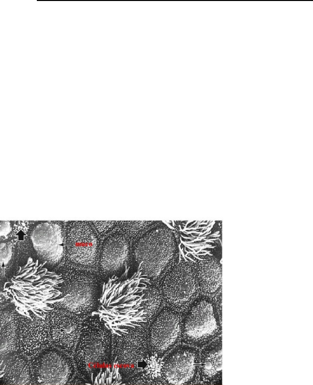SEMINÁRIO CARDIORESPIRATÓRIO No sistema cardiorrespiratório existem diversas células que compõem os tecidos do eptélio respiratório e apresentam diferentes funções gerais e específicas, dentre estás podemos observar o tipo de célula que será comentado se seguir : As células em escova. As “brush cells” (células em escova) ou também chamadas células serosas possuem uma grande quantidade de microvilos em sua área apical, esses microvilos possibilitam o aumento da região celular em contato com o ar. Em sua observação essa especificação é coberta pelos fios dos cilios das células ao redor Existem também dois grupos nas células em escova, são estes: Um que apresenta um perfil citológico de uma célula imatura, como uma provável reserva para a substituição de células ciliadas e caliciformes; Já no outro a célula funciona como um receptor sensorial e contém expansões dendríticas em sua base.