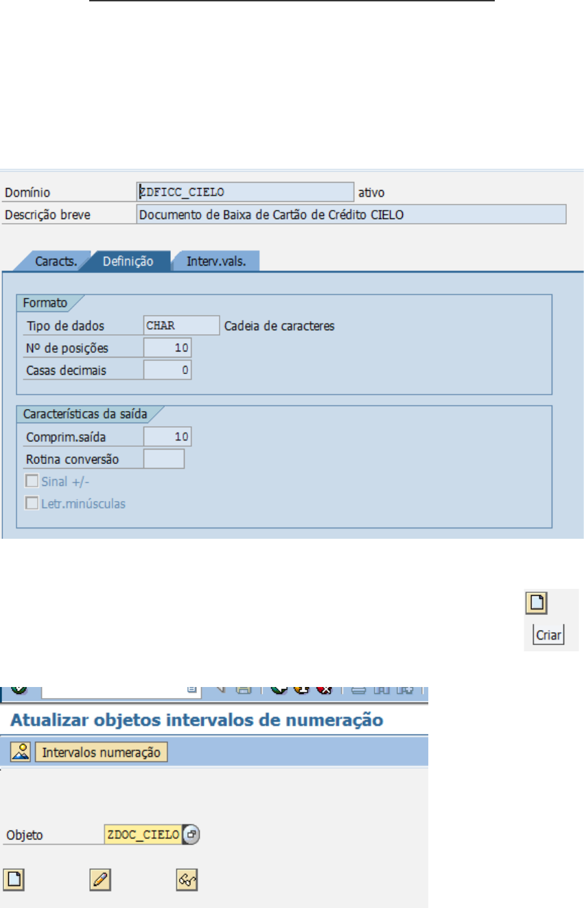 ABAP - Criação de Number Ranges - SNRO Um método muito útil para criar uma chave em uma tabela Z, é a criação de um NUMBER RANGE através da transação SNRO. Para isso você deve criar um dominio no dicionário de dados ABAP(SE11) que irá identificar o seu number range, exemplo: Com base no domínio criado (ZDFICC_CIELO), vamos para a transação SNRO. Na transação SNRO, digite um nome para o seu NUMBER RANGE e clique em criar. Na tela seguinte, vamos preencher os seguintes campos: E então clicamos em salvar. Após criar o number range, você deverá criar os intervalos em cada um dos ambientes que você for utilizar. Para realizar a chamada do seu number RANGE você deverá utilizar a função NUMBER_GET_NEXT. CALL FUNCTION 'NUMBER_GET_NEXT' EXPORTING nr_range_nr = '01' object = 'ZDOC_CIELO' IMPORTING number = p_doc_cielo EXCEPTIONS interval_not_found = 1 number_range_not_intern = 2 object_not_found = 3 quantity_is_0 = 4 quantity_is_not_1 = 5 interval_overflow = 6 buffer_overflow = 7 OTHERS = 8. Você pode acessar o seu NUMBER RANGE através da transação SE37, o resultado sairá no campo NUMBER.