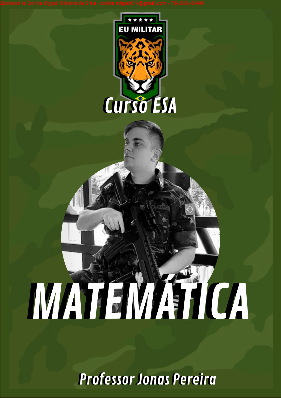 Função Exponencial SCRIÇÃO DE S[OLIDO S Função Exponencial Licensed to Carlos Miguel Oliveira da Silva - carlos.miguel614@gmail.com - 704.903.424-00 Todos os direitos reservados a EU MILITAR Nova Iguaçu-RJ suporte@eumilitar.com Curso ESA É proibida a reprodução total ou parcial do conteúdo desse material sem prévia autorização. Licensed to Carlos Miguel Oliveira da Silva - carlos.miguel614@gmail.com - 704.903.424-00 1. O valor de x na equação ( √3 9 ) 2𝑥−2 = 1 27 é: a) tal que 2 < 𝑥 < 3. b) negativo. c) tal que 0 < 𝑥 < 1. d) múltiplo de 2. e) 3. 2. Uma lagoa tem sofrido as consequências da poluição do ambiente e os pescadores reclamam, há muito tempo, da diminuição da quantidade de peixes. Após anos de denúncias, a prefeitura contratou, na última década, um pesquisador que vem acompanhando o desenvolvimento da vida aquática e da quantidade de peixes na lagoa. Após terminar suas experiências, ele concluiu que a quantidade n de peixes poderia ser calculada pela fórmula 𝑛(𝑡) = 10 000 − 3 𝑡 3 −2, sendo t o tempo, em anos, medido a partir desse exato momento. De acordo com esse pesquisador, o número de peixes será igual a 9 271 daqui a: a) 15 anos. b) 18 anos. c) 24 anos. d) 27 anos. e) 30 anos. 3. Qual a soma das raízes da equação 9𝑥 − 4. 3𝑥+1 + 27 = 0? a) -12 b) 12 c) 3 d) -3 e) NRA 4. O valor da soma das raízes da equação 22𝑥−2 − 17. 2𝑥−3 + 1 = 0 é: a) -2 b) -1 c) 0 d) 1 e) 2 5. Um botânico, após registrar o crescimento diário de uma planta, verifiou que o mesmo se dava de acordo com a função 𝑓(𝑡) = 0,7 + 0,04. 30,14𝑡, com t representando o número de dias contados a partir do primeiro registro e 𝑓(𝑡), a altura (em cm) da planta no dia t. nessas condições, é correto afirmar que o tempo necessário para que essa planta atinja a altura de 88,18 centímetros é: a) 30 dias b) 40 dias c) 46 dias d) 50 dias e) 55 dias EU MILITAR . CURSO ESA MATEMÁTICA PROFESSOR JONAS PEREIRA 1 Licensed to Carlos Miguel Oliveira da Silva - carlos.miguel614@gmail.com - 704.903.424-00 6. Se 5𝑥+2 = 100 , então 52𝑥 é igual a a) 4 b) 8 c) 10 d) 16 e) 100. 7. O conjunto solução da equação exponencial 4𝑥 − 2𝑥 = 56 é a) {− 7,8} b) {3,8} c) {3} d) {2,3} e) {8} 8. O conjunto solução da inequação22𝑥+1 < 5 4 . 2𝑥+2 − 2 é a)S = {x ∈ IR| − 1 2 < x < 2} b) S = {x ∈ IR| − 1 < x < 1} c) S = {x ∈ IR| 0 < x < 1} d) S = {x ∈ IR|1 < x} 9. A desigualdade ( 1 2 )3𝑥−5 > ( 1 4 )𝑥 tem como conjunto solução a)𝑆 = {𝑥 𝑅 | 𝑥 1} b)𝑆 = {𝑥 𝑅 | 𝑥 5} c)𝑆 = {𝑥 𝑅 | 𝑥 5} d) 𝑆 = {𝑥 𝑅 | 1 < 𝑥 < 5 } 10. A raiz real da equação 25√𝑥 − 24.5√𝑥 = 25 é um número múltiplo de a) 7 b) 5 c) 3 d) 2 11. O conjunto verdade da inequação ( 1 2 ) 𝑥2−𝑥 a) {𝑥 𝑅 | 𝑥 < 0 𝑜𝑢 𝑥 > 1} b) {𝑥 𝑅 | − 1 ≤ 𝑥 ≤ 1} c) {𝑥 𝑅 | 𝑥 ≤ 0} d) {𝑥 𝑅 | 0 < 𝑥 ≤ 1} e) R EU MILITAR . CURSO ESA MATEMÁTICA PROFESSOR JONAS PEREIRA 1 Licensed to Carlos Miguel Oliveira da Silva - carlos.miguel614@gmail.com - 704.903.424-00 12. Os gráficos de 𝑓(𝑥) = 𝑎𝑥 e 𝑔(𝑥) = 𝑥2 – 1 se intersectam em um ponto de abscissa 3. O valor de a é: a) 2 b) 3 c) 4 d) 8 e) 9 13. A solução da equação 0,52x = 0,251-x é um número x, tal que: a) 0 < x < 1 b) 1 < x < 2 c) 2 < x < 3 d) x > 3 e) x < 0 14. A soma dos valores de x que resolvem a equação 4𝑥−2 − 2𝑥 2−4𝑥+2 = 0 a) 6 b) 4 c) 0 d) 3 e) 2 15. A soma e o produto das raízes da equação (2𝑥+6)𝑥 2−6𝑥+5 = 1, são respectivamente: a) -5 e 6 b) 11 e 30 c) 0 e -30 d) 0 e -6 e) -11 e 0 16. O domínio da função f(x) = 1 √3(−𝑥−2) − 1 9 é: a) 𝑅− ∗ b) 𝑅− c) 𝑅+ d) 𝑅+ ∗ e) 𝑅 17. A quantidade de números inteiros ímpares que pertencem ao intervalo que satisfaz a inequação exponencial ( 1 2 ) 𝑥2−8𝑥+5 > 4 é de a) um número ímpar. b) dois números ímpares. c) três números ímpares. d) quatro números ímpares. e) cinco números ímpares. EU MILITAR . CURSO ESA MATEMÁTICA PROFESSOR JONAS PEREIRA 1 Licensed to Carlos Miguel Oliveira da Silva - carlos.miguel614@gmail.com - 704.903.424-00 18. A inequação 10𝑥 + 10𝑥+1 + 10𝑥+2 + 10𝑥+3 + 10𝑥+4 < 11111, e que 𝑥 é um número real, a) não tem solução b) tem apenas soluções positivas d) tem apenas solução negativas e) tem soluções positivas e negativas 19. A soma das soluções reais de 𝑥𝑥 2+2𝑥−8 = 1é a) -2 b) -1 c) 0 d) 1 e) 2 20. Os valores de x para os quais (0,8)4𝑥 2−𝑥 > (0,8)3(𝑥+1) são a) − 3 2 < 𝑥 < 1 2 b) − 1 2 < 𝑥 < 3 2 c) 𝑥 < − 3 2 ou 𝑥 > 1 2 d) 𝑥 < − 1 2 ou 𝑥 > 3 2 e) 𝑥 ≥ 1 21. Se 8𝑥−9 = 16 𝑥 2, então “𝑥” é um número múltiplo de a) 2 b) 3 c) 5 d) 6 e) 7 22. solução da equação 3 + 31,5𝑥0,5 = √48𝑥 é a) 3−1. b) 3− 1 2. c) 3 1 2. d) 3. e) 2. 23. A soma das raízes da equação 32−𝑥 + 31+𝑥 = 28 é a) 1 b) 2 c) 3 d) 4 e) 5 EU MILITAR . CURSO ESA MATEMÁTICA PROFESSOR JONAS PEREIRA 1 Licensed to Carlos Miguel Oliveira da Silva - carlos.miguel614@gmail.com - 704.903.424-00 24. O conjunto solução da inequação ( 1 5 ) 𝑥(𝑥−2) − ( 1 5 ) 2𝑥−4 ≥ 0 no conjunto dos reais. a) 𝑆 = {1,2,3} b)𝑆 = {2} c) 𝑆 = {−2,2} d) 𝑆 = {1,3} e) 𝑆 = {3} 25. O conjunto-solução da inequação (0,5)x(x - 2) < (0,25)x - 1,5 é a) {x∈ R | x <1}. b) {x∈ R | x >3}. c) {x∈ R | 1 < x <3}. d) {x∈ R |x < 1 ou x > 3}. 26. Sendo x e y reais, o valor de 𝑥 + 𝑦 no sistema { 2𝑥 = 4𝑦 25𝑥 = 25. 5𝑦 , é: a) 4 3 b) 2 3 c) 1 3 d) 1 e) 2 27. Devido a desintegração radioativa, uma massa 𝑚0 de carbono 14 é reduzida a uma massa m em t anos. As duas massas estão relacionadas pela fórmula 𝑚 = 𝑚0. 2 − 𝑡 5400. Nestas condições, quantos anos 5 g da substância serão reduzidas a 1,25 g? a)10 00