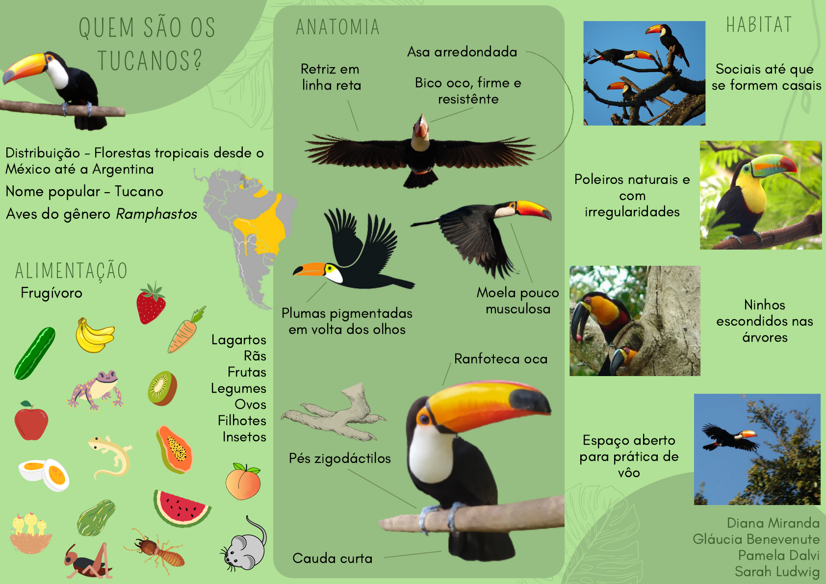 Lagartos Rãs Frutas Legumes Ovos Filhotes Insetos Q U E M S Ã O O S T U C A N O S ? Distribuição - Florestas tropicais desde o México até a Argentina Bico oco, firme e resistênte A N A T O M I A Frugívoro A L I M E N T A Ç Ã O Retriz em linha reta Moela pouco musculosa Asa arredondada Plumas pigmentadas em volta dos olhos Pés zigodáctilos Cauda curta Ranfoteca oca H A B I T A T Sociais até que se formem casais Poleiros naturais e com irregularidades Ninhos escondidos nas árvores Espaço aberto para prática de vôo Diana Miranda Gláucia Benevenute Pamela Dalvi Sarah Ludwig Nome popular - Tucano Aves do gênero Ramphastos