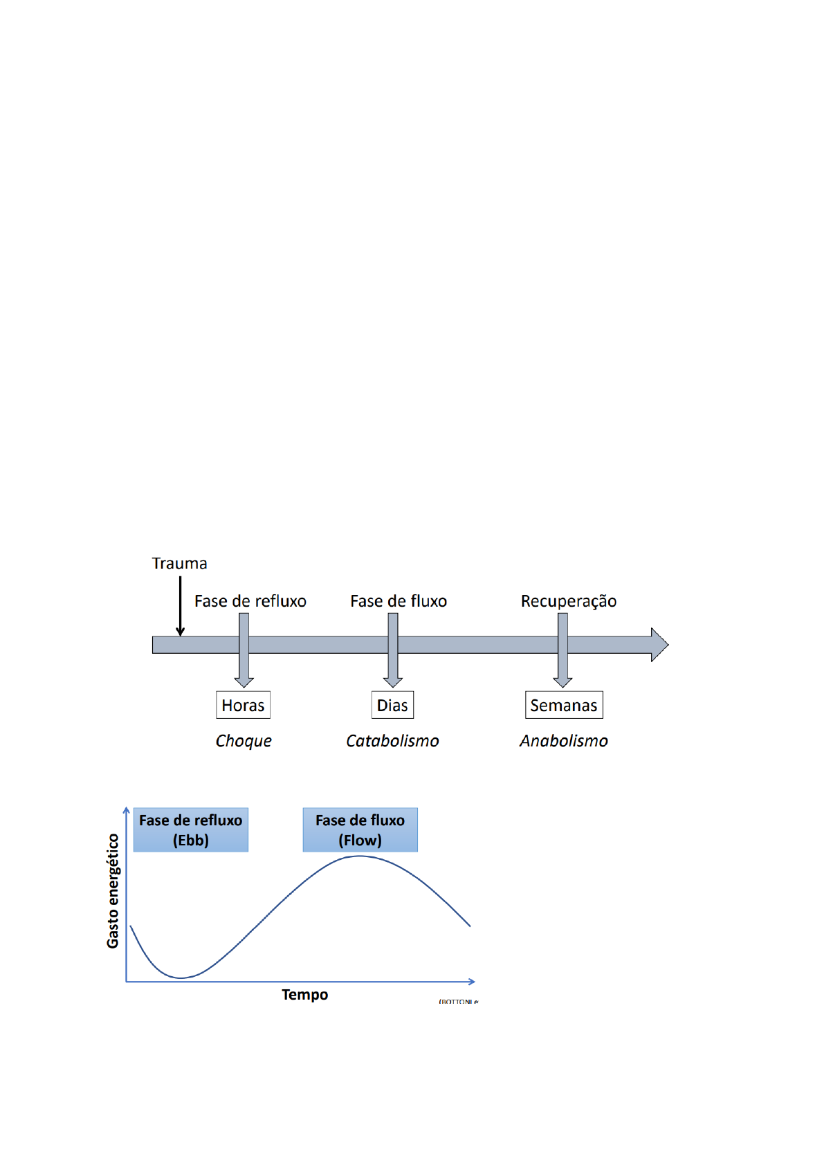 resumo feito por: Giulia Akemi Sadoyama @giusadoyama PACIENTE CRÍTICO trauma - evento agudo que altera a homeostase do organismo, desencadeando uma complexa resposta neuroendócrina e imunobiológica, cujos efeitos metabólicos e cardiorrespiratórios tendem a preservar algumas funções vitais • é a capacidade do organismo de apresentar uma situação físico-química característica e constante, dentro de determinados limites, mesmo diante de alterações impostas pelo meio ambiente (respiração, temperatura, pressão arterial, frequência cardíaca, etc). • passamos por diversas mudanças ambientais e o nosso corpo possui mecanismos internos que mantém as características dentro de um padrão estável, e é isso o corpo tenta fazer durante um trauma, para a sobrevivência SITUAÇÕES CLÍNICAS QUE CARACTERIZAM O TRAUMA - politrauma - intervenções cirúrgicas - sepse - queimaduras - hemorragia - pancreatite aguda grave - acidentes (veículos, tiros, feridas por facas, quedas) PARÂMETROS a) volemia (volume sanguíneo) b) débito cardíaco c) oxigenação tecidual d) oferta e utilização de substratos energético FASES DA RESPOSTA AO TRAUMA - resposta metabólica ao stress é dividida em duas fases: Refluxo (Ebb) e Fluxo (Flow) - há uma fase de refluxo, onde há um choque (hipovolêmico), ou seja, uma perda de volemia, seja por uma hemorragia ou inflamação exacerbada decorrente do trauma severo, que promove uma vasodilatação ou edema (fuga de água/líquido) para o espaço intersticial, saindo do espaço intravascular para os tecidos. portanto, há poucos nutrientes e oxigênio no vaso sanguíneo, levando à falência múltipla de órgãos. - nos primeiros dias há a fase de fluxo, uma fase de catabolismo, ou seja, o corpo tenta utilizar o máximo de energia possível para produzir proteínas e células que respondem ao trauma, para promover reparação tecidual. caso o paciente passe por resumo feito por: Giulia Akemi Sadoyama @giusadoyama esta fase sem transtornos, ele vai para uma fase de recuperação (fase de anabolismo), investindo na recuperação nutricional. - na fase de catabolismo é importante a resposta ao trauma, não pode investir em muitos nutrientes para promover metabolismo de vários nutrientes, somente na fase de recuperação para o paciente ter uma melhor resposta. - na fase inicial o gasto energético (fase de refluxo - ebb) cai e depois sobe (fase de fluxo - flow) • fase ebb - fase pré-reanimação - resposta inicial ao evento traumático - instabilidade hemodinâmica - extremidades frias e hipotermia - diminuição das NE - hipometabolismo • fase flow - fase de recuperação - estabilidade hemodinâmica - cicatrização de lesões e convalescença - aumento da TMB - aumento da temperatura corpórea - hipermetabolismo JEJUM alterações metabólicas • preservação da massa corporal • conservação da oferta de energia para as células • preservação do volume circulatório. processo de adaptação • reduz o consumo basal de oxigênio • diminui a síntese proteica e as perdas de nitrogênio • aumenta a excreção urinária de corpos cetônicos alterações metabólicas no jejum prolongado • maior utilização de lipídios • maior eficiência da gliconeogênese a partir do glicerol e do lactato, com redução da gliconeogênese a partir dos aminoácidos • redução da utilização da glicose pelo SNC que começa a usar corpos cetônicos alterações metabólicas no jejum - alterações adaptativas fisiológicas - como no jejum há um processo fisiológico, há uma mudança na produção de hormônios, catecolaminas, substâncias e componentes que contribuem para o processo adaptativo. aumenta a produção então de glicocorticóides (glucagon) e redução de insulina. com isso, o glucagon atua no fígado, promovendo processo de glicogenólise, glicólise, resumo feito por: Giulia Akemi Sadoyama @giusadoyama gliconeogênese, e a glicose ‘’alimenta’’ células dependentes (hemácias, leucócitos, neurônios, etc), mantendo homeostase. com o passar do tempo, a glicose não é mais suficiente para as demandas internas, então inicia-se o processo de glicólise anaeróbica, que tem o produto final o lactato, e o lactato retorna para o fígado para haver a gliconeogênese, com isso, o indivíduo consegue manter a homeostase, porém, esse processo já é catabólico, porém pequeno. nos adipócitos, o glucagon também age sobre eles, estimulando a lipólise (AG livres para corrente sanguínea), e os AG são transformados em cetonas, para ‘’alimentar’’ os tecidos que podem receber esses corpos cetônicos como fonte de energia (ex: cérebro). em uma situação de jejum mais prolongada, os aminoácidos, como alanina e glutamina, podem ser utilizados também para a gliconeogênese, para haver formação de glicose. ciclo de cori - o ciclo de Cori consiste na conversão de glicose em lactato em tecidos musculares, durante um período de privação de oxigênio, seguido da conversão de lactato em glicose no fígado. em um jejum prolongado e doenças/traumas, essa conversão vem de uma fermentação láctica e o saldo de ATP acaba sendo negativo, levando a uma perda de massa muscular. - esse ciclo pode acontecer tanto em uma situação fisiológica quanto no câncer, por exemplo. TRAUMA - características gerais: • ativação de uma resposta cardiocirculatória do tipo hiperdinâmica, dependente da resposta neuroendócrina. lesões internas são detectadas pelo SNC e disparam informações para órgãos produzirem hormônios e outros componentes necessários para ativar a resposta ao trauma. • aumento do gasto energético e do consumo de oxigênio (catabolismo) • complexa alteração do metabolismo proteico, que, ao contrário do jejum, é marcada não apenas pela proteólise no músculo esquelético, mas também por aumento da síntese protéica visceral, priorizando as proteínas de defesa (proteína de fase aguda 