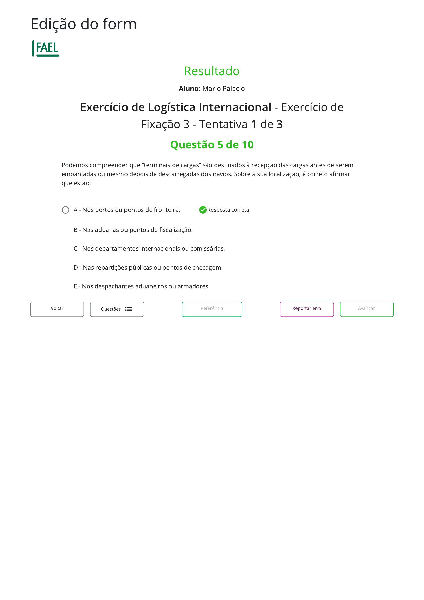 20/05/2022 11:10 Firequiz https://firequiz.fael.edu.br/prova?question_number=5 1/1 Edição do form Resultado Aluno: Mario Palacio Exercício de Logística Internacional - Exercício de Fixação 3 - Tentativa 1 de 3 Questão 5 de 10 Podemos compreender que “terminais de cargas” são destinados à recepção das cargas antes de serem embarcadas ou mesmo depois de descarregadas dos navios. Sobre a sua localização, é correto a�rmar que estão: A - Nos portos ou pontos de fronteira. Resposta correta B - Nas aduanas ou pontos de �scalização. C - Nos departamentos internacionais ou comissárias. D - Nas repartições públicas ou pontos de checagem. E - Nos despachantes aduaneiros ou armadores. Voltar Questões Referência Reportar erro Avançar https://firequiz.fael.edu.br/prova?question_number=4 https://firequiz.fael.edu.br/prova/questoes