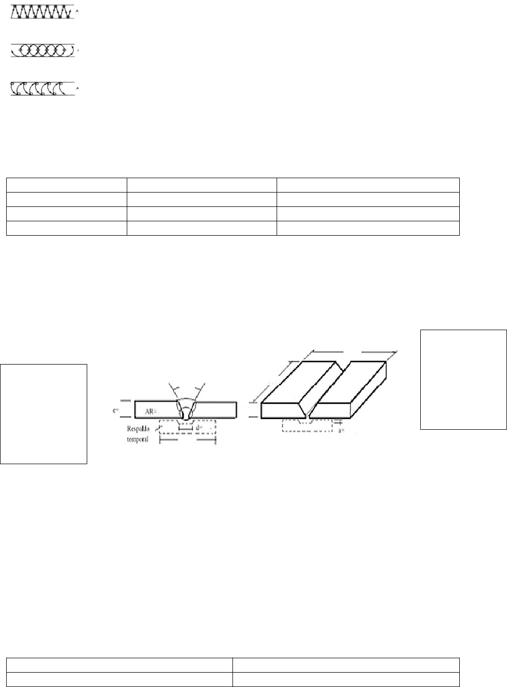 c) semicircular a) Zigzag b) circular - El movimiento circula y semicircular se aplica para presentación, soldadura horizontal y el movimiento de zigzag para relleno. tipos de electrodos. ELECTRODO AMPERAJE POLARIDAD E 6011 (d=3,25) 80-130 AMP CA , CC + E 7018 (d=3,25) 100-150 AMP CA E 6013(d=3,25) 80-120 AMP CA, CC - homologación de soldadores. Consiste en preparar al soldador para que sea capaz de producir uniones soldadas de calidad quiere decir cordones de soldadura resistentes al esfuerzo que se someterán. homologación 1G. e=6mm largo =300 ancho=300 a= 2mm e=6mm AR= 3mm Ángulo= 60º d=12.7 factores influyen en la calidad de las uniones soldadas: a) Los materiales de construcción b) Procedimiento de soldadura c) Diseño de unión soldada d) La manera de aplicación de soldadura y el programa de inspección proceso de evaluación de homologación A) PLANO / 1F B) HORIZONTAL /2F C) VERTICAL / 3F D) SOBRECABEZA / 4F ensayos destrucctivos y no destructivos para uniones soldadas. ENSAYOS DESTRUCTIVOS ENSAYOS NO DESTRUCTIVOS Doblado guiado Inspección visual Rotura Nick Radiográfica Tensión Ultrasonido Rotura filete Partículas magnéticas tipos de defectos y discontinuadas se presentan en una unión soldada. a) Fisura b) Fusión incompleta c)Penetración incompleta d) inclusión solida e) inclusiones gaciosas F) Discontinuidades de forma causas de una fusión incompleta. -Velocidad de avance incorrecta -Manipulación incompleta del electrodo esto relacionado al soldador u operario la polaridad directa en la soldadura por arco con corriente continua -POLARIDAD DIRECTA O NORMAL: Cuando el cable del porta electrodo es conectado al polo negativo de la máquina de soldar y el cable de tierra al polo positivo. Su efecto es que su penetración es poco profunda E 6012: Es un electrodo de la clasificación AWS , tiene tipo de revestimiento Rutílico Sódico, tiene polaridad CA, CC y electrodo positivo. Su posición a soldar Plana, Vertical, Sobrecabeza y horizontal. funciones que cumplen los electrodos revestidos. a) Protección de metal fundido a través de la generación de gases b) Provee desoxidantes c) Facilita el inicio del arco y su estabilidad d) Determina la forma del cordón y su penetración , establece la posición de soldadura elementos en el proceso de soldadura por arco eléctrico. POLARIDAD INVERTIDAElectrodo Lead Negativo Positivo Conexión a pieza de trabajo Electrodo Porta electrodo