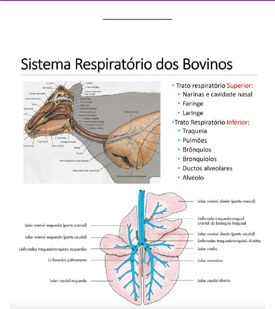 Principais afecções do Sistema respiratório de ruminantes São as afecções que mais acometem os bovinos Mecanismo de defesa: · O sistema respiratório é composto por células ciliadas e células produtoras de muco · Células ciliadas e células caliciformes (formadoras de muco + secretoras de imunoglobulinas) · Físico: aparelho mucociliar impede a entrada de partículas grandes nas unidades pulmonares · Secretórios: muco e substancias solúveis (iga e igg, peroxidase, lisozima, etc) · Atividade imune sobre o epitélio de todo o trato respiratório · Celulares: macrófagos alveolares pulmonares (MAPS) Particularidades dos bovinos: · Vias aéreas estreitas · Caixa torácica muito rígida · Pequeno volume pulmonar · Baixos níveis de lisozima · Menor quantidade de macrófagos alveolares · Ou seja: · Menor capacidade de troca gasosa e baixa tensão de oxigênio bronquiolar ou alveolar · Baixa atividade fagocitaria dos macrófagos mucociliares e alveolares · Redução do processo de depuração pulmonar Maior predisposição ao desenvolvimento de enfermidades respiratórias Complexo da doença respiratória bovina: · Principal doença que acomete os bovinos · Definição: conjunto de doenças que pode acometer tanto o trato respiratório superior, assim como doenças do trato respiratório inferior · Trato respiratório superior: · Sinusites: inflamação dos seios nasais · Faringites: inflamação da faringe · Laringites: inflamação da laringe · Trato respiratório inferior: · Pneumonias · Broncopneumonias Doença também muito associada ao estresse como estresse por transportes Fatores de risco/predisposições: · Predisposição: após nascimento, animal ingere colostro e essa imunidade passiva tem um tempo de duração, após esse tempo o animal tem uma janela entre imunidade passiva e desenvolvimento de imunidade ativa, nessa janela de tempo o animal é mais predisposto a desenvolver doenças como essa · Falha de transferência de imunidade passiva: colostro de baixa qualidade e/ou falta da ingestão de colostro, dificuldades na hora do parto · Baixa vitalidade do neonato: · Asfixia neonatal: animal com asfixia durante o parto podem ter dificuldades para ingerir colostro · Prematuridade: sistemas não desenvolvidos corretamente/totalmente, dificuldade de ingerir colostro · Doenças concomitantes, como: · Diarreia · Onfalite · Tristezas parasitarias · Podem predispor também o desenvolvimento de doenças respiratórias · Condições ambientais: · Temperatura (tanto fria quanto quente e trocas bruscas de temperatura) · Umidade · Ausência de renovação do ar · Superlotação · Bezerros de diferentes faixas etárias · Higiene do local (ideal é limpeza e lavagem diária do bezerreiro e troca da cama) · Poeira · Deficiências nutricionais: · Vitaminas A e E · Microminerais: selênio, cobre e zinco · Manejo da fazenda: qualquer manejo estressante vai ser um fator de risco · Castração · Descorna · mochação · Desmame: desmame abrupto pode ser estressante · Inclusive, nessa época é muito comum o aparecimento desse complexo, aumento de cortisol e queda da imunidade · Transporte: · Transporte prolongado · Superlotação do caminhão · Confinamento: · Superlotação · Animais de diferentes origens · Condições ambientais Etiologia · Vírus sincicial respiratório bovino é o mais frequente · Mannheimia haemolytica principal bacteria · Devido ao conjunto de infecção viral + fatores de risco como fatores estressantes temos uma queda de imunidade + vírus circulando na corrente sanguínea. O vírus chega as veias e artérias pulmonares e então infecta o pulmão comprometendo assim os mecanismos de defesa como destruindo células mucoliticas e células ciliares, dificultando assim a defesa natural do organismo · Após esse comprometimento dos mecanismos de defesa podemos ter uma infecção bacteriana secundaria, normalmente essas bactérias são as presentes no próprio organismo do animal mas que por falta de sua regulação principalmente pelo comprometimento do sistema imune, elas acabam aumentando muito seu número causando problemas e ocasionando casos mais graves como de pneumonia Produção de exsudato seroso nos alvéolos que leva a infiltração de macrófagos e neutrófilos ocasionando um exsudato purulento nos brônquios Em casos mais graves esse exsudato pode se organizar e formar abcessos nos pulmões Pode acontecer de não vermos a secreção nasal pois antes disso o animal pode acabar deglutindo-a · Dispneia: dificuldade respiratória, podemos ter 2 tipos, a expiratória (normalmente associadas a processos pulmonares) e a inspiratória (normalmente associados a processos de sistema respiratório superior) · Mista: tanto inspiratória quanto expiratória · Tosse: · Produtiva: que elimina secreção · Não produtiva: não elimina secreção, tosse seca · Crepitação: barulho devido a presença de exsudato que na hora da respiração da um barulho de bolha e vibra o sistema respiratório · Crepitação grossa: associada a presença de secreção nas vias aéreas maiores como brônquios · Fina: associada a presença de secreção nas vias mais estreitas como bronquíolos · Silencio auscutariorio: casos mais graves de pneuminias · Anamnese: fornecida pelo proprietário e normalmente apresenta: · Tosse · Letargia · Falta de apetite · Emagrecimento · Relutância no exercício · Histórico da população não só de um animal · Score para avaliação da doença pulmonar: · Abaixo de 4: não precisa de tratamento, está bem · Acima de 4: animal doente, requer atenção · No brasil pode haver diferenças, esse score foi feito nos EUA, então não 100% validado para o brasil, pode ser necessária uma daptação Não são exames comuns/de rotina · Mais utilizados são: · Penicilina pocaina · Ceftiofur · Oxitetraciclina · Tilosina e tilmicosina utilizado mais em casos graves · Feito de 5 a 7 