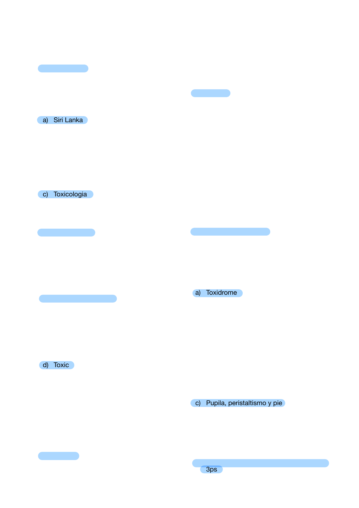 Toxicologia- Resumen EP1 1- La frase “Hay algo que no sea veneno?” fue dicha por quien? a) Siri Lanka b) Paracelso c) Jeyaratham d) Pasteur 2- La frase “No hay sustancias inocuas, solo hay formas inofensivas de manejarlas” fue dicha por quien? a) Siri Lanka b) Paracelso c) Hipocrates d) Pasteur 3- La ciencia que estudia los efectos nocivos producidos por las sustancias químicas sobre los organismos vivos. a) Xenobioticos b) Toxina c) Toxicologia d) Toxico 4- Cualquier sustancia externa que incorpora al organismo: a) Xenobioticos b) Toxina c) Toxicologia d) Toxico 5- Son ejemplos de xenobioticos: a) Farmacos b) Plaguicidas c) Cosméticos, Tabaco y pintura d) Todas las anteriores 6- Sustancia artificial o natural que incorporada al organismo es capaz de producir a l terac iones orgánicas o funcionales, incluso la muerte: a) Xenobioticos b) Toxina c) Toxicologia d) Toxico 7- Cuales son los factores que influyen en la toxicidad? Sus propias características quimicas, la dosis aplicada y las características del organismo que entra en contacto. 8- Es la denominación dada a las moléculas proteicas de origen natural que pueden provocar efectos tóxicos graves: a) Xenobioticos b) Toxina c) Toxicologia d) Toxico 9- Sustancia que en dosis relativamente pequeñas ejerce una acción al ser ingerido, inyectado, inhalado, absorbido o aplicado a un organismo vivo, que destruye la vida o deteriora seriamente la función de uno o más órganos o tejidos: a) Veneno b) Toxina c) Toxicologia d) Toxico 10- Que es la dosis letal 50? Es el primer experimento con una nueva sustancia química. La DL50 es la dosis de una sustancia química necesaria para causar la muerte en el 50% de los animales en experimentación. 11- Cuando debemos sospechar de intoxicación? a) Compromiso multisistémico b) Cuadro clínico de inicio súbito c) Cuadro gastrointestinales graves d) Inconsciencia sin causa aparente e) Convulsiones de origen desconocido f) Todas las anteriores 12- Se refiere a la descripción por grupos de los síntomas y signos clínicos propios de ciertos tóxicos que comparten un mecanismo de acción igual o similar, en combinación con el comportamiento de los signos vitales: a) Toxidromes b) Anamneses c) Toxicologia d) Toxico 13- Cite los signos vitales y sus valores normales: - Frecuencia cardiaca: 60-100 Ipm. - Presión arterial: 120-80 mmHg. - Frecuencia respiratoria: 12-18 rpm. - Temperatura 36.5- 37.2ºC. 14- Cual es lo significado de 3P? a) Pulso, presión arterial y pupila b) Presión arterial, peristaltismo y piel c) Pupila, peristaltismo y piel d) Pelo, piel y pupila 15- Cuales son los principales puntos a consignar? a) Signos vitales, raio x, hemograma b) Hemograma, hepatograma, orina c) Signos vitales, hemograma, las 3ps d) Signos vitales, electrocardiograma, las 3ps 16- Cocaína, anfetaminas, alcaloides del ergot causan: a) Sindrome anticolinergico b) Sindrome adrenergico c) Sindrome colinergico d) Sindrome por opiáceos 1 7 - E s c o p o l a m i n a , a t r o p i n a , a n t i h i s t a m í n i c o s , a n t i d e p re s i v o s , fenotiazinas causan: a) Sindrome anticolinergico b) Sindrome adrenergico c) Sindrome colinergico d) Sindrome por opiáceos 18- Organofosforados y carbamatos, fisostigmina causan: a) Sindrome anticolinergico b) Sindrome adrenergico c) Sindrome colinergico d) Sindrome por opiáceos 19- Morfina y sus congéneres causa: a) Sindrome anticolinergico b) Síndrome serotoninérgico c) Síndrome por sedantes hipnóticos o alcohol d) Sindrome por opiáceos 20- Moclobemida, Fluoxetina causan: a) Sindrome anticolinergico b) Síndrome serotoninérgico c) Síndrome por sedantes hipnóticos o alcohol d) Sindrome por opiáceos 21- Benzodiazepinas, barbitúricos, etanol causan: a) Sindrome anticolinergico b) Síndrome serotoninérgico c) Síndrome por sedantes hipnóticos o alcohol d) Sindrome por opiáceos 2 2 - P a c i e n t e p re s e n t a a g i t a c i ó n , t a q u i c a rd i a y r u b o r. S u s p u p i l a s midrioticas, peristaltismo aumentado y sudor. Todos los signos vitales elevados. Son características de cual sindrome? a) Sindrome anticolinergico b) Sindrome adrenergico c) Sindrome colinergico d) Sindrome por opiáceos 2 3 - P a c i e n t e p re s e n t a a g i t a c i ó n , t a q u i c a rd i a y r u b o r. S u s p u p i l a s midrioticas, peristaltismo disminuido y sin sudor. Todos los signos vitales elevados. Son características de cual sindrome? a) Sindrome anticolinergico b) Sindrome adrenergico c) Sindrome colinergico d) Sindrome por opiáceos 2 4 - P a c i e n t e p re s e n t a a g i t a c i ó n , taquicardia y rubor. Sus pupilas mioticas, peristaltismo aumentado y sudor. Todos los s i g n o s v i t a l e s e l e v a d o s . S o n características de cual sindrome? a) Sindrome anticolinergico b) Síndrome serotoninérgico c) Síndrome por sedantes hipnóticos o alcohol d) Sindrome por opiáceos 25- Paciente presenta depresión, arritmia y palidez. Sus pupilas mioticas, peristaltismo disminuido y sin sudor. Todos los signos vitales rebajados. Son características de cual sindrome? a) Sindrome anticolinergico b) Síndrome serotoninérgico c) Síndrome por sedantes hipnóticos o alcohol d) Sindrome por opiáceos 26- Paciente presenta depresión, fibrilación auricular, arritmia ventricular y palidez. Sus pupilas mioticas, peristaltismo disminuido y sudor. Todos los signos vitales rebajados. Son características de cual sindrome? a) Sindrome anticolinergico b) Síndrome serotoninérgico c) Síndrome por sedantes hipnóticos o alcohol d) Sindrome por opiáceos 27- Pac ien te p resenta depres ión , braquicardia y palidez. Sus pupilas mioticas, peristaltismo aumentado y sudor. Todos los signos vitales rebajados, excepto la frecuencia respiratoria que esta aumentada. Son características de cual sindrome? a) Sindrome anticolinergico b) Sindrome adrenergico c) Sindrome colinergico d) Sindrome por opiáceos ÷ í 28- Complete o cuadro sobre las síndromes: