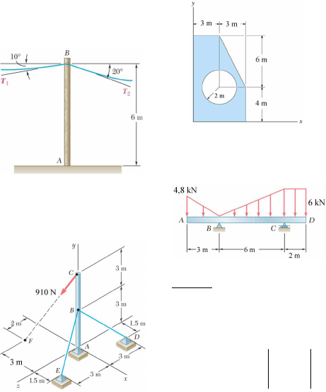 UNIVERSIDADE DO EXTREMO SUL CATARINENSE Curso de Engenharia Civil - Disciplina: Mecânica Geral 1 Professor: Bruno do Vale Silva Nome: ____________________________________________________________________________ 1 - Um poste de telefone de 6 m com peso de 1600 N é usado para manter as extremidades de dois fios suspensas. Os fios formam com a horizontal os ângulos mostrados na figura, e as trações nos fios são, respectivamente, T1=1000 N e T2=1500 N. Determine a reação na extremidade fixa A. 2 - No poste ABC de 6 m, atua uma força de 910 N, tal como mostra a figura. O poste é sustentado por uma rótula em A e por dois cabos BD e BE. Determine a tração e cabo e a reação em A. UNIVERSIDADE DO EXTREMO SUL CATARINENSE-UNESC Mecânica Geral 1 - 2ª Avaliação _____________________________________________________________________ m com peso de N é usado para manter as extremidades de dois fios suspensas. Os fios formam com a horizontal os ângulos mostrados na figura, e as trações nos fios são, respectivamente, N. Determine a reação m, atua uma força de N, tal como mostra a figura. O poste é uma rótula em A e por dois etermine a tração em cada 3 - Determine o centróide area plana a seguir. 4 - Determine: (a) a intensidade da carga distribuída; (b) as reações de da viga em B e C. Formulário: iFF yixrFrM x O rr rrrrr += +=×= , λ rr FF = kMjMiMM zyxO rrrr ++= ( ) ( xFzFizFyF xyz r −+−= 1 _____________________________________________________________________ Data:05/06/2014 centróide nos eixos x e y da Determine: (a) a intensidade da resultante b) as reações de apoio kFjF kzjy zy rr rr ++ + k r zyx FFF zyx kji rrr = ) ( )kyFxFjxF xyz rr −+