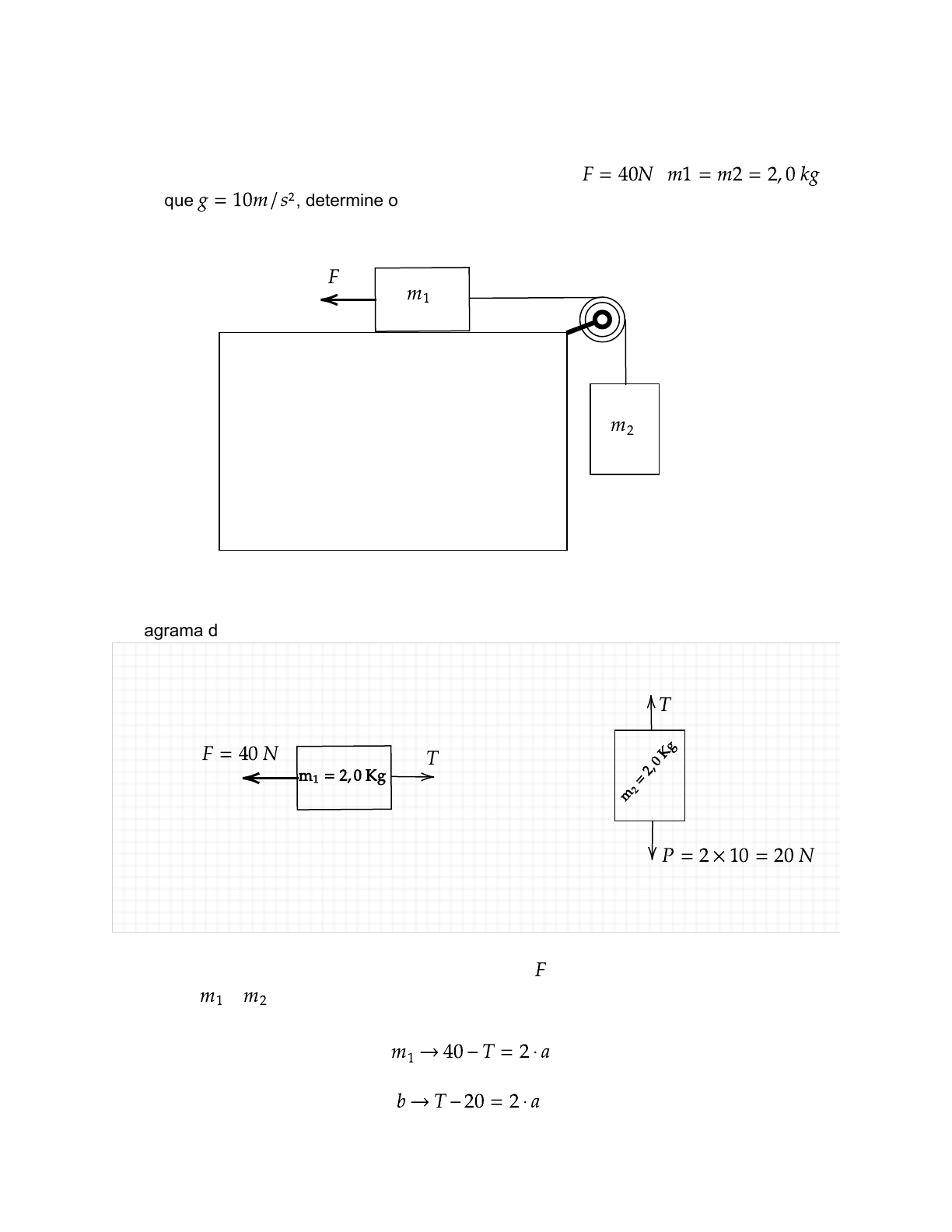 Tiago Lima - Instagram: @professor_disciplinas_exatas / WhatsAPP: (71) 9927-17449 • Na montagem dos blocos abaixo, sabendo-se que , e F = 40N m1 = m2 = 2, 0 kg que , determine o valor da tração no fio. (despreze qualquer atrito)g = 10m / s² Resolução: O diagrama de corpo livre dos blocos é; Considerando que o sistema se move na direção de , as equações das forças resultantes F nos blocos e são:m 1 m2 m 40-T = 2 ⋅ a 1 → b T - 20 = 2 ⋅ a → m1 m2 F m = 2,0 Kg1 F = 40 N T m = 2, 0 K g 2 T P = 2 × 10 = 20 N Somando as 2 expressões, temos que; Agora, temos uma expressão com apenas 1 variável, resolvendo; 40- 20 = 4a 4a = 20 a = a = 5 m / s→ → 20 4 → 2 Substituindo em qualquer uma das equações, temos como encontrar a tenção ;T 40-T = 4 ⋅ 5 -T = 2 ⋅ 5- 40 -T = 10- 40 -T = - 30 ⋅ -11 → → 1 → ( 1 ) ( ) T = 30 N1 40-T = 2 ⋅ a T - 20 = 2 ⋅ a 40- 20 = 4a (Resposta )
