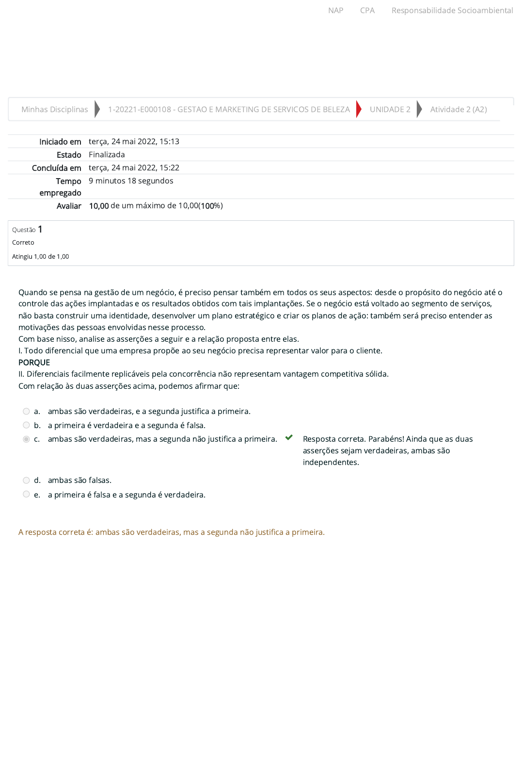 Minhas Disciplinas 1-20221-E000108 - GESTAO E MARKETING DE SERVICOS DE BELEZA UNIDADE 2 Atividade 2 (A2) Iniciado em terça, 24 mai 2022, 15:13 Estado Finalizada Concluída em terça, 24 mai 2022, 15:22 Tempo empregado 9 minutos 18 segundos Avaliar 10,00 de um máximo de 10,00(100%) Questão 1 Correto Atingiu 1,00 de 1,00 Quando se pensa na gestão de um negócio, é preciso pensar também em todos os seus aspectos: desde o propósito do negócio até o controle das ações implantadas e os resultados obtidos com tais implantações. Se o negócio está voltado ao segmento de serviços, não basta construir uma identidade, desenvolver um plano estratégico e criar os planos de ação: também será preciso entender as motivações das pessoas envolvidas nesse processo. Com base nisso, analise as asserções a seguir e a relação proposta entre elas. I. Todo diferencial que uma empresa propõe ao seu negócio precisa representar valor para o cliente. PORQUE II. Diferenciais facilmente replicáveis pela concorrência não representam vantagem competitiva sólida. Com relação às duas asserções acima, podemos a�rmar que: a. ambas são verdadeiras, e a segunda justi�ca a primeira. b. a primeira é verdadeira e a segunda é falsa. c. ambas são verdadeiras, mas a segunda não justi�ca a primeira. Resposta correta. Parabéns! Ainda que as duas asserções sejam verdadeiras, ambas são independentes. d. ambas são falsas. e. a primeira é falsa e a segunda é verdadeira. A resposta correta é: ambas são verdadeiras, mas a segunda não justi�ca a primeira. NAP CPA Responsabilidade Socioambiental https://ambienteacademico.com.br/my/ https://ambienteacademico.com.br/course/view.php?id=12545 https://ambienteacademico.com.br/course/view.php?id=12545§ion=4 https://ambienteacademico.com.br/mod/quiz/view.php?id=361415 https://codely-fmu-content.s3.amazonaws.com/Moodle/NAP/inicial/nap/fmu/index.html https://codely-fmu-content.s3.amazonaws.com/Moodle/CPA/landing_CPA/index.html https://portal.fmu.br/sustentabilidade Questão 2 Correto Atingiu 1,00 de 1,00 Questão 3 Correto Atingiu 1,00 de 1,00 Leia o excerto abaixo: Este conceito refere-se a "[...] levar ao cliente uma ideia clara, concisa e transparente de como determinado negócio pode ser relevante para ele. O desenvolvimento dessa ideia é uma das principais etapas de estratégias de planejamento importantes. É um erro iniciar um novo negócio sem ter esse conceito bem executado. Toda empresa é fundada com base em pilares de atuação e de práticas diante do mercado e do público." ROCK CONTENT. Proposta de valor: o que é e como criar a proposta perfeita para o seu cliente. Blog Rock Content, 12 set. 2018. Disponível em: <https://rockcontent.com/blog/proposta-de-valor/>;. Acesso em: 12 ago. 2019. A ideia exposta no trecho acima se refere claramente ao conceito de: a. demanda. b. proposta de valor. Resposta correta. Parabéns! De acordo com o blog Rock Content (2018), é importante "mostrar aos [...] clientes o que sua empresa pode oferecer de interessante a eles [...] para engajá-los". A "[...] proposta de valor relaciona os destaques de um negócio e o posiciona para seus consumidores, reforçando [a capacidade da empresa] em resolver os problemas que [esses consumidores] têm". c. marketing. d. posicionamento. e. segmentação. A resposta correta é: proposta de valor. Quando se pensa na gestão de um negócio, é preciso pensar também em todos os seus aspectos: desde o propósito do negócio até o controle das ações implantadas e os resultados obtidos com tais implantações. Se o negócio está voltado ao segmento de serviços, não basta construir uma identidade, desenvolver um plano estratégico e criar os planos de ação: também será preciso entender as motivações das pessoas envolvidas nesse processo. Dentre as opções de compra a seguir, assinale a opção que traz uma demanda indesejada. a. A compra de um maço de cigarros importado. Resposta correta. Parabéns! A demanda indesejada se caracteriza pela aquisição de um produto desejado, mas, de alguma maneira, prejudicial - sob aspectos éticos, morais, culturais etc. Como você pôde ver ao longo de seus estudos, o fumo faz mal e as pessoas têm consciência disso. Ainda assim, há fumantes. Embora os cigarros sejam prejudiciais à saúde (e, portanto, indesejados sob o ponto de vista social), há consumidores que desejam esse tipo de produto. b. A compra de um prato vegetariano em um restaurante especializado em carnes. c. A compra de um serviço de descoloração capilar. d. A compra de uma lingerie sexy. e. A compra de uma cirurgia de coração. A resposta correta é: A compra de um maço de cigarros importado. NAP CPA Responsabilidade Socioambiental https://rockcontent.com/blog/proposta-de-valor/%3E https://codely-fmu-content.s3.amazonaws.com/Moodle/NAP/inicial/nap/fmu/index.html https://codely-fmu-content.s3.amazonaws.com/Moodle/CPA/landing_CPA/index.html https://portal.fmu.br/sustentabilidade Questão 4 Correto Atingiu 1,00 de 1,00 Questão 5 Correto Atingiu 1,00 de 1,00 Devido aos resultados estagnados e à concorrência cada vez mais acirrada em seu mercado de origem, a empresa ABC decidiu ampliar sua área de atuação e investir mais fortemente na promoção de seus produtos. Reconhecida pela boa qualidade do que oferece ao mercado e pela tradição de sua marca, a ABC não tinha operações próprias nas regiões Sul e Centro-Oeste. Como primeira ação, os executivos da empresa resolveram abrir lojas em dez cidades de uma vez e, prevendo um contra-ataque das concorrências locais, �zeram negociações especí�cas com seus fornecedores para oferecer produtos-chave com descontos expressivos. Considerando o que você estudou, é possível a�rmar que a empresa ABC orienta seus negócios de que forma? a. Por valor. b. Por vendas. Resposta correta. Parabéns! A orientação da organização por vendas valoriza as ações de distribuição e promo