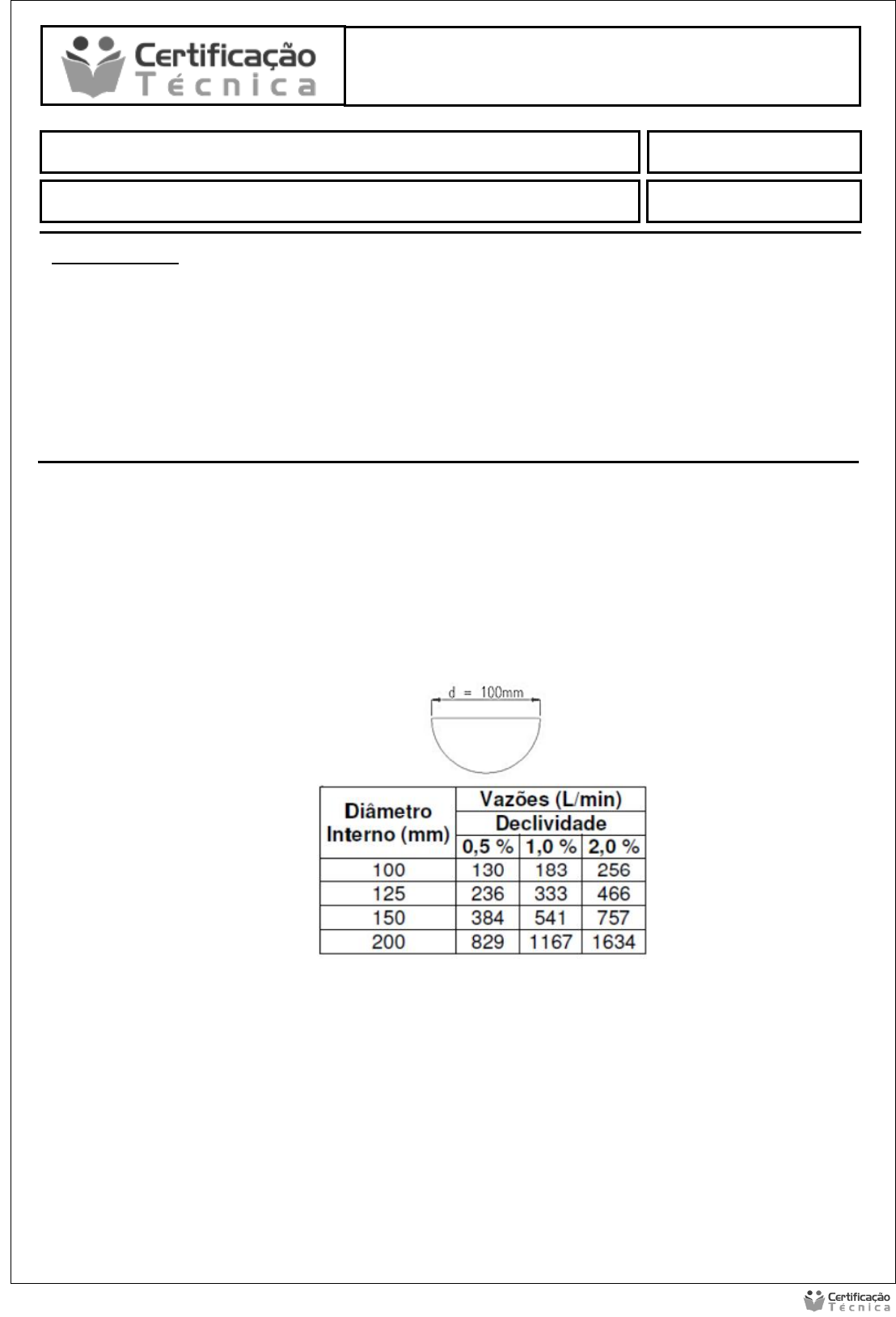 INSTRUÇÕES: Esta Avaliação contém 10 (dez) questões, totalizando 10 (dez) pontos; Baixe o arquivo disponível com a Atividade de Pesquisa; Você deve preencher dos dados no Cabeçalho para sua identificação: o Nome / Data de entrega. As respostas devem ser digitadas abaixo de cada pergunta; Ao terminar grave o arquivo com o nome Atividade Prática; Envio o arquivo pelo sistema no local indicado; Em caso de dúvidas consulte o seu Tutor. Aluno (a): Diego Lopes de Lima Data: 24 /05/ 2022 Instalações Hidráulicas – Esgoto e Drenagem - EDI Instalações Hidráulicas – Esgoto e Drenagem - EDI NOTA: Atividade Prática e de Pesquisa Leia o texto abaixo sobre dimensionamento das instalações de água fria e responda aos exercícios propostos. Apresente os cálculos. 1. Dimensionar a vazão da calha abaixo. O material a ser utilizado é o plástico e a inclinação é de 0,5%. De acordo com a tabela existente na apostila disponível nessa disciplina a vazão será de 130 L/min. 2. Verificar a vazão de calhas retangulares de concreto alisado com lâmina de água a meia altura. Instalações Hidráulicas – Esgoto e Drenagem - EDI Instalações Hidráulicas – Esgoto e Drenagem - EDI 3. Dimensionar o condutor vertical de uma instalação de águas pluviais com base nos se- guintes dados: Q = 650 l/min; H = 50mm, L = 6m, utilizando os ábacos abaixo: DN = 110 mm DN = 90 mm Instalações Hidráulicas – Esgoto e Drenagem - EDI 4. Dimensionar a calha e os condutores horizontais e verticais da edificação abaixo: a) b) c) Instalações Hidráulicas – Esgoto e Drenagem - EDI 5. Determinar os diâmetros do ramal de ventilação, da coluna de ventilação, dos ramais de descarga, dos ramais de esgoto, a declividade dos ramais de descarga e de esgoto do BWC residencial abaixo: Instalações Hidráulicas – Esgoto e Drenagem - EDI Ramal de ventilação = 50mm. Coluna de ventilação = 50mm. Ramais de descarga: LV = 40mm. 3% de declive RS = 40mm. 3% de declive BI = 40mm. 3% de declive CS = 50mm. 3% de declive VS = 100mm. 2% de declive Ramal de esgoto = 100mm. 2% de declive 6. Projetar o esgoto do BWC residencial abaixo: Instalações Hidráulicas – Esgoto e Drenagem - EDI 7. Dimensionar os tubos de queda, o tubo de gordura, as colunas de ventilação do esquema vertical abaixo representado: TQ1 = 11 uhc por andar x 8 andares = 88 uhc. Coluna de esgoto inteira = 100mm. Coluna de ventilação = 75 mm. Ramal de ventilação = 50mm. TQ2 = 10 uhc por andar x 8 andares = 80 uhc. Coluna de esgoto inteira = 100mm. Coluna de ventilação = 75 mm. Ramal de ventilação = 50mm. TG = 5 uhc por andar x 8 andares = 40 uhc. Coluna tubo de gordura = 75mm. Instalações Hidráulicas – Esgoto e Drenagem - EDI 8. As colunas do exercício anterior são do prédio cuja planta de locação está abaixo repre- sentada: Posicionar as caixas de inspeção, de gordura e dimensionar os subcoletores e o coletor que ligará o esgoto doméstico ao coletor público. Instalações Hidráulicas – Esgoto e Drenagem - EDI 9. Dimensionar um tanque séptico de câmara única para um restaurante em Florianópolis, que serve 100 refeições por dia, prevendo uma limpeza do tanque a cada 3 anos. R: V = 1000 + N (C x T) + (K x Lf) V = 1000 + 100 (25 x 0.92) + (145 x 0.1) V = 1000 + 100 (23 + 14.5) V = 1000 + 2300 + 1450 V = 4750 litros 10. Dimensionar um sumidouro para o restaurante do exercício anterior, sabendo que no tes- te de percolação realizado em campo, o intervalo de tempo durante o qual o nível da água baixou 10 m foi de 4 min. R: