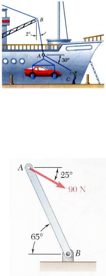 Lista em sala de Equilíbrio de um ponto e Momento Para ser entregue dia 26/04 até às 17h15. 1. Numa operação de descarregamento de um navio, um automóvel de 15.750 N é sustentado por um cabo. Uma corda é amarrada ao cabo em A e puxada para centrar o automóvel para a posição desejada. Qual é a tração na corda? Resp.: TAC = 648 N TAB = 16.084 N 2. Uma força de 90 N é aplicada à alavanca de controle AB, como ilustrado. O comprimento da alavanca é 225 mm. Determine o momento da força em relação a B, resolvendo via decomposição em componentes ao longo de AB e na direção perpendicular a AB. Resp.: MB = 13,02 N . m Figura dos exercícios 2 e 3 3. Uma força de 90 N é aplicada à alavanca de controle AB, como ilustrado. O comprimento da alavanca é 225 mm. Determine o momento da força em relação a B, resolvendo via decomposição em componentes horizontal e vertical. Resp.: MB = 13,02 N . m 4. Determine o ângulo θ para o qual a força de 500 N deve atuar em A para que o momento dessa força em relação ao ponto B seja igual a zero Resp.: θ = 8,53° 5. Se d=1,2 m determine o momento resultante, em relação ao ponto A Resp.: MA = 8,15 M.m