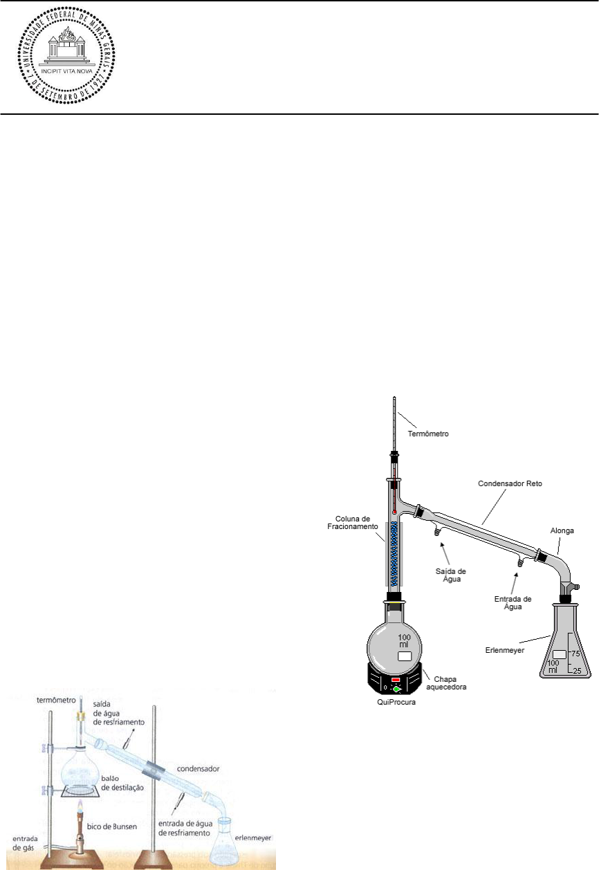Introdução Destilação é o processo de vaporizar o líquido para depois condensá-lo e recolhe-lo em um outro recipiente. É a técnica de separação mais importante e mais utilizada para a purificação de líquidos. Tem como objetivo separar, por ação da energia calorífica, substâncias voláteis de outras que o não são, ou são menos voláteis, e visa a separação de uma mistura de líquidos com pontos de ebulição diferentes. Quatro são os processos fundamentais de destilação: a)destilação simples; b)destilação fracionada; c)destilação a vácuo (pressão reduzida); e d)destilação por arraste a vapor. Dentre estes quatro processos, somente a destilação a vácuo não será abordada neste relatório. A Destilação Simples é um processo que permite a separação de um líquido de uma substância não volátil (tal como um sólido), ou de outro(s) líquido(s) que possui(em) uma diferença no ponto de ebulição maior do que cerca de 80ºC. É um método rápido de destilação, e deve ser usado sempre que possível - é uma técnica rápida, fácil e, se respeitado seus limites, eficaz. Usou-se esta técnica para separar e purificar o cloreto de terc-butila. Este processo será descrito posteriormente. Figura 1. Ilustração de um aparelho de destilação simples. A Destilação Fracionada é empregada quando a diferença entre os pontos de ebulição dos líquidos da mistura é menor do que 80ºC. Um aparelho mais sofisticado e um pouco mais de tempo são necessários. A principal diferença no aparelho de destilação fracionada é a presença de uma coluna de fracionamento. O objetivo desta coluna é criar várias regiões de equilíbrio líquido-vapor, enriquecendo a fração do componente mais volátil da mistura na fase de vapor. Usou-se esta técnica para determinar os componentes de uma mistura desconhecida. Este processo será descrito posteriormente. Figura 2. Ilustração de um aparelho de destilação fracionada. A Destilação por Arraste a Vapor é um meio muito utilizado para separação e purificação de compostos orgânicos. O princípio da destilação por arraste a vapor baseia-se na Lei de Raoult que diz que a pressão total de vapor de uma mistura de líquidos imiscíveis é igual a soma da pressão de vapor dos componentes puros individuais. A pressão total de vapor da mistura torna-se igual à pressão atmosférica numa temperatura menor que o ponto de ebulição de qualquer um dos componentes. Dessa forma, esta técnica de destilação constitui um bom recurso para purificação de substâncias de alto ponto de ebulição, principalmente aquelas que se decompõem ao serem destiladas à pressão atmosférica. Usou-se esta técnica para a obtenção do óleo essencial do cravo da índia. Este processo será descrito posteriormente. Figura 3. Ilustração de um aparelho de destilação por arraste a vapor. Materiais e Métodos Para a preparação do cloreto de terc-butila (a reação e seu mecanismo encontra-se no anexo deste relatório), colocou-se 10 mL de álcool terc-butílico e 33 mL de HCl concentrado em um funil de separação de 250 mL. Durante 15 minutos agitou-se a mistura, abrindo-se sempre a torneira, com o funil invertido e inclinado, para diminuir a pressão interna. Deixou-se, então, o funil suspenso num suporte acoplado com anel por alguns minutos até que houvesse a separação das fases, como mostrado na figura 4. Removeu-se a tampa do funil e recolheu-se a fase inferior (camada ácida) em um erlenmeyer. Lavou-se a fase orgânica com 20 mL de água destilada e posteriormente com 20 mL de NaHCO3 a 5% e novamente com água. Descartou-se a fase aquosa na pia e transferiu-se a fase orgânica para um balão de destilação de 125 mL contendo pedaços de porcelana e adicionou-se CaCl2 (agente secante) até que o líquido ficasse límpido. Destilou-se o líquido em um sistema de destilação simples como mostrado na figura 1. Recolheu-se a fração de ponto de ebulição 39ºC em uma proveta. Transferiu-se o produto para um frasco adequadamente identificado e fez-se o teste de reconhecimento de haletos na própria proveta, utilizando-se o resíduo do produto. Figura 4. Ilustração de uma separação de dois líquidos por extração líquido-líquido. Para a determinação dos componentes de uma mistura desconhecida, que foi preparada com dois solventes miscíveis entre si e cujos pontos de ebulição diferem de pelo menos 20ºC, utilizou-se o método da destilação fracionada usando-se a aparelhagem descrita na figura 2. Introduziu-se 100 mL da mistura em um balão de destilação de 200 mL contendo pedaços de porcelana. Executou-se a destilação, observando as variações da temperatura a cada 5 mL coletados. Após observar-se uma variação considerável da temperatura, substituiu-se o frasco coletor (uma proveta) por um outro. Transferiu-se as frações destiladas para frascos devidamente identificados. Para a obtenção do óleo essencial do cravo da índia, utilizou-se a técnica de destilação por arraste a vapor, fazendo-se uso da aparelhagem descrita na figura 3. Colocou-se no balão gerador de vapor um volume de água aproximadamente igual à metade da sua capacidade mais 100 mL. No outro balão, no qual passará o vapor, adicionou-se 100 g de cravo da índia. Executou-se a destilação, recolhendo-se pequenas porções em quatro tubos de ensaio para testes dos primeiros 50 mL destilados, onde o óleo essencial estará mais concentrado. Continuou-se o processo de destilação até que o destilado revelasse presença de óleo (cerca de 200 mL). Adicionou-se uma espátula de sal de cozinha ao destilado para quebrar a emulsão formada entre os dois líquidos imiscíveis, já que a água irá preferir interagir com o NaCl do que com o óleo. Deixou-se a mistura em repouso por alguns minutos. Transferiu-se a mistura para um funil de separação e adicionou-se 10 mL de clorofórmio. Agitou-se o funil cuidadosamente, lib