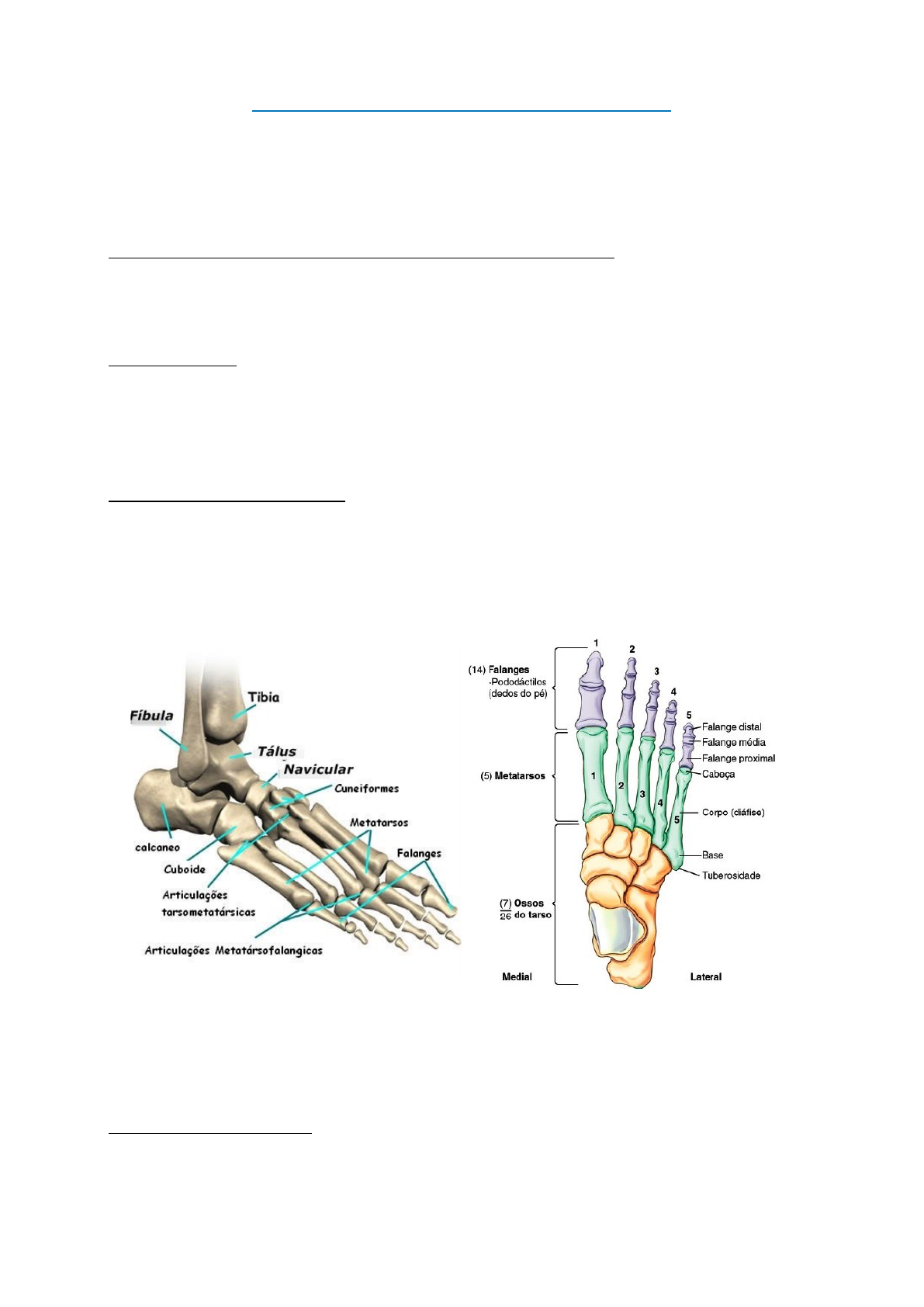 Anatomia e Biomecânica do Pé Anatomia do Pé - O pé lembra uma abóboda e é formado por 26 ossos + 2 sesamóides (embaixo da cabeça do primeiro metatarso), articulações e músculos intrínsecos e extrínsecos - As articulações do pé podem ser dividas conforme a função: • Articulações de movimento —> tornozelo e dedos • Articulações de apoio e amortecimento —> tarso e metatarso - Divisões do pé: • Retro-pé (tarso e calcâneo) • Médio-pé (navicular, cuboide e cuneiformes) • Ante-pé (metatarsos e falanges) - Articulações com epônimos: • Articulação de Chopart (entre retro e médio) • Articulação de Lisfranc (entre médio e ante) - Obs: Tornozelo faz parte do pé na biomecânica! Musculatura do Pé - A musculatura pode ser: • Intrínseca (origem e inserção no pé) • Extrínseca (músculos que tem origem na perna e se inserem no pé) - Músculos laterais: • Fibulares (curto, longo e terceiro) • Extensor longo comum dos dedos. - Músculos posteriores (vista medial): • Tibial posterior • Tibial anterior • Extensor longo comum dos dedos • Extensor longo do hálux - Musculatura plantar: • 4 camadas: 1. Primeira camada: abdutor do hálux, flexor curto dos dedos, abdutor do dedo mínimo. 2. Segunda camada: quadrado plantar, lumbricais. 3. Terceira camada: flexor curto do hálux, adutor do hálux, flexor curto do dedo mínimo. 4. Quarta camada: interósseos plantares e dorsais - Funções dos músculos do pé: • Conservação da forma • Ação propulsora • Função anti-gravitacional Arquitetura da Abóboda Plantar - Formado por: • 5 arcos longitudinais —> côncavos (cada arco corresponde a um metatarso) • Quanto mais medial, mais côncavo o arco é • Arco longitudinal mais importante = Arco longitudinal mediano (ALM) • Arcos transversais —> convexos • Arco transversal mais importante = Arco transverso anterior - A manutenção da abóboda plantar depende da: • Forma dos ossos • Elasticidade dos ligamentos • Equilíbrio dado pelos músculos - Alterações na abóboda plantar: • Aumento da altura da abóboda (ALM) – pé cavo (pé “alto”) • Diminuição da altura da abóboda (ALM) – pé plano (pé “chato”) Tipos de Ante-pé - Depende do comprimento dos dedos e do comprimento dos metatarsos - Podem ser: • Fórmula digital (conforme o comprimento do 1º dedo) • Fórmula metatarsal (conforme o comprimento do 1º metatarso): - Existem 3 formas metatarsais em relação ao comprimento do 1º metatarso: • Index plus minus (primeiro metatarso do mesmo comprimento do segundo) • Index minus (primeiro metatarso menor que o segundo. Mais comum) • Index plus (primeiro metatarso maior que o segundo) - Existem 3 formas digitais em relação ao primeiro dedo: • Pé romano (primeiro dedo igual ao segundo) • Pé grego (primeiro dedo menor do que o segundo, menos frequente) • Pé egípcio (primeiro dedo maior do que o segundo. Apresenta maior chance de fazer joanete/hálux valgo) Biomecânica - Distribuição do peso: • Em repouso ou na posição ereta o peso vai 50% para cada pé - Distribuição do peso dentro do pé: • 80%: do peso para o calcâneo (retro-pé) • 20%: do peso vai para o ante-pé (carga se distribui nas cabeças dos metatarsos - o 1º metatarso recebe o dobro ou mais carga do que os outros) - Essa distribuição varia de acordo com o sapato (salto): • Salto mais alto —> pressão maior para o ante-pé. - A pressão sobre cada pé varia de acordo com a posição do pé e com o balanceio da marcha. - Os dedos são importantes na adaptação ao solo irregular, marcha, corrida, salto. - Repouso absoluto não existe no pé em bipedestação pois o pé está em contínuo movimento para equilíbrio e oscilação (balanço). Ocorre a contração de músculos para que mantenha o equilíbrio Marcha - Marcha normal exige um pé com ampla mobilidade, indolor, força normal e até os dedos tem funções. - Tempos da marcha: • 1º apoio bilateral (os dois pés no solo) • 1º apoio unilateral (pé esquerdo no solo) • 2º apoio bilateral • 2º apoio unilateral (pé direito no solo) - Sequência da pisada: choque do calcanhar —> apoio total —> apoio ante-pé —> despregue. Pé Plano (Pé chato) - É o mais frequente motivo de consulta ao ortopedista do pé - A principal queixa é deformidade (e não dor) - Fisiopatologia: • Ocorre queda do arco longitudinal mediano (ALM) • Diminui a curvatura da abóboda plantar • Geralmente está associada a valgo do retro-pé - Etiologia: • Óssea (lesões mais graves) • Alterações músculo-ligamentares (benignos, mais frequentes) • Patologias neuro-musculares. Pé Flácido Infantil - É o pé plano valgo flexível. - Ao exame físico: • Redutível, flexível, avaliar a gravidade do valgismo do calcâneo. • Benigno, muitas vezes fisiológico (pois a criança apresenta musculatura não madura) • Manobras para diferenciar do pé plano patológico: • Ficar na ponta dos pés • Fazer extensão do 1º dedo (Jack test) — deve formar o arco - Exploração complementar: • Raio X (afastar causas ósseas) • Podoscopio • Fotopodograma (impressão plantar) - Tratamento: • Não é sinônimo de incompetência do pé/patologia • Até 2 a 3 anos de idade não se deve tratar (é considerado fisiológico) • De 3 a 9 anos, em crianças com hiperfrouxidão e joelho valgo associado, deve-se recomendar a realização de exercícios e indicar uso de palmilhas. • Após os 10 anos, pode ser feita cirurgia por dor (raro) Pé Plano de Etiologia Óssea - Astralgo vertical (talus vertical): • É um defeito congênito • O pé fica em “mata-borrão” (planta muito convexa) • Não é frequente • A conduta é cirúrgica - Fusão tarseana (barra óssea entre ossos do pé): • É o pé não flexível, plano por coalisão tarsal • Quando doloroso, a conduta é cirúrgica. - Pé plano valgo: • Possui sinais clínicos de 