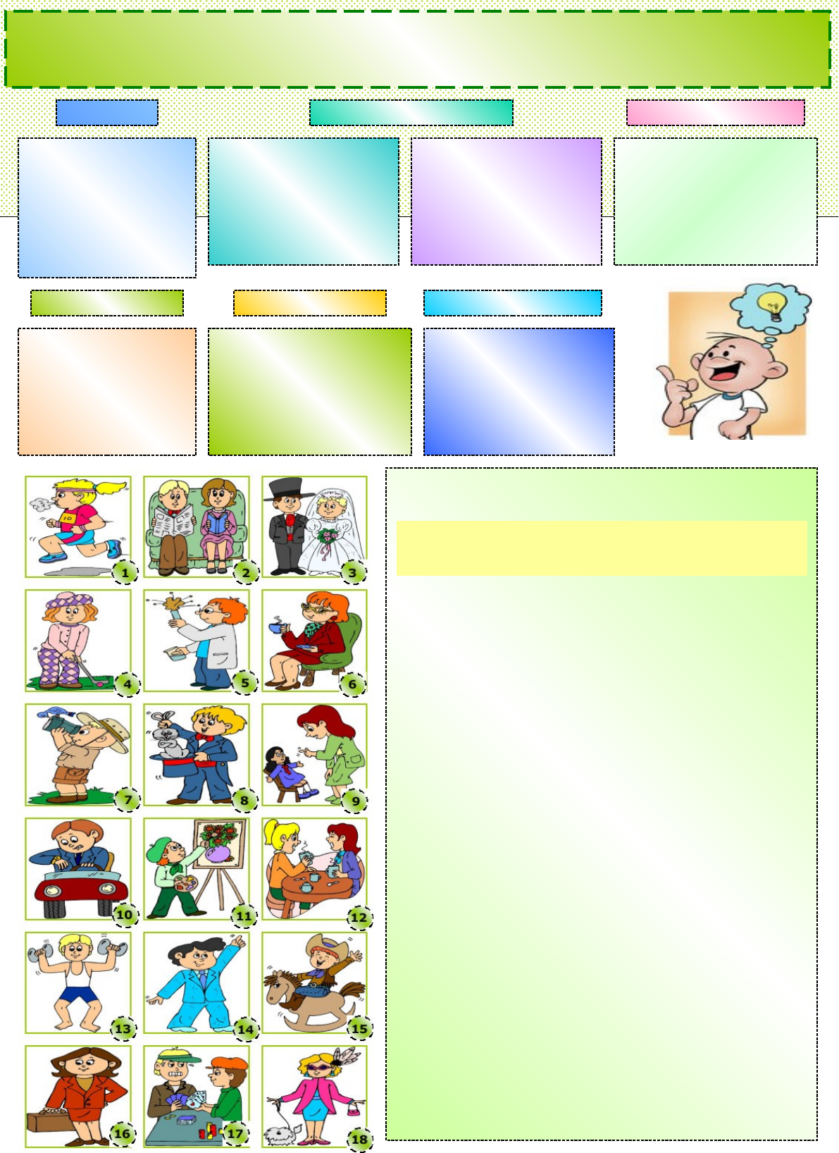 We use this tense to talk about actions that are happening at the time of speaking or around a present time. I am reading a book now. She is ironing my shirt. Mum is cooking lunch at home. He is reading a book this week. Dad is working in the office. TIME EXPRESSIONS · NOW · AT THE MOMENT · AT PRESENT · JUST NOW · RIGHT NOW We’re doing our homework now. Lisa is watching TV right now. At present my father is looking for a job. STATE VERBS Some verbs can’t be used in progressive or continuous forms. Some of these are: Verbs of thinking: understand, believe, know, remember. Verbs of liking or disliking: like, love, prefer, hate. Verbs of being and possession: be, own. · One syllable verbs ending in one consonant preceded by one vowel double the final consonant. Run- running Sit – sitting · Verbs ending in “ie” change to “y” and then add –ing. Lie - lying Dye - dying SPELLING RULES We add –ing to the base form. Drink – drinking Play- playing Dream-dreaming Special cases: · Verbs ending in “e” omit “e” and then add –ing. Live – living Come coming The Present Continuous is also used to talk about actions we have arranged to do. A future time expression is often used to give the future meaning to the sentence. I´m visiting him next week. She´s coming tomorrow. They are leaving on Friday. AFFIRMATIVE Subject+ verb to be+ -ing form of the main verb. NEGATIVE Subject+ negative of the verb to be+ -ing form of the main verb. INTERROGATIVE Verb to be+subject+ -ing form of the main verb. FUTURE ACTIONS PRESENT ACTIONS FORM PRESENT CONTINUOUS TENSE Complete the sentences using a suitable verb from the list in the Present Continuous to describe what these people do. PAINT DO MAKE EXERCISE RIDE WALK DRINK PUT JOG TELL ENJOY PLAY WATCH GET MARRIED DRIVE TALK READ WAIT 1. Sandra ____________ in the park right now. 2. Jim and his wife _____________ in the living room. 3. At the moment Paul and Sue _______________ . 4. Hannah ________________ golf with her friends at the club. 5. Mark ______________ a very important experiment in his laboratory. 6. Lisa ______________ a nice cup of tea at the moment. 7. Alan ___________________ the birds with his binoculars. 8. John, who is a magician, _____________ a trick with a rabbit. 9. Tina _________________ off her favourite doll. 10. Dave ___________________________ to work. He is in a hurry. 11. Henry ________________ a beautiful picture of a vase. 12. Sheila and Claire ______________ about their boyfriends at the café now. 13. Look! Ben ______________ at the gym. He wants to keep fit. 14. Jim ___________ up his hand because he wants to ash something. 15. Little Larry _____________________ on his rocking horse right now. 16. Ann ______________________ for the bus to go to her office. She has a very important meeting with a customer. 17. Steve and his grandfather ________________ a game of cards. Steve’s grandfather is losing at the moment. 18. Sophie ____________________ her dog. She does it before dinner every day.