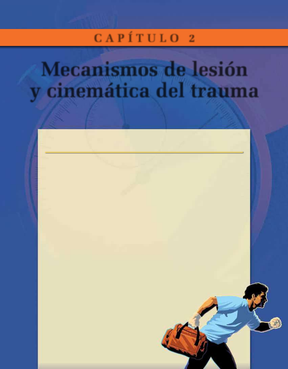 Mecanismos de lesión y cinemática del trauma C A P Í T U L O 2 ✓ Definir la energía en el contexto como causante de una lesión. ✓ Describir la asociación entre las leyes del movimiento y energía y la cinemática del trauma. ✓ Describir la relación entre la lesión y el intercambio de energía con la velocidad. ✓ Discutir el intercambio de energía y la producción de una cavitación. ✓ Dada la descripción de un choque de un vehículo de motor, usar la cinemática para predecir el patrón de lesión probable para un ocupante no sujetado. ✓ Asociar los principios de intercambio de energía con la fisiopatología de la lesión a la cabeza, la columna vertebral, el tórax, el abdomen y las extremidades como producto de tal intercambio. ✓ Describir las lesiones específicas y sus causas relacionadas con el daño interior y exterior al vehículo. ✓ Describir la función de los sistemas de sujeción para los ocupantes de vehículos. ✓ Relacionar las leyes del movimiento y la energía con otros mecanismos diferentes a los choques de vehículos de motor (p. ej., explosiones, caídas). ✓ Describir las cinco fases de lesión por explosión y las lesiones producidas en cada fase. ✓ Describir las diferencias en la producción de las lesiones con armas de baja, media y alta energía. ✓ Discutir la relación de la superficie frontal del objeto que se impacta con el intercambio de energía y la producción de lesiones. ✓ Integrar los principios de la cinemática del trauma en la evaluación del paciente. Al completar este capítulo, el lector será capaz de hacer lo siguiente: O B J E T I V O S D E L C A P Í T U L O http://booksmedicos.org 14 PHTLS Primera Respuesta al Trauma Usted y su compañero son enviados a una colisión entre dos automóviles. El día está soleado y caluroso. La escena ya ha sido asegurada por la policía al momento de su llegada. Al momento de llegar usted confirma que sólo hay dos vehículos involucrados. El primero se encuentra en la zanja lateral derecha del camino y se ha impactado contra un árbol del lado del pasajero. Hay agujeros de bala en la puerta delantera izquierda. Usted alcanza a ver tres agujeros por lo menos. Hay dos ocupantes en el vehículo. El otro automóvil se salió del lado izquierdo del camino y ha chocado contra un poste de luz, en el centro de los dos faros delanteros. Hay dos personas dentro de ese auto. Es un vehículo viejo sin bolsas de aire. El volante se encuentra doblado y del lado del conductor hay una fractura con forma de diana en el parabrisas. Al asomarse del lado del pasajero, usted encuentra una rotura en el tablero del lado del pasajero. Ninguno de los pasajeros en ese vehículo usaba el cinturón de seguridad. Usted se enfrenta a 4 pacientes lesionados, dos en cada carro y todos permanecen dentro de los vehículos. Es su responsabilidad evaluar a los pacientes y asignar la prioridad para su transporte. Tome a los pacientes uno a la vez y descríbalos con base en la cinemática. Las lesiones traumáticas inesperadas son responsables de más de 169 000 muertes en Estados Unidos cada año.1 Las colisiones entre vehículos produjeron más de 37 000 muertes y más de 4 millones de lesionados en el 2008.2,3 Este problema no está limitado a Estados Unidos; otros países tienen tasas de trauma vehicular similares, aunque los vehículos pue- den ser un poco distintos. El trauma penetrante por las heridas de bala es muy elevado en Estados Unidos. En 2006 se presen- taron casi 31 000 muertes por armas de fuego. De éstas, más de 13 000 fueron homicidios.1 En 2008 se reportaron más de 78 000 heridas por armas de fuego no fatales.2 Las lesiones por explo- sión son una principal causa de lesión en muchos países, mien- tras que las heridas penetrantes por cuchillos son prominentes en otros. El manejo exitoso de los pacientes de trauma depende de la identificación de las posibles lesiones y el uso de buenas habilidades de evaluación. Casi siempre es difícil determinar la lesión exacta producida, pero entender el potencial de lesión y la potencial pérdida de sangre permitirá al proveedor usar el proceso de pensamiento crítico para reconocer esta posibilidad y realizar un triage apropiado, así como tomar decisiones ade- cuadas para el manejo y transporte del paciente. El manejo de cada paciente inicia (después de la reanima- ción inicial) con los antecedentes de la lesión del paciente. En trauma, los antecedentes es la historia del impacto y el intercambio de energía producto de este impacto.4 El enten- dimiento del proceso de intercambio de energía llevará a la sospecha de 95% de las posibles lesiones. Cuando el proveedor, en cualquier nivel de atención, no entiende los principios de cinemática o el mecanismo invo- lucrado se podrían dejar pasar lesiones. La comprensión de estos principios aumentará el nivel de sospecha basada en el patrón de lesiones que probablemente estén asociadas con el reconocimiento de la escena al momento de llegar. Esta información y las lesiones sospechadas se pueden usar para valorar apropiadamente al paciente en la escena y se pueden transmitir a los médicos y enfermeras en el servicio de urgen- cias. En la escena y durante el traslado, se pueden manejar las lesiones sospechadas para brindar al paciente la atención más apropiada y “no producir más daño”. Las lesiones que no son obvias pero graves pueden ser fatales si no se manejan en la escena y durante el traslado al centro de trauma o a un hospital apropiado. El conocimiento de dónde mirar y cómo valorar las lesiones es tan importante como conocer qué hacer después de encontrar las lesiones. Una historia clínica completa y precisa sobre el incidente traumático y una interpretación apropiada de los datos brin- dará esta información. La mayoría de las lesiones del paciente se puede predecir con un reconocimiento apropiado de la escena, incluso antes de explorar al paciente. Este capítulo a