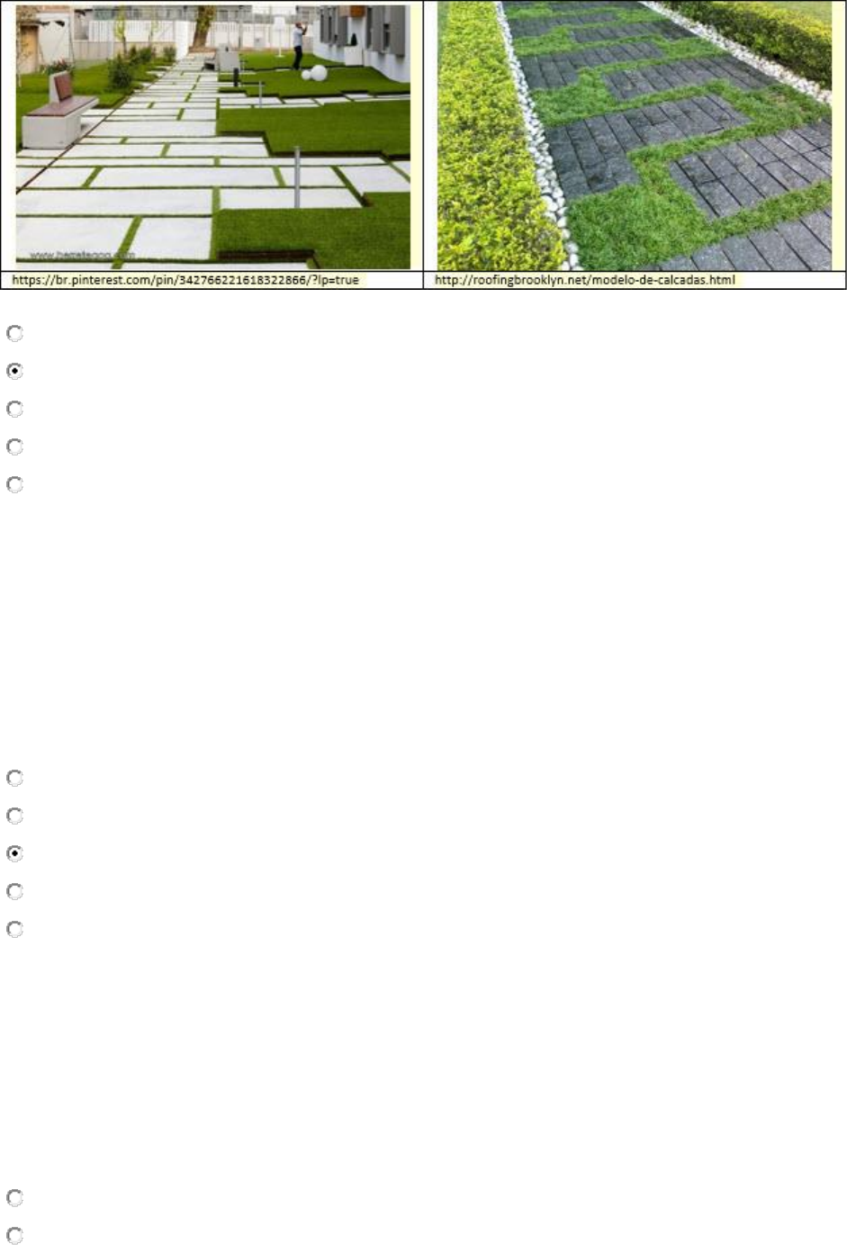 Pergunta 1 1. São vários os elementos de composição paisagísticos, as figuras a seguir fazem referência a qual deles? a. Contraste. b. Paginação. c. Padronagem. d. Cor. e. Ênfase. 0,175 pontos Pergunta 2 1. Elemento mais simples da representação gráfica, pode indicar uma referência de desenho ou espaço. É a representação da partícula geométrica mínima da matéria e, do ponto de vista simbólico, é considerado como elemento de origem. A afirmação acima faz referência a qual elemento de composição? a. Linha Horizontal. b. Linha Vertical c. Ponto. d. Textura. e. Linha Curva. 0,175 pontos Pergunta 3 1. “Em toda paisagem, deve-se haver um elemento de destaque que atraia a atenção e desperte um sentimento de admiração e prazer. [...] É um ponto para o qual se deseja atrair a atenção do observador.” (GOURLART, 2017). Qual o elemento compositivo que trata a citação? a. Circulação. b. Ritmo. c. Ênfase ou centro de interesse. d. Volume. e. Luz. 0,175 pontos Pergunta 4 1. Linhas, texturas, o padrão de repetição e continuidade de um desenho trabalhados de maneira conjunta formam um elemento de composição que é normalmente usado em tecidos. Esse elemento deve se adaptar às superfícies onde será empregado: pequenos para pequenos ambientes e grandes para ambientes maiores. Assinale o elemento compositivo em questão: a. Volume. b. Cor. c. Padronagem. d. Ênfase. e. Paginação.