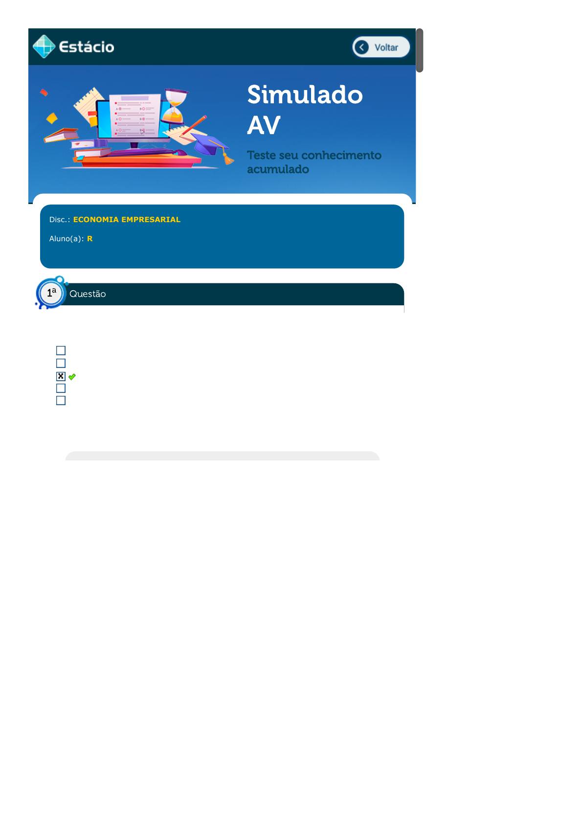 26/05/2022 12:28 Estácio: Alunos https://simulado.estacio.br/alunos/ 1/1 Simulado AV Teste seu conhecimento acumulado Disc.: ECONOMIA EMPRESARIAL Aluno(a): REGIANE MARIA RODRIGUES 202002185481 Acertos: 10,0 de 10,0 26/05/2022 Acerto: 1,0 / 1,0 Que método pode ser utilizado para encontrar a solução de um jogo dinâmico (sequencial)? Seleção do resultado estático Escolha da melhor resposta progressiva Indução retroativa Indução progressiva Mínimos quadrados ordinários Respondido em 26/05/2022 11:51:21 E li ã Questão1 a https://simulado.estacio.br/alunos/inicio.asp javascript:voltar();