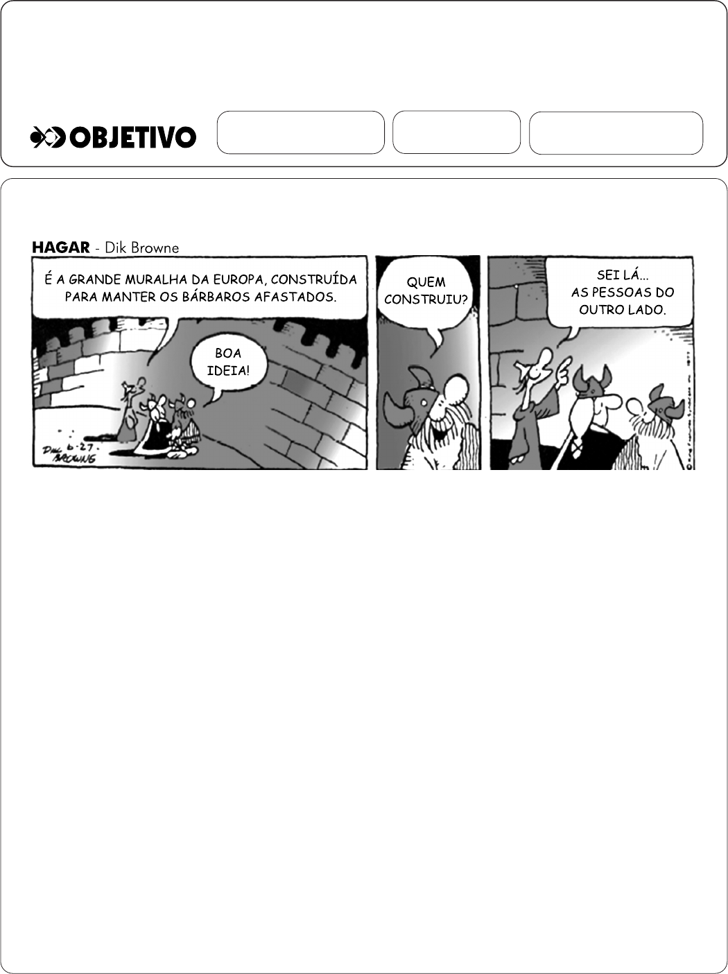 OBJETIVO PORTUGUÊS – DESAFIO – 9.o ANO1 Texto para as questões 1 e 2. (Dick Browne. O melhor de Hagar: o Horrível. Porto Alegre: L&PM Pocket, 2006. v. 2, p. 75.) QUESTÃO 1 No contexto desses quadrinhos, a finalidade do autor foi mostrar a) a falta de cultura dos povos bárbaros. b) a competência dos construtores da muralha. c) a relatividade da visão que as pessoas têm dos outros. d) a superioridade da visão que as pessoas têm dos outros. e) o espanto dos personagens em relação ao tamanho da muralha. RESOLUÇÃO Visto que os personagens são Vikings (povo bárbaro), a tira mostra a relatividade de visão que estes têm de si mesmos e dos outros. Resposta: C QUESTÃO 2 Em “...construída para manter os povos bárbaros afastados”, o trecho destacado não pode, por implicar alteração de sentido da frase em que aparece, ser substituído por: a) conforme deseja manter. b) com o objetivo de manter. c) a fim de manter. d) com a intenção de manter. e) tendo em vista manter. Colégio Nome: _____________________________________________________________________ N.º: __________ Endereço: ______________________________________________________________ Data: __________ Telefone:_________________ E-mail: _________________________________________________________ Disciplina: PORTUGUÊS NOTA: PARA QUEM CURSA O 9.O ANO DO ENSINO FUNDAMENTAL EM 2018 Prova: DESAFIO OBJETIVO PORTUGUÊS – DESAFIO – 9.o ANO2 RESOLUÇÃO O trecho destacado indica a finalidade do que se declara na oração anterior. Entre as alternativas, a única que não indica finalidade é a a. O conectivo conforme serve para indicar a concordância entre os fatos expressos nas duas orações unidas por ele. Resposta: A Texto para as questões de 3 a 11. TER OU NÃO TER NAMORADO? EIS A QUESTÃO Quem não tem namorado é alguém que tirou férias remuneradas de si mesmo. Namorado é a coisa mais difícil das conquistas. Difícil porque namorado de verdade é muito raro. Necessita de adivinhação, de pele, de saliva, lágrimas, nuvem, quindim, brisa ou filosofia. Paquera, flerte, caso, transa, envolvimento, até paixão, é fácil. Mas namorado mesmo é muito mais difícil. Namorado não precisa ser o mais bonito, mas ser aquele a quem se quer proteger e quando se chega ao lado dele a gente treme, sua frio e quase desmaia pedindo proteção. Esta não precisa ser parruda, decidida ou bandoleira: basta um olhar de compreensão ou mesmo de aflição. Quem não tem namorado não é quem não tem um amor: é quem não sabe o gosto de namorar. Se você tem três pretendentes, dois paqueras, um envolvimento e dois amantes, mesmo assim pode não ter nenhum namorado. Não tem namorado quem não sabe o gosto da chuva, cinema sessão das duas, medo do pai, sanduíche de padaria ou drible no trabalho. Não tem namorado quem faz pactos de amor apenas com a infelicidade. Namorar é fazer pactos com a felicidade, ainda que rápida, escondida, fugida ou impossível de curar. Não tem namorado quem não sabe o valor das mãos dadas, de carinho escondido na hora em que passa o filme, e de flor catada no jardim da vizinha e entregue de repente, de poesia de Fernando Pessoa, de Vinícius de Moraes ou Chico Buarque lida bem devagar, de gargalhada quando fala junto ou descobre a meia rasgada, de ânsia enorme de viajar para a Escócia ou mesmo de metrô, bonde, nuvem, cavalo alado, tapete mágico ou foguete interplanetário. Não tem namorado quem não gosta de falar do próprio amor, nem de ficar horas e horas olhando o mistério do outro dentro dos olhos, quem não gosta de dormir agarrado, fazer a sesta abraçado, fazer compra junto, ficar abobalhados pela lucidez do amor. Não tem namorado quem não redescobre a criança própria e a do amado e sai com ela para parques, fliperamas, beira d’água, show do Milton Nascimento, bosques enluarados, ruas de sonhos ou musical da Metro. Não tem namorado quem não tem música secreta com ele, quem não dedica livros, quem não recorta artigos, quem não se chateia do fato do seu bem ser paquerado, quem ama sem gostar, quem gosta sem curtir, quem curte sem aprofundar, quem nunca sentiu o gosto de ser lembrado de repente no fim de semana, na madrugada ou meio-dia de sol em plena praia cheia de rivais. Não tem namorado quem confunde solidão com ficar sozinho e em paz, quem não fala sozinho, não ri de si mesmo e quem tem medo de ser afetivo, carinhoso. Se você não tem namorado é porque não descobriu que o amor é alegre e vive pesando duzentos quilos de grilos e de medos. Ponha a saia mais leve, aquela de chita, e passeie de mãos dadas com o ar. Enfeite-se com margaridas e ternuras e escove a alma de leve fricções de esperança. De alma escovada e coração aberto, saia do quintal, da janela, de si mesmo e descubra o próprio jardim. Acorde com gosto de caqui e sorria lírios para quem passe debaixo de sua janela. Ponha intenções de sinceridade em seus olhos e beba o licor de contos de fadas. Ande como se o chão estivesse repleto de sons de flauta e do céu descesse uma névoa de borboletas, cada qual trazendo uma pérola falante a dizer frases sutis e palavras de galanteio. Se você não tem namorado é porque ainda não enlouqueceu aquele pouquinho necessário a fazer a vida parar e de repente parecer que faz sentido. Enlou-cresça!!!!! (Arthur Távola. In: Joaquim Ferreira dos Santos (Org.). As cem melhores crônicas brasileiras. Rio de Janeiro: Objetiva, 2007, p. 244-245.) QUESTÃO 3 No trecho “Quem não tem namorado é alguém que tirou férias remuneradas de si mesmo”, o sentido da expressão em destaque só não se aplica a: a) privar-se de férias não pagas. b) abdicar gratuitamente de si mesmo. c) renunciar em vão a si mesmo. d)despojar-se inutilmente de si mesmo. e)esvaziar-se a troco de nada. RESOLUÇÃO A única opção que não se aplica à expressão tirar férias é privar-se de férias. Privar-se significa renunciar. No caso, renunciar às férias seria o opo
