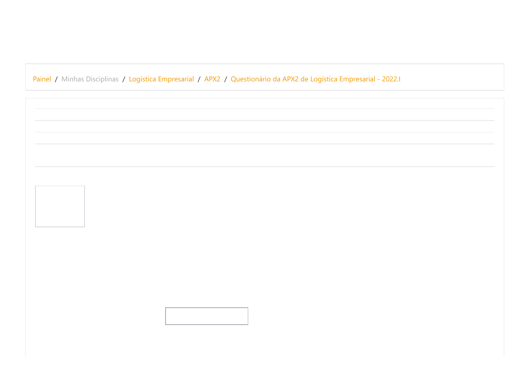 30/05/2022 11:58 Questionário da APX2 de Logística Empresarial - 2022.I: Revisão da tentativa https://graduacao.cederj.edu.br/ava/mod/quiz/review.php?attempt=909283&cmid=325683 1/36 Painel / Minhas Disciplinas / Logística Empresarial / APX2 / Questionário da APX2 de Logística Empresarial - 2022.I Questão 1 Completo Não avaliada Iniciado em sexta, 27 mai 2022, 13:38 Estado Finalizada Concluída em sexta, 27 mai 2022, 15:16 Tempo empregado 1 hora 37 minutos Avaliar 8,00 de um máximo de 10,00(80%) Termo de Conduta Declaro assumir o compromisso de confidencialidade e de sigilo escrito, fotográfico e verbal sobre as questões do exame ou avaliação pessoal que me serão apresentadas, durante o curso desta disciplina. Comprometo-me a não revelar, reproduzir, utilizar ou dar conhecimento, em hipótese alguma, a terceiros, e a não utilizar tais informações para gerar benefício próprio ou de terceiros. Reitero minha ciência de que não poderei fazer cópia manuscrita, registro fotográfico, filmar ou mesmo gravar os enunciados que me são apresentados. Declaro, ainda, estar ciente de que o não cumprimento de tais normas caracterizará infração ética, podendo acarretar punição de acordo com as regras da minha universidade. Dê seu ciente aqui: sim, ciente. https://graduacao.cederj.edu.br/ava/my/ https://graduacao.cederj.edu.br/ava/course/view.php?id=188 https://graduacao.cederj.edu.br/ava/course/view.php?id=188§ion=7 https://graduacao.cederj.edu.br/ava/mod/quiz/view.php?id=325683 30/05/2022 11:58 Questionário da APX2 de Logística Empresarial - 2022.I: Revisão da tentativa https://graduacao.cederj.edu.br/ava/mod/quiz/review.php?attempt=909283&cmid=325683 2/36 Questão 2 Correto Atingiu 0,50 de 0,50 Ferramentas de Qualidade são técnicas que se podem utilizar com a finalidade de definir, mensurar, analisar e propor soluções para problemas que eventualmente são encontrados e interferem no bom desempenho dos processos de trabalho. No âmbito dos serviços logísticos o objetivo das ferramentas da qualidade é avaliar alterações nos processos por meio de análises objetivas, de modo a subsidiar a sua correção e melhoria. Considerando a relação ferramenta e seu objetivo, analise as afirmativas a seguir: I. Histograma é uma ferramenta que emprega técnicas de análise estatística, com o objetivo de monitorar o grau de variabilidade de uma atividade, permitindo a identificação de eventuais tendências. II. Análise de Pareto é uma ferramenta que permite caracterizar como se distribuem as causas que acarretam o efeito principal. III. Diagrama de Ishikawa é uma ferramenta de análise de processo que tem o objetivo de evidenciar esquematicamente a relação entre as causas potenciais e o efeito (problema) em uma determinada etapa da cadeia logística. IV. Gráfico de Controle é uma ferramenta para verificar graficamente a frequência da ocorrência de desvios nos processos logísticos, de modo a facilitar a priorização dos processos a serem ajustados V. Diagrama de Fluxo de Processo é uma ferramenta que permite que um grande número de ideias seja gerado com vistas à compreensão dos principais problemas que surgem e os motivos associados à má qualidade do serviço logístico. É correto o que se afirma em: a. I, III e IV b. III, IV e V c. II e III Resposta certa! d. II, III, IV e V 30/05/2022 11:58 Questionário da APX2 de Logística Empresarial - 2022.I: Revisão da tentativa https://graduacao.cederj.edu.br/ava/mod/quiz/review.php?attempt=909283&cmid=325683 3/36 e. II e IV Sua resposta está correta. A resposta correta é: II e III 30/05/2022 11:58 Questionário da APX2 de Logística Empresarial - 2022.I: Revisão da tentativa https://graduacao.cederj.edu.br/ava/mod/quiz/review.php?attempt=909283&cmid=325683 4/36 Questão 3 Correto Atingiu 0,50 de 0,50 Na coordenação e programação do canal de suprimento, Postponement é uma estratégia competitiva empregada pelas empresas, sobretudo para aumentar a agilidade e flexibilidade do processo produtivo a partir do final da linha, com a finalidade de atender as necessidades do mercado consumidor. Um dos mais famosos cases de sucesso vem da Dell, fabricante de computadores pessoais sob encomenda, que pratica o Postponement ao configurar sistemas de microcomputadores de acordo com as variações dos pedidos. Neste contexto, analise as seguintes afirmativas. I.No Postponement de processo, os produtos podem ser desenhados de acordo com uma lógica de módulos ou ainda ter componentes padronizados para facilitar a diferenciação posterior. II.A prática de Postponement é sustentada pelo princípio de evitar a geração de estoques para uma grande variedade de produtos, adiando as atividades que criam variedade até o momento mais tarde possível. III.No Postponement de fabricação as etapas finais de fabricação somente são concluídas após a confirmação do pedido do cliente. IV. O Postponement, no que tange a diferenciação pode ser implementado utilizando conceitos de ressenquenciamento, atributos comuns, modularidade e padronização. V. No Postponement de produto o processo de finalização do mesmo, ocorre a partir do pedido no ponto mais próximo possível do instante de entrega ao cliente. É correto o que se afirma apenas em: a. II, III,IV e V b. I e V c. I, IV e V d. II, III e IV Resposta certa! 30/05/2022 11:58 Questionário da APX2 de Logística Empresarial - 2022.I: Revisão da tentativa https://graduacao.cederj.edu.br/ava/mod/quiz/review.php?attempt=909283&cmid=325683 5/36 e. I, II e III Sua resposta está correta. A resposta correta é: II, III e IV 30/05/2022 11:58 Questionário da APX2 de Logística Empresarial - 2022.I: Revisão da tentativa https://graduacao.cederj.edu.br/ava/mod/quiz/review.php?attempt=909283&cmid=325683 6/36 Questão 4 Correto Atingiu 0,50 de 0,50 Sobre o MRP-Materials Requirements Planning, analise as afirmativas a seguir: I.No MRP as existências de saldo em estoque, 