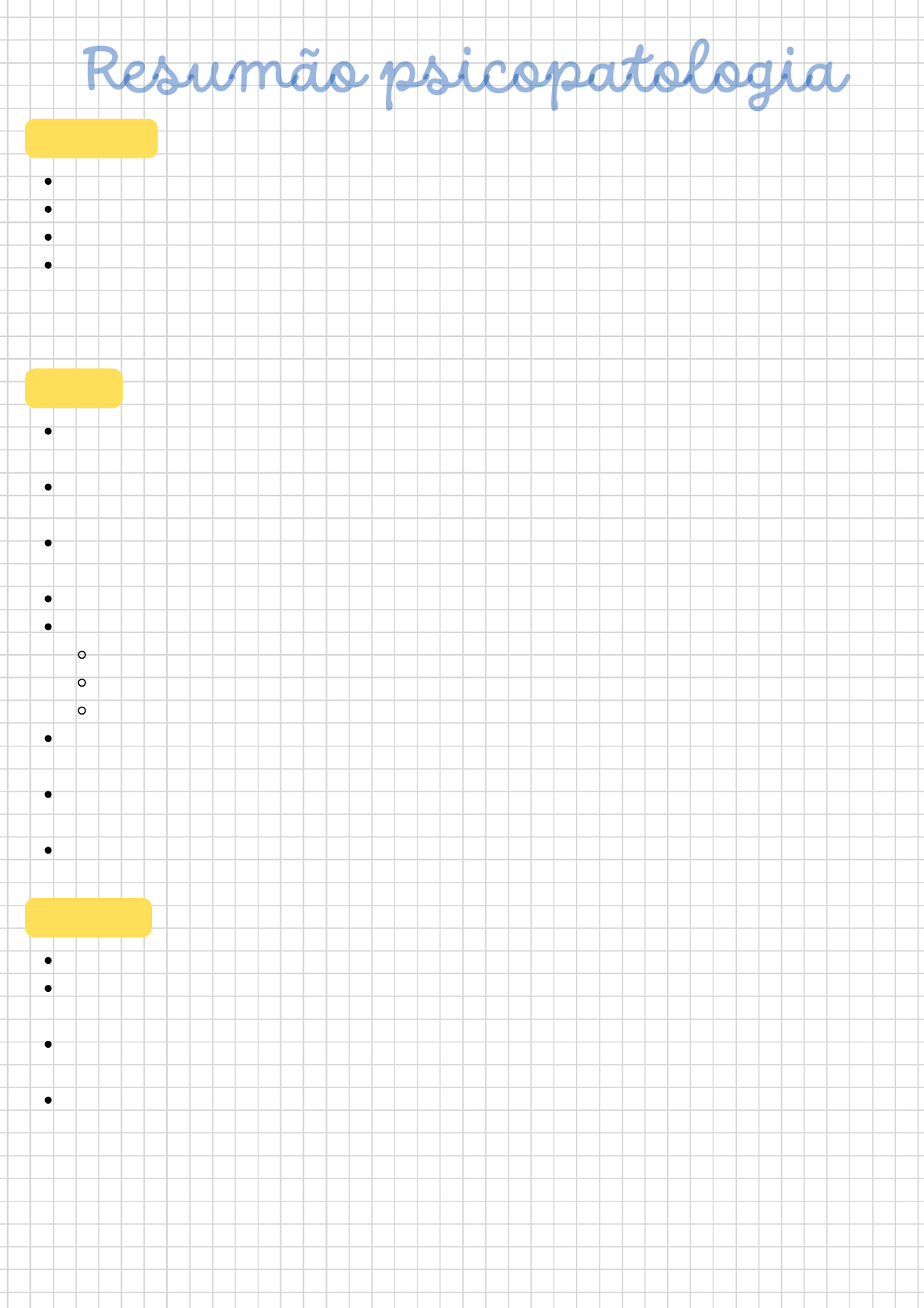Resumão psicopatologiaResumão psicopatologia Consciência Estado vígil (vigilância), o que, de certa forma, iguala a consciência ao grau de clareza do sensório. Fundamentalmente o estado de estar desperto, acordado, vígil, lúcido. Continuum de sensibilidade e alerta do organismo perante os estímulos, tanto internos como externos. Delirium é o termo mais adequado para designar a maior parte das síndromes confusionais agudas. Quadro de rebaixamento leve a moderado do nível de consciência, acompanhados de desorientação temporoespacial, dificuldade de concentração, ansiedade, agitação e ilusões e/ou alucinações quase sempre visuais. Atenção A atenção pode ser definida como a direção da consciência, o estado de concentração da atividade mental sobre determinado objeto. Torna o ser humano capaz de selecionar, filtrar e organizar as informações. A determinação do nível de consciência é essencial para a avaliação da atenção. A tenacidade consiste na capacidade do indivíduo de fixar e manter sua atenção sobre determinado estímulo. A vigilância é definida como o aspecto da atenção relacionado à mudança de foco, de um objeto para outro. Alterações da atenção: Hipoprosexia - perda básica da capacidade de concentração; Aprosexia - total abolição da capacidade de atenção; Hiperprosexia - estado de atenção exacerbada, detém-se sobre certos objetos. No TDHA há dificuldade marcante de direcionar e manter a atenção a estímulos internos e externos; inibição falha e impulsividade. Nos transtornos de humor há uma diminuição marcante da atenção voluntária e aumento da atenção espontânea, com hipervigilância e hipotenacidade. Nos quadros depressivos, há diminuição geral da atenção e em alguns casos graves, ocorre a fixação da atenção sobre temas depressivos. Orientação Capacidade de situar-se quanto a si mesmo e quanto ao ambiente. A avaliação da orientação é um instrumento valioso para a verificação das perturbações do nível de consciência, da percepção, da atenção, da memória e de toda a cognição. A orientação espacial se refere ao local onde o sujeito está, como orientação topográfica, geográfica etc. É investigada perguntando-se ao paciente o lugar exato onde ele se encontra. A orientação temporal se refere a uma adequada percepção do tempo e da sequência de intervalos temporais, de sua correspondente representação mental. É investigada perguntando-se ao paciente em que momento cronológico ele está. Senso percepção Sensação - fenômeno elementar gerado por estímulos físicos, químicos ou biológicos variados, originados fora ou dentro do organismo, que produzem alterações nos órgãos receptores, estimulando-os. Fenômeno passivo. Percepção - entende-se pela tomada de consciência, pelo indivíduo, do estímulo sensorial. Transformação de estímulos puramente sensoriais em fenômenos perceptivos conscientes. Fenômeno ativo. Alterações quantitativas. Hiperestesia - as percepções encontram-se anormalmente aumentadas em sua intensidade ou duração. Hiperpatia - quando uma sensação desagradável é produzida por um leve estímulo da pele. Hipoestesia - o mundo circundante é percebido como mais escuro, as cores tornam-se pálidas e sem brilho; Hipoestesia táteis - alterações em territórios cutâneos. Alterações qualitativas. Ilusão - se caracteriza pela percepção deformada, alterada, de um objeto real e presente. Há sempre um objeto externo real. São encontradas, com maior frequência, nos quadros de delirium. Alucinações - percepção de um objeto, sem que este esteja presente, sem o estímulo sensorial respectivo. Ocorrem com maior frequência nos transtornos do espectro da esquizofrenia. Alucinações Schneiderianas - alucinações áudio verbais que comandam ações ou comentam as ações e atividades do paciente. Memória A capacidade de codificar (registrar), armazenar (manter) e evocar as experiências, impressões e fatos que ocorrem em nossas vidas. Relaciona-se com vários fatores, entre eles o nível de consciência e atenção, o estado emocional e o interesse motivacional. Alterações patológicas: Hipermnésias - representações afluem rapidamente, como uma tempestade de informações. Ocorre em alguns pacientes em mania ou hipomania; Amnésias ( ou hipomnésia) - a perda da memória, seja da capacidade de fixar, seja da capacidade de manter e evocar antigos conteúdos mnêmicos. As alterações qualitativas envolvem sobretudo a deformação do processo de evocação de conteúdos mnêmicos previamente ficados. Ilusões mnêmicas - acréscimo de elementos falsos da memórias de fatos que realmente aconteceram. Podem ocorrer na esquizofrenia ou no transtorno delirante. Alucinações mnêmicas - são criações imaginativas, dotadas de sensorialidade, marcadamente com a aparência de lembranças ou reminiscências que não correspondem a qualquer lembrança verdadeira. Ocorrem principalmente na esquizofrenia e em outras psicoses. Ilusões e alucinações mnêmicas constituem, muitas vezes, material básico para a formação de delírios. Afeto Afetividade é um termo genérico, que compreende várias modalidades de vivências afetivas, como o humor, as emoções e os sentimentos. Alterações patológicas. Distimia - alteração básica do humor, tanto no sentido da inibição como no sentido da exaltação (distimia hipotímica/ distima hipertímica). Disforia - distimia acompanhada de uma tonalidade afetiva desagradável, mal humorada. Euforia - alegria patológica, humor morbidamente exagerado. Puerilidade - alteração do humor que se caracteriza pelo aspecto infantil, regredido. Verifica-se principalmente em pacientes com esquizofrenia. Apatia - diminuição da excitação emocional. Anedonia - incapacidade total ou parcial de obter e sentir prazer com determinadas atividades e experiências da vida. Labilidade ou incontinência afe
