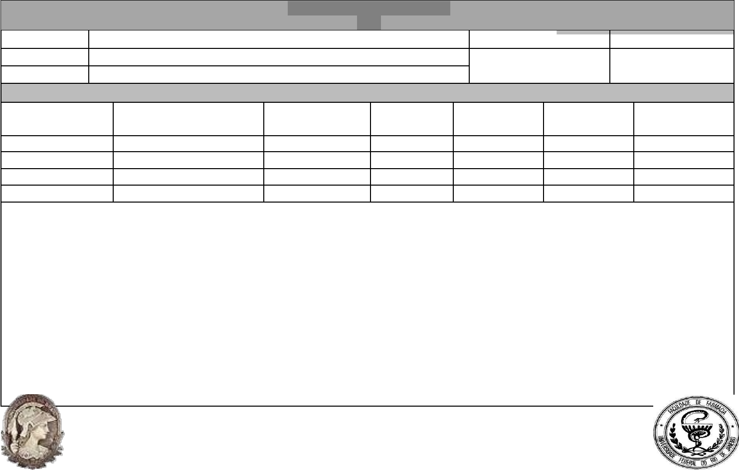 Laboratório de Farmacotécnica –UFRJ Aluno/DRE: Data de manipulação Aluno/DRE: NOTA: Aluno/DRE: Solução de Citrato de Sódio Matéria-prima Função Fórmula Unitária (mg/ml) Fórmula (%) Quantidade requerida Peso real Pesado por Citrato de sódio Substância tampão 2 mEq 19,6 g 20,00 g Metilparabeno Conservante 0,1 0,1 g 0,118 g Xpe Aromatizado Aromatizante / edulcorantes 10 10 mL 10 mL Água destilada qsp Veículo 100 mL 100 mL 70 mL Técnica de Preparo: Primeiramente, aferiu-se o bequer para 100mL com o auxílio da medição desse vomule de água em uma proveta e marcou com o menisco. Em seguida, foram pesados os componentes sólidos em balança analítica: 20,00 g de citrato de sódio e 0,118 g de metilparabeno e o componente líquido foi medido em uma proveta: 10 mL de xarope de groselha. Paralelamento, foram adicionados 40 mL de água destilada no beque para aquecimento, em seguida transferiu-se o metilparabeno em constante agitação, com o auxilio do bastão de vidro, para sua completa solução. Deixou esfriar por aproximadamente 3 minutos e foi adicionado mais um pouco de água destilada para então transferir o citrato de sódio. Após citrato de sódio adicionado e agitado até sua completa solubilização, deixou esfriar novamente para então ser transferido o xarope de groselha em uma solução bem fria. Depois de solubilizados os componentes, o bequer foi avolumado para o volume de 100 mL. Ao final, filtrou-se a solução, com funil e papel filtro. A solução filtrada foi evasada em seu respectivo frasco devidamente rotulado. Universidade Federal do Rio de Janeiroaculdade de Farmácia Departamento de Fármacos e Medicamentos Disciplina de Farmacotécnica 1 Ordem de Manipulação – Aula Prática o Cálculos No laboratório dispomos de Metilparabeno (Nipagin) com teor de 98% e o Citrato de sódio com teor de 99,2%. Quanto deve ser pesado de cada componente, em gramas, para atender esta formulação? Massa molar do citrato de sódio: 258,07 g O componente sólido do citrato de sódio em laboratório era dihidratado: 2 moléculas de água Massa molar corrigida do citrato de sódio: 294 g Valência: 3 Eqg: 294/3 = 98 g mEqg = 1/1000 * Eqg mEqg = 0,098 g 1mEqg citrato ---------- 0,098 g 0,1 % (p/v) de metilparabeno = 0,1 g por 100 mL de metilparabeno 2mEqg citrato ---------- x X = 0,196 g -------- 1 mL Y ------------ 100 mL Y = 19,6 g de citrato de sódio Controle de Qualidade Embalagem Volume pH Validade Aspecto visual Odor Foi usado um frasco de vidro para evasar a solução 100 mL 8,0 09/08/2022 Técnica de produção – Operações farmacêuticas realizadas / vidrarias / utensílios / equipamentos Laboratório de Farmacotécnica –UFRJ Aluno/DRE: Marcelly Cristina Silva lima / 119096548 Data de manipulação 09/05/2022 Aluno/DRE: Ariel Maria Felix Valério / 119041056 NOTA: Aluno/DRE: Solução de Joulie Matéria-prima Função Fórmula Unitária (mg/ml) Fórmula (%) Peso Lote Peso real Pesado por Fosfato dibásico de sódio heptahidratado Agente tamponador 135g 6,75 g 6,757 g Ácido ortofosfórico 85% Acidificante 58,5g 2,925 g 2,96 g Metilparabeno Conservante 0,1 0,05 g 0,058 g Água destilada qsp Veículo 1000 mL 50 mL 40 mL Técnica de Preparo: Cálculos No laboratório dispomos do fosfato dibásico anidro e com teor de 90%. Quanto deve ser pesado, em gramas, para atender esta formulação? Fosfato dibásico de sódio heptahidratado: 135 g 135 g ------------- 1000 mL X ----------------- 50 mL X = 6,75 g de Fosfato dibásico de sódio heptahidratado Metilparabeno: 0,1 % (p/v) 0,1 g ---------- 100 mL Ácido ortofosfórico 85%: 58,5 g z ------------- 50 mL Z = 0,05 g de Metilparabeno 58,5 g ----------- 1000 mL Y --------------- 50 mL Y = 2,925 g de Ácido ortofosfórico Controle de Qualidade Embalagem Volume pH Validade Aspecto visual Odor Foi usado um frasco de vidro para evasar a solução 50 mL 4/5 09/08/2022 Técnica de produção – Operações farmacêuticas realizadas / vidrarias / utensílios / equipamentos