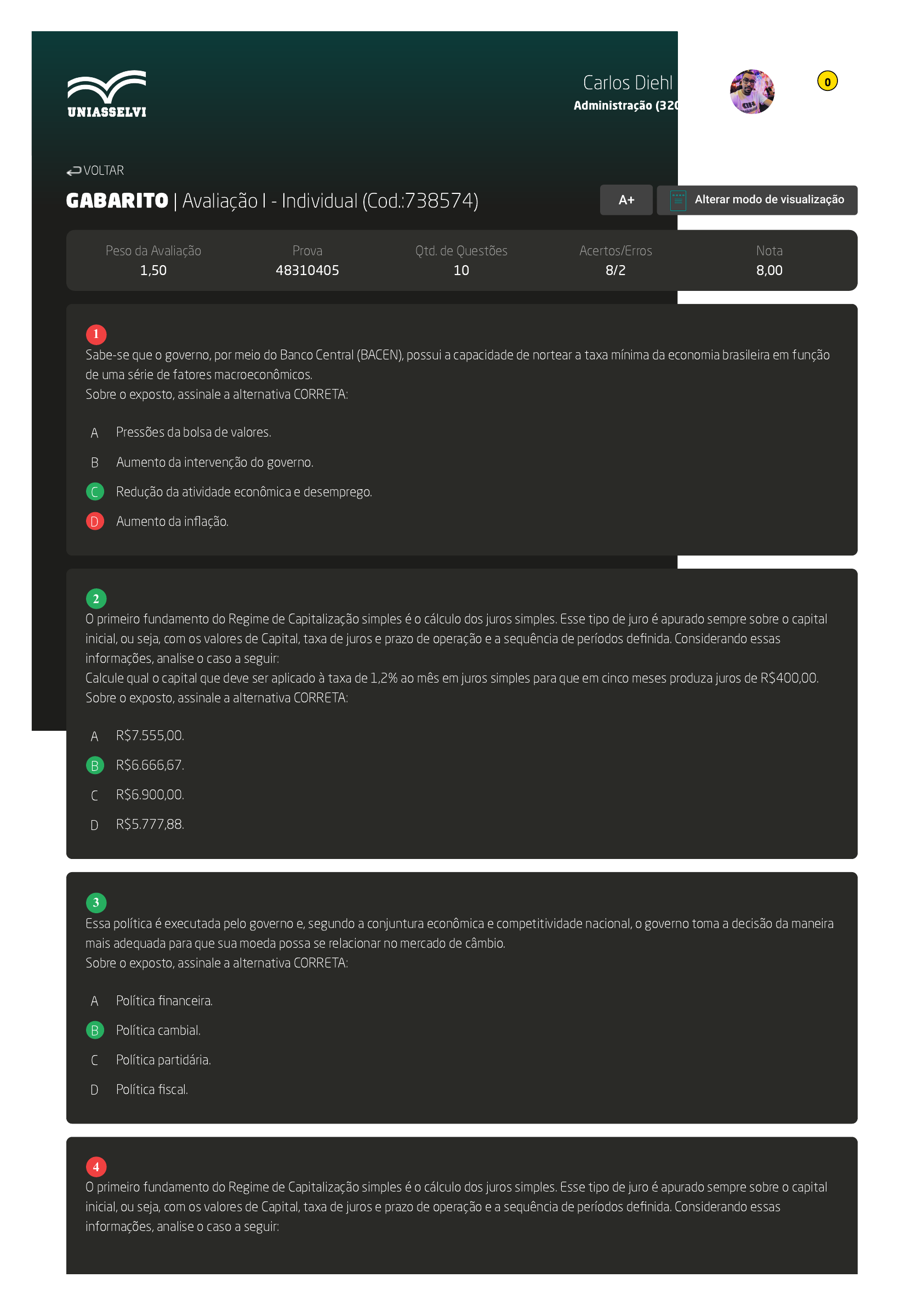 30/05/2022 19:08 AVA https://ava2.uniasselvi.com.br/subject/grades-and-tests/answer-book/eyJ0ZXN0Ijp7InRlc3RDb2RlIjoiNzM4NTc0IiwiZGVzY3JpcHRpb24iOiJBdmFsaWHDp8OjbyBJIC0gSW5kaXZpZHVhbCIsInBhcmFtZXRlciI6MTI5Mj… 1/3 GABARITO | Avaliação I - Individual (Cod.:738574) Peso da Avaliação 1,50 Prova 48310405 Qtd. de Questões 10 Acertos/Erros 8/2 Nota 8,00 Sabe-se que o governo, por meio do Banco Central (BACEN), possui a capacidade de nortear a taxa mínima da economia brasileira em função de uma série de fatores macroeconômicos. Sobre o exposto, assinale a alternativa CORRETA: A Pressões da bolsa de valores. B Aumento da intervenção do governo. C Redução da atividade econômica e desemprego. D Aumento da inflação. O primeiro fundamento do Regime de Capitalização simples é o cálculo dos juros simples. Esse tipo de juro é apurado sempre sobre o capital inicial, ou seja, com os valores de Capital, taxa de juros e prazo de operação e a sequência de períodos definida. Considerando essas informações, analise o caso a seguir: Calcule qual o capital que deve ser aplicado à taxa de 1,2% ao mês em juros simples para que em cinco meses produza juros de R$400,00. Sobre o exposto, assinale a alternativa CORRETA: A R$7.555,00. B R$6.666,67. C R$6.900,00. D R$5.777,88. Essa política é executada pelo governo e, segundo a conjuntura econômica e competitividade nacional, o governo toma a decisão da maneira mais adequada para que sua moeda possa se relacionar no mercado de câmbio. Sobre o exposto, assinale a alternativa CORRETA: A Política financeira. B Política cambial. C Política partidária. D Política fiscal. O primeiro fundamento do Regime de Capitalização simples é o cálculo dos juros simples. Esse tipo de juro é apurado sempre sobre o capital inicial, ou seja, com os valores de Capital, taxa de juros e prazo de operação e a sequência de períodos definida. Considerando essas informações, analise o caso a seguir: VOLTAR A+ Alterar modo de visualização 1 2 3 4 Carlos Diehl Neto Administração (3208779) 0 30/05/2022 19:08 AVA https://ava2.uniasselvi.com.br/subject/grades-and-tests/answer-book/eyJ0ZXN0Ijp7InRlc3RDb2RlIjoiNzM4NTc0IiwiZGVzY3JpcHRpb24iOiJBdmFsaWHDp8OjbyBJIC0gSW5kaXZpZHVhbCIsInBhcmFtZXRlciI6MTI5Mj… 2/3 Um investidor aplicou a quantia de R$1.000,00 durante cinco meses e rendeu juros de R$50,00. Nesse contexto, determine a taxa mensal dessa aplicação em juros simples. Sobre o exposto, assinale a alternativa CORRETA: A R$1.012,50. B R$1.075,00. C R$1.023,00. D R$1.008,75. Um certificado de depósito bancário (CDB) possui capital de R$ 35.000,00 taxa de juros de 20% ao ano e prazo de três trimestres. Sobre o valor futuro (montante) a se resgatar, assinale a alternativa CORRETA: A R$ 15.250,00 B R$ 29.750,00. C R$ 40.250,00. D R$ 5.250,00. As taxas de juros em uma economia vão se estabelecendo conforme a oferta de emprestar, e demanda do recurso monetário, ou seja, os agentes econômicos que tiverem capital para emprestar procuram rentabilidade pelo uso de seu capital (investimentos); isto é, geração de juros por meio de uma taxa. Entretanto, o interesse real de emprestar por parte dos investidores fica em função de alguns fatores. Sobre esses fatores, classifique V para as sentenças verdadeiras e F para as falsas: ( ) Aumento da taxa de juros básica do FED (Federal Reserve) nos Estados Unidos. ( ) O nível de risco que o investidor esteja disposto a aceitar. ( ) Pressões inflacionárias. ( ) O nível de rentabilidade que o investidor esteja aspirando.Assinale a alternativa que apresenta a sequência CORRETA: A F - V - F - V. B V - V - F - F. C F - F - V - V. D V - F - V - F. É o conjunto de medidas do governo que tem por objetivo controlar o volume de moeda (dinheiro) em circulação e o montante de crédito disponível na economia. Sobre o exposto, assinale a alternativa CORRETA: A Política de dinheiro. B Política eficaz. C Política econômica. D Política monetária. A fim de garantir a observância de determinados valores e princípios norteadores, o Estado intervém, de forma legítima, no domínio econômico. Sobre o exposto, assinale a alternativa CORRETA: A As empresas públicas e as sociedades de economia mista só poderão gozar de privilégios fiscais não extensivos às do setor privado quando necessário aos imperativos da segurança nacional ou a relevante interesse coletivo. 5 6 7 8 Carlos Diehl Neto Administração (3208779) 0 30/05/2022 19:08 AVA https://ava2.uniasselvi.com.br/subject/grades-and-tests/answer-book/eyJ0ZXN0Ijp7InRlc3RDb2RlIjoiNzM4NTc0IiwiZGVzY3JpcHRpb24iOiJBdmFsaWHDp8OjbyBJIC0gSW5kaXZpZHVhbCIsInBhcmFtZXRlciI6MTI5Mj… 3/3 B O Estado, considerados os princípios gerais da ordem econômica, pode regular, por via legislativa, a política de preços de bens e serviços de determinado segmento econômico. C O Estado, como agente normativo e regulador da atividade econômica, exercerá, na forma da lei, as funções de fiscalização, incentivo e planejamento, sendo este determinante e impositivo para os setores público e privado. D A ordem econômica, fundada na valorização do trabalho humano e na livre iniciativa, obedecerá, dentre outros, aos princípios da soberania nacional, do dirigismo econômico e da redução das desigualdades regionais e sociais. Quando identificamos a soma de todas as riquezas geradas durante um período por região, estamos tratando de um determinado indicador. Sobre esse indicador, assinale a alternativa CORRETA: A PIB. B Juros. C Taxa de câmbio. D Inflação. O primeiro fundamento do Regime de Capitalização simples é o cálculo dos juros simples. Esse tipo de juro é apurado sempre sobre o capital inicial, ou seja, com os valores de Capital, taxa de juros e prazo de operação e a sequência de períodos definida. Considerando essas informações, calcule o juro a ser pago por um empréstimo de R$9.200,00 se aplicada a taxa de 5% ao trimestre e durante o tempo de quat