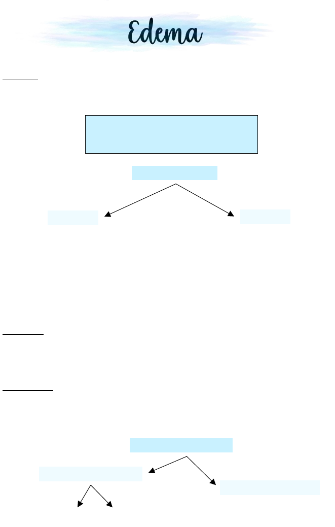 Edema - Clasificación Localización Generalizado • TVP u otra obstrucción venosa (tumor) • Inflamatorio • Infección • Traumático • Angioedema • Obstrucción linfática • Insuficiencia Cardiaca • Insuficiencia Renal o Discrasico • Síndrome Nefrótico • Hepatopatía Crónica Agua Corporal Total 60% Liquido Extracelular 20% Liquido Intracelular 20% Liquido Intersticial 15% Plasma 5% • Definición: Acumulación de un exceso de líquido en el espacio intersticial tanto para los tejidos profundos como para los superficiales generando tumefacciones de la dermis y tejido celular subcutáneo, el paciente refiere como “hinchazón”. • Localizados: Alteraciones en la Ley de Starling, en diferentes órganos o regiones. → Trombosis venosa profunda. → Infecciones: celulitis • Generalizados: Alteraciones de la Ley de Starling + la retención de agua y sodio en el espacio intersticial. • Por día se filtra unos 20 litros de sangre y se reabsorben en la parte final del capilar unos 17 litros • Quedando unos 3 litros que serán absorbidos por los vasos linfáticos a través de sus poros y sistemas valvulares. Edema Generalizado + Compromiso de las Serosas ANASARCA Clasificación Edema Oculto Mixedema • Acumulación de mucopolisacárido en el espacio intersticial (Infiltración en la piel) • No deja Fóvea • Lo encontramos en pacientes con hipotiroidismo (tiroides) • Posee una piel → Amarillenta → Fría → Áspera → Seca → Escamosa • Es cuando el paciente permanece mucho tiempo de pie o sentado. → Leve → Bilateral → Simétrica • Godet mínimo • Hiperreactividad muscular producida por un desequilibrio hidroelectrolítico. • Puede aparecer en caquexia. • Signo del Rodete Positivo. → Percutir el musculo y se observa la contracción → Pinza digital Linfedema • Es el exceso de líquido no espacio intersticial, debido a la diminución da absorción do liquido extracelular por los vasos linfáticos • Dada a una obstrucción linfática por proteínas. • Su carácter es: → Crónico → Duro y Elástico. • Puede dar un Godet mínimo. Mioedema Lipedema Tumefacción o Hinchazón Lisura Perdida de la elasticidad Características generales de Edema • Infiltración de líquido que no llega a los 3-5 litros • Para poder evidenciar es necesario pesar al paciente. • No deja Fóvea • Para completar los factores enunciados en la Ley de Starling, una perturbación en el drenaje linfática como: → Linfedema idiopático o primario → Neoplasia después de radioterapia → Posquirúrgico • Es la presencia de proteínas que pasan al espacio intersticial. 1º - Aumento de la presión hidrostática Locale s Generales • Alteran el retorno por obstrucción → Trombosis venosa → Tromboflebitis → Insuficiencia venosa crónica. • Trastornos en la circulación venocapilar → Estado varicoso → Alteración de la bomba muscular venosa • La más detectable es la insuficiencia cardiaca congestiva. • Puede generarse por cifras de Albuminemia inferior a 2-2,5 g/dLt. → Dificultad en la síntesis (cirrosis, hepatopatías crónicas) → Mayor destrucción → Perdidas entéricas excesivas (SMA) o renales. → Desnutrición grabe. 3º - Alteración de la permeabilidad capilar Causa Locales Causas Generales • Inflamatoria: → Alergia o hipersensible edad → Fármacos o tóxicos → Traumatismo → Celulitis → Quemaduras 4º - Disminución de la reabsorción linfática. 2º - Disminución de la presión oncótica del plasma • Fisiopatología: El edema se debe a un pasaje de líquido del espacio intravascular al espacio intersticial por alteraciones de los mecanismos fisiológicos y de regulación y distribución del agua y electrolitos. • Alteraciones de las fuerzas de Starling: 1º - Aumento de la presión hidrostática. PH 2º - Disminución de la presión oncótica del plasma. PO 3º - Alteración o Aumento de la permeabilidad capilar. • Retención de agua y sodio. 4º - Disminución de la reabsorción linfática. Configura una situación de Mecanismo generales de retención de agua y sodio Edema Generalizado Exceso hidrosalino en espacio intersticial Tercero espacio Desplazamiento del espacio vascular hacia el intersticio (Que normalmente contiene el 20% del agua total y hasta 15% del peso corporal) De esta manera se crea un llamado (Tercero espacio, Incluyen, derrame pleural, ascitis, hidropericardio. No se intercambia fácilmente, se pierde la actividad y movilidad de estos compartimientos.) ¿Por qué la insuficiencia cardiaca congestiva tiene edema con hipervolemia arterial afectiva? Es por una mayor presión hidrostática capilar, por hipertensión venosa y con un minuto disminuido. Cuadro 12-2: Edema y su relación con la volemia Estado de la volemia Mecanismo Ejemplos Hipovolemia arterial afectiva Retención hidrosalino secundaria • Insuficiencia Cardiaca congestiva. • Cirrosis hepática • Síndrome nefrótico Hipervolemia Retención hidrosalina primaria • Insuficiencia renal • Glomerulonefritis aguda. 1º ¿Dónde se localiza? Localizado • Alrededor de ojos y cara (zonas laxas) • En cara cuello y brazo • En una extremidad superior o inferior • Región lumbar Generalizado • Compromete el intersticio de la mayor parte del cuerpo. 2º ¿Cuándo comenzó, apareció y cómo evolucionó? Forma de inicio • Rápido • Gradual Ritmo de Aparición • Nocturno • Matinales • Periódico 3º ¿Cómo es? • Temperatura: conservado, frio, caliente • Sensibilidad: dolorosa o indoloro. • Colorido de la piel: rojo, pálido, cianótico • Consistencia: moderada, duro, o blando 4º ¿Qué factores lo desencadenan o agravan? • Ingreso de sal • Ciclo menstrual • Bipedestación prolongada 5º ¿Qué factores lo atenúan o alivian? • Durante el reposo 6º ¿Qué síntomas lo acompañan? • Disnea • Diarrea • Dolor abdominal • Dolor en las piernas • Alteraciones tróficas de las pierna