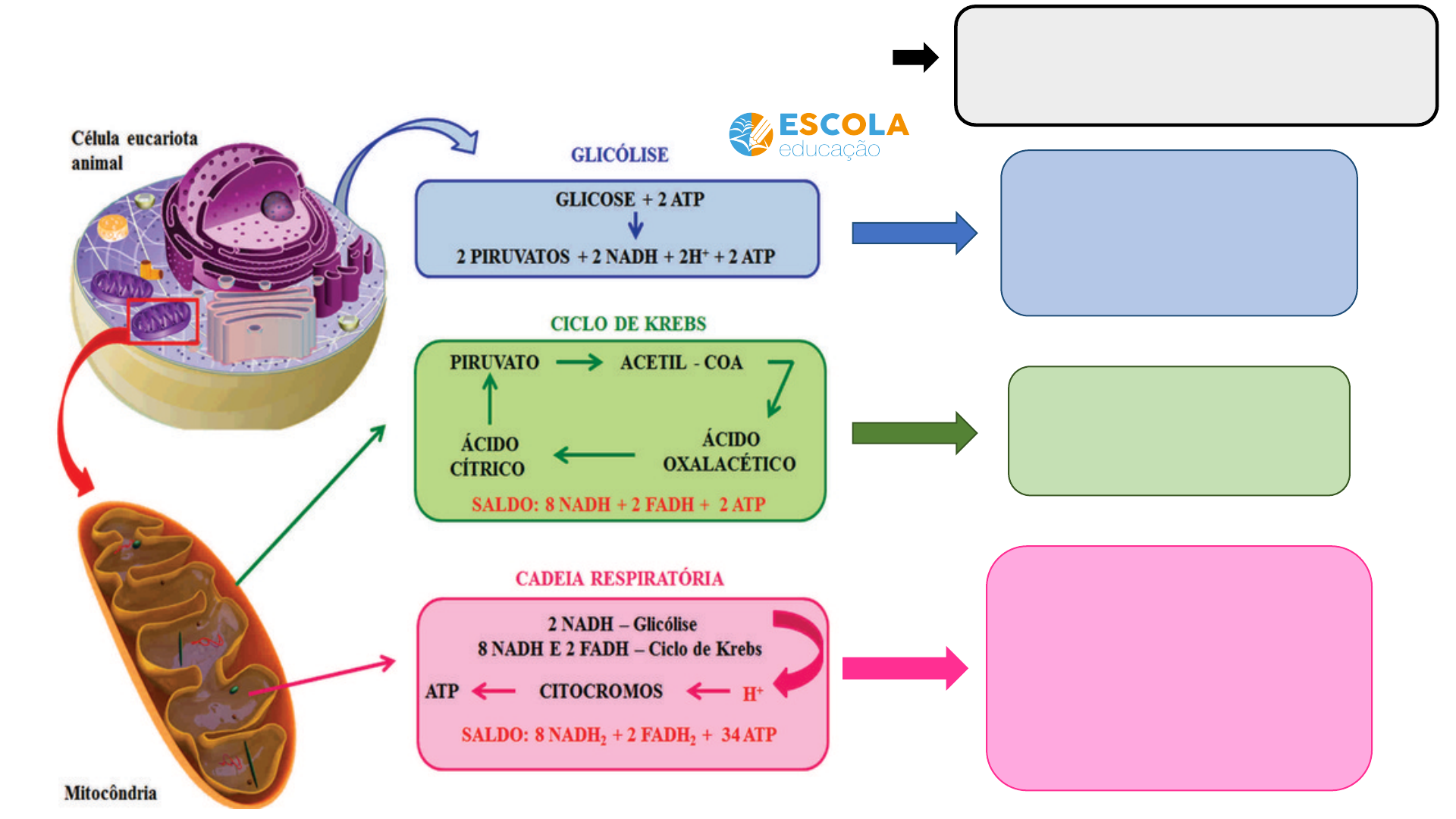 Respiração Celular Processo bioquímico para a produção de energia (ATP) que ocorre no citosol e nas mitocôndrias das células Ocorre no citosol Anaeróbico (sem O2) Oxidação parcial da glicose É o combustível para que a respiração celular comece Ocorre na matriz mitocondrial Ciclo do ácido cítrico Produz CO2, elétrons energizados e ATP Fosforilação oxidativa Ocorre nas cristas mitocondriais Sequência de substâncias transportadoras Etapa com maior produção de ATP com ajuda da proteína ATP sintase Libera água para ser usada como combustível