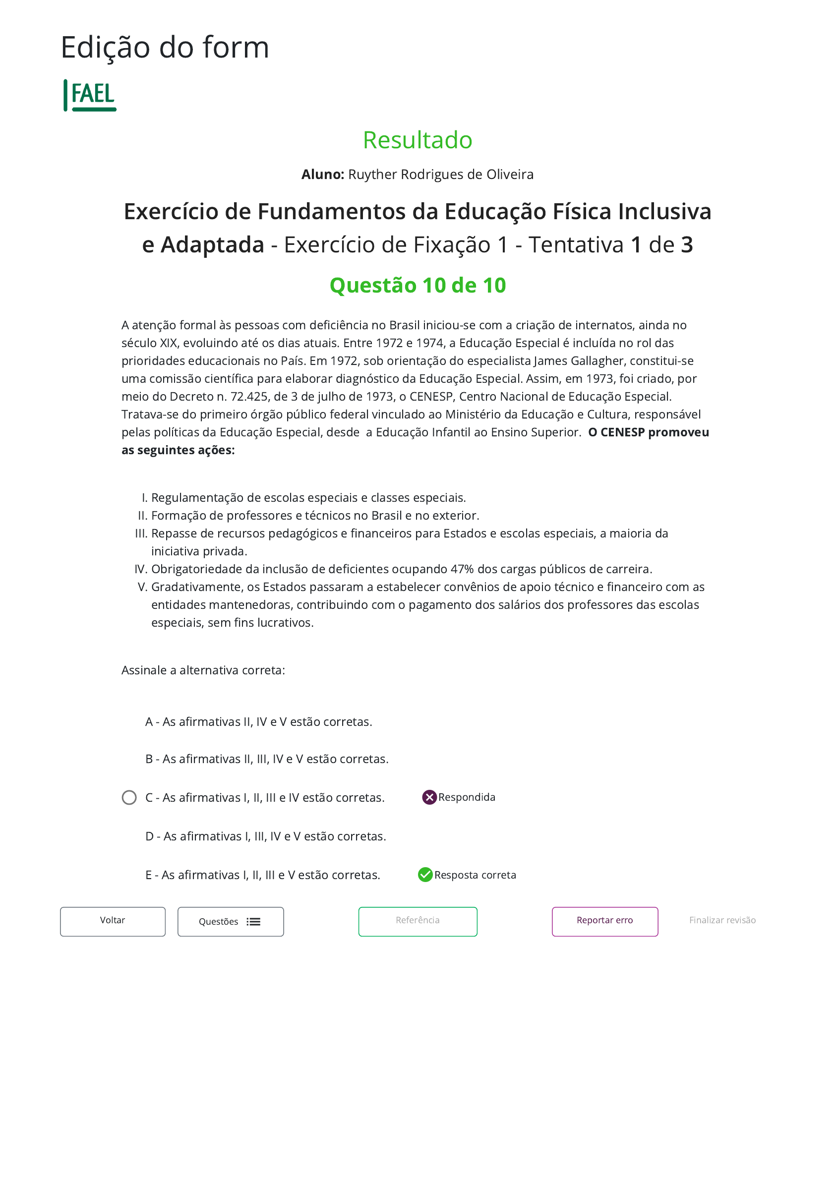 01/06/2022 20:26 Firequiz firequiz.fael.edu.br/prova?question_number=10 1/1 Edição do form Resultado Aluno: Ruyther Rodrigues de Oliveira Exercício de Fundamentos da Educação Física Inclusiva e Adaptada - Exercício de Fixação 1 - Tentativa 1 de 3 Questão 10 de 10 A atenção formal às pessoas com de�ciência no Brasil iniciou-se com a criação de internatos, ainda no século XIX, evoluindo até os dias atuais. Entre 1972 e 1974, a Educação Especial é incluída no rol das prioridades educacionais no País. Em 1972, sob orientação do especialista James Gallagher, constitui-se uma comissão cientí�ca para elaborar diagnóstico da Educação Especial. Assim, em 1973, foi criado, por meio do Decreto n. 72.425, de 3 de julho de 1973, o CENESP, Centro Nacional de Educação Especial. Tratava-se do primeiro órgão público federal vinculado ao Ministério da Educação e Cultura, responsável pelas políticas da Educação Especial, desde a Educação Infantil ao Ensino Superior. O CENESP promoveu as seguintes ações: I. Regulamentação de escolas especiais e classes especiais. II. Formação de professores e técnicos no Brasil e no exterior. III. Repasse de recursos pedagógicos e �nanceiros para Estados e escolas especiais, a maioria da iniciativa privada. IV. Obrigatoriedade da inclusão de de�cientes ocupando 47% dos cargas públicos de carreira. V. Gradativamente, os Estados passaram a estabelecer convênios de apoio técnico e �nanceiro com as entidades mantenedoras, contribuindo com o pagamento dos salários dos professores das escolas especiais, sem �ns lucrativos. Assinale a alternativa correta: A - As a�rmativas II, IV e V estão corretas. B - As a�rmativas II, III, IV e V estão corretas. C - As a�rmativas I, II, III e IV estão corretas. Respondida D - As a�rmativas I, III, IV e V estão corretas. E - As a�rmativas I, II, III e V estão corretas. Resposta correta Voltar Questões Referência Reportar erro Finalizar revisão http://firequiz.fael.edu.br/prova?question_number=9 http://firequiz.fael.edu.br/prova/questoes