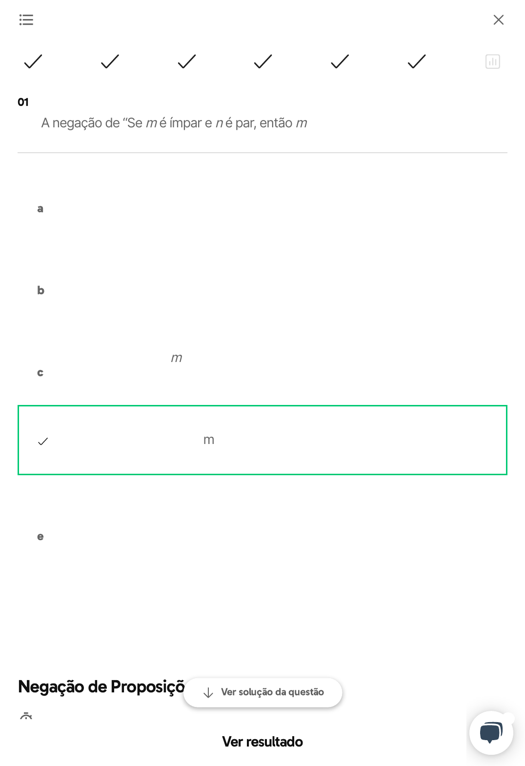 Negação de Proposições Lógicas Suas anotações 01 A negação de “Se m é ímpar e n é par, então m + n é par” é: a Se m é par e n é ímpar, então m + n é ímpar b Se m é ímpar e n é par, então m + n é ímpar c Se m + n é ímpar, então m é par ou n é par m é ímpar, n é par e m + n é ímpar e m é par, n é ímpar e m + n é par Ver solução da questão Ver resultado 1