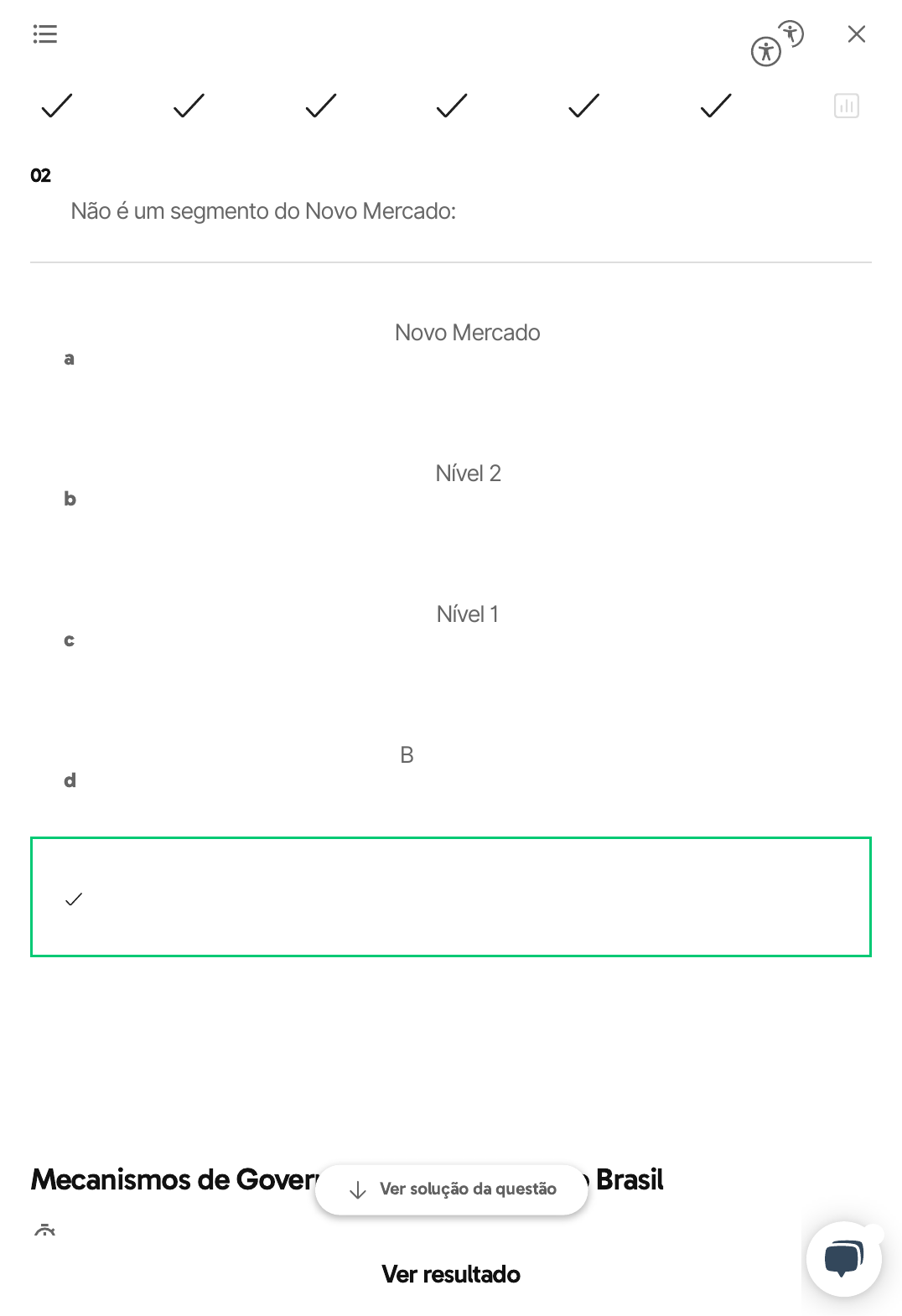 Mecanismos de Governança Corporativa no Brasil Suas anotações 02 Não é um segmento do Novo Mercado: a Novo Mercado b Nível 2 c Nível 1 d Bovespa Mais ISO 9001 Ver solução da questão Ver resultado 1