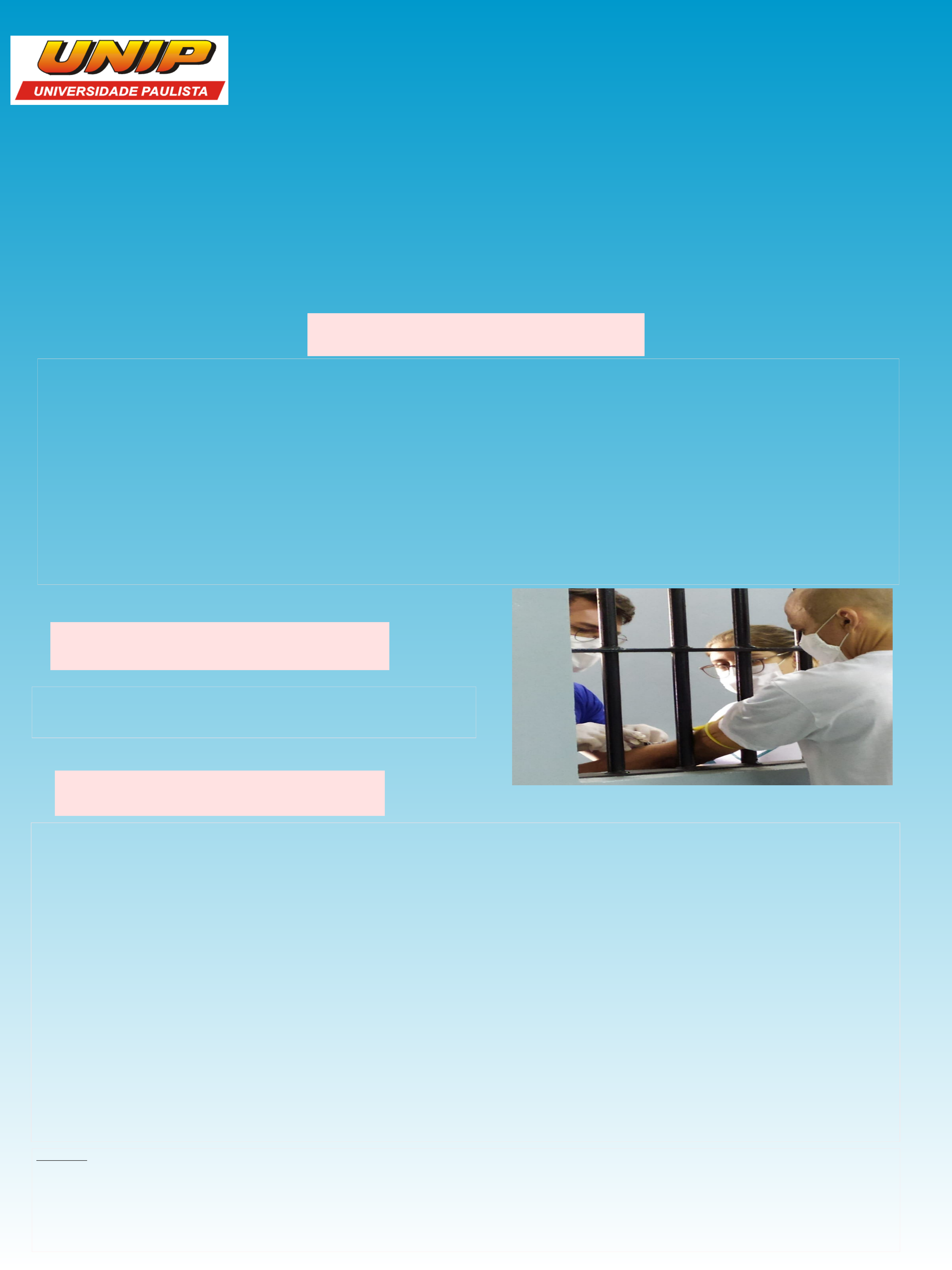 INFECÇÃO SEXUALMENTE TRANSMISSÍVEL (IST) NO SISTEMA PENITENCIÁRIO FEMININO – Revisão de Literatura Autor*:Leticia Carla Cian, Layane Gabrielle Tamarossi, Isadora Emília Maia da Costa Orientadora**: Prof.ª Dra. Rosemeire Aparecida Milhim Cordova Referências: ALCÂNTARA, R. L. S.; SOUSA, C. P. C; SILVA, T. S. M. Infopen mulheres de 2014 e 2018: desafios para a pesquisa em psicologia. Psicologia, Ciência e Profissão, Brasília, v. 39, n. esp2, p. 88-101, 2018. DOI: https://doi.org/10.1590/1982-3703000212154. Acesso em: 22 abril de 2022. Ministério da Justiça e Segurança Pública (Brasil). Relatório temático sobre mulheres privadas de liberdade - junho de 2017. Brasília: Departamento Penitenciário Nacional – DEPEN, 2019. Disponível em: http://antigo.depen.gov.br/DEPEN/depen/sisdepen/infopen-mulheres/copy_of_Infopenmulheresjunho2017.pdf. Acesso em: 30 abril. 2022 *Estudantes do Curso de enfermagem da Universidade Paulista – UNIP, campus JK. **Professora do curso de graduação em enfermagem, disciplina de Projeto Técnico Cientifico Interdisciplinar – UNIP. UNIVERSIDADE PAULISTA – UNIP Instituto de Ciências da Saúde – ICS Curso Enfermagem – Campus JK O Brasil é um país com alta criminalidade, apresenta a quarta maior população carcerária do mundo, ele é considerado a quinta maior população do planeta. O Levantamento Nacional de Informações Penitenciárias (INFOPEN) constatou que no ano de 2017 a população prisional brasileira foi de 726.354. Portanto a quantidade de unidade carcerárias não atende a demanda de prisioneiros, tornando o local sobrecarregado, sendo assim uma vida que deveria apenas ser privada de liberdade, acaba sendo privada dos direitos básicos e públicos, por exemplo o Sistema Único de Saúde (SUS) ALCÂNTARA, R. L. S.; SOUSA, C. P. C; SILVA, T. S. M. 2014). Há algumas décadas, especificamente na década de 80, a maioria da população infectada pelas Infecções Sexualmente Transmissíveis (IST) eram da classe social alta, escolaridade superior, brancos e homossexuais. Nos dias atuais a infecção expandiu-se a população de baixa classe social e escolaridade, aos negros, heterossexuais, especialmente a população feminina (Ministério da Justiça e Segurança Pública Brasil, junho de 2017). Tipo de Estudo Trata-se de um estudo de caráter exploratório e descritivo do tipo revisão de literatura. A formulação e identificação do problema de pesquisa se deu por meio da indagação: Qual a prevalência e os fatores associados a IST nas diferentes prisões do Brasil? Coleta de dados Para alcançar os objetivos, serão pesquisados artigos dos últimos seis anos nas bases de dados Bireme, na base de dados: LILACS (Literatura Latino Americana e do Caribe em Ciências e Saúde), MEDLINE (Literatura Internacional em Ciências e Saúde) e Scielo. Foi primeiramente identificado os descritores, junto à base de dados da Biblioteca Virtual de Saúde (Descritores de Ciências da Saúde – DeCs), a saber: Infecção Sexualmente Transmissível, epidemiologia, prisão. Dos critérios de inclusão e exclusão, foram incluídas as pesquisas publicadas em periódicos nacionais e internacionais, disponíveis na íntegra, com descritores no português/inglês e que abordassem o tema “IST prevalentes e fatores de risco no sistema prisional brasileiro”, assim como pesquisas publicadas entre janeiro de 2016 a outubro de 2021. A exclusão será por meio das seguintes etapas: período anterior ao estabelecido, publicações como dissertações de mestrados/tese de doutorado, resumos de congressos e trabalho de conclusão de curso, cartas do editor. Conhecer as produções científicas sobre as Infecções sexualmente transmissíveis (IST) na população privadas de liberdade no Brasil. INTRODUÇÃO MATERIAL E MÉTODOS OBJETIVO GERAL Ação de educação de saúde no sistema penitenciário, 2021.