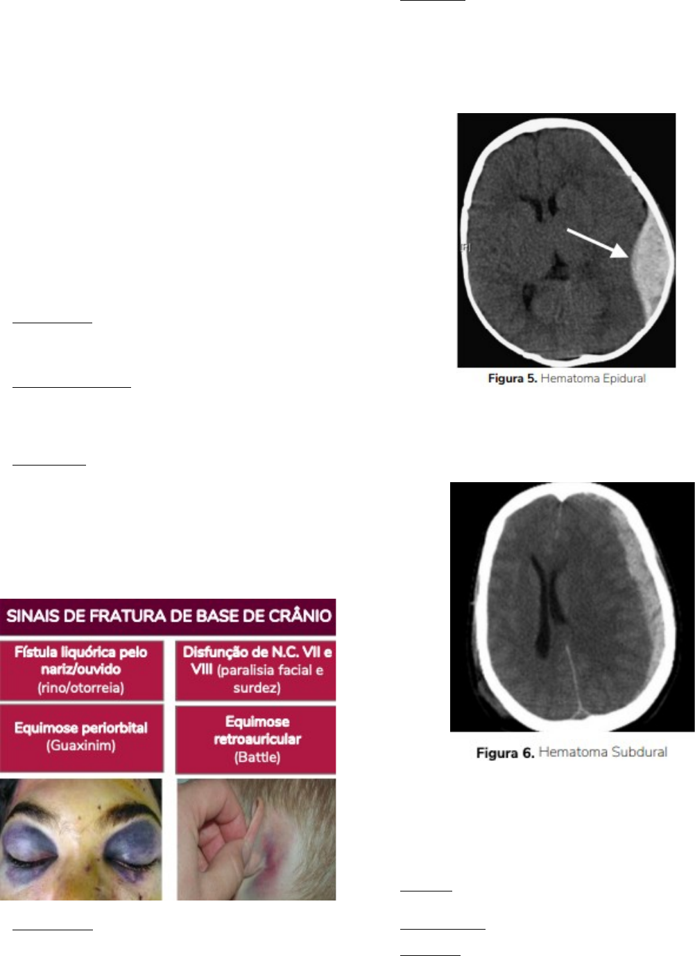 TRAUMATISMO CRANIOENCEFÁLICO (TCE) DEFINIÇÃO E EPIDEMIOLOGIA 75% dos pacientes com lesão cerebral possuem trauma leve e 10% grave. A triagem do paciente com TCE depende da gravidade da lesão ETIOLOGIA Agressões físicas/violência urbana (com ou sem o uso de armas brancas ou de fogo): Menos comuns. Quedas (da própria altura ou de uma altura maior): Mais em mulheres e idosos. Acidentes com meios de transporte: Mais incidência em homens e jovens. Nos últimos 20 anos, a acentuada melhora do índice na mortalidade global associada a lesões traumáticas cerebrais e da medula espinal pode, em grande parte, ser atribuída ao tratamento aperfeiçoado nas unidades de terapia intensiva, intervenção neurocirúrgica agressiva precoce e prevenção de condições a longo prazo, como trombose venosa profunda e úlceras de decúbito FISIOPATOLOGIA 1. Fase inicial: Corresponde ao insulto inicial, por cisalhamento, penetração, aceleração ou desaceleração sendo o momento da ocorrência das lesões primárias. Inicia o metabolismo anaeróbio; produção de lactato; apoptose e morte celular. 2. Fase Intermediária: Se caracteriza pelo comprometimento do balanço hidroeletrolítico e pela presença de um processo inflamatório importante, que pode culminar em um quadro de edema cerebral. Mensageiros químicos e celulares são sensibilizados bem como o receptor Aquaporina. 3. Fase Final: fase de aparecimento das sequelas e complicações, sendo causada devido a alterações do circuito neuronal, sendo justamente a fase em que o tratamento do TCE visa evitar no paciente. Alto reparo ocasiona morte celular e epilepsia. MORFOLOGIA Fraturas: As principais são as de calota e as de base de crânio. Fazer TC mas exame físico já percebe-se. Lesões intracranianas: Lesão Difusa= associadas a acidentes de alto impacto ou de desaceleração, sendo normalmente causado por hipóxia ou isquemia. Pacientes costumam apresentar déficit neurológico não focal e perda de consciência. Na TC encontra-se inchaço, perda da distinção entre cinza e branco e hemorragias pontilhadas entre as substâncias cinzenta e branca (essa última conhecida como lesão axonal difusa (LAD), que é um indicativo de lesão severa). Lesão Focal=São os vários hematomas que podem ocorrer. Hematoma Epidural: É um tipo relativamente raro, estando presente em apenas 0,5% dos pacientes com TCE. A causa mais comum de sua origem é um sangramento arterial por lesão da Artéria Meníngea Média. O sangramento empurra a dura para o lado oposto da estrutura óssea do crânio dando aspecto de biconvexo na TC. Hematoma Subdural: Presente em cerca de 30% dos pacientes com TCE grave. A principal causa é a ruptura de pequenos vasos superficiais ou vasos ponte do córtex cerebral, de modo que não mais ocorre o deslocamento da dura e aí o sangue se acumula no espaço subaracnoide. O aspecto na TC é de côncavo-convexo. Contusão e Hematoma Intracerebral: Presentes em cerca de 20-30% dos pacientes com TCE grave - normalmente nos lobos frontal e temporal. Cerca de 20% desses pacientes, dentro de horas a dias, evolui para um hematoma intracraniano ou para uma contusão coalescente com efeito de massa que exige evacuação cirúrgica. QC TCE leve: Cefaléia, dificuldade de concentração, ansiedade e sono perturbado. EF é normal, mas avaliação neuropsicológica pode revelar anormalidades. TCE moderado: Comprometimento cognitivo, motor e sensitivo, e fala prejudicada. Exame neurológico anormal. TCE grave: Pacientes em coma. No “melhor” estado, alguma abertura dos olhos e postura de decorticação ou postura de descerebração aos estímulos. OBS: Lesões focais causam déficits neurológicos relacionados com o local do impacto. Lobos orbitofrontais e temporais anteriores são mais comumente afetados. Extrema vigilância é necessária para reconhecer o desenvolvimento de hematomas e edema retardados, que podem se manifestar dias mais tarde. Lesão cerebral traumática pode ser acompanhada por um aumento transitório na pressão arterial sistêmica podendo se desenvolver apneia ou disfunção cerebral. Dependendo do grau de lesão, a resolução espontânea pode ser retardada, e a laceração da microvasculatura exacerbará esta lesão. LESÕES AOS PARES CRANIANOS PELO TCE N. Olfatório (I): Anosmia e perda da sensibilidade gustativa para sabores aromáticos. Nervo comprometido nas fraturas do osso frontal, quando filamentos são lesados na placa cribriforme. N. Óptico (II): Cegueira unilateral completa ou queda importante da acuidade visual. Raro, ocorre em fratura do esfenóide. Pupila não é reativa, mas o reflexo consensual está preservado. N. Troclear (IV): Diplopia na mirada para baixo. Geralmente a lesão ocorre no TCE leve, e a clínica surge após alguns dias do trauma. Consequente a fraturas da asa menor do esfenóide. N. Facial (VII): Lesão direta decorrente da fratura de base de crânio, ocorrendo em 3% dos casos. A paralisia facial pode surgir após 5-7 dias do trauma. N. Vestibulococlear (VIII): Perda da audição, vertigem e nistagmo logo após o trauma. Lesão decorre de fratura do osso petroso. Faz diagnóstico diferencial com trombose da A. vertebral. ATENDIMENTO Primeira abordagem (avaliação primária): ATLS A= vias aéreas (VA); sempre observar se está num ambiente adequado B= respiração com paciente desacordado: ◊ realizar manobra de abertura de VA; paciente consciente: ◊ pedir para ele abrir a boca se necessário retirar corpos estranhos e secreções. Com GCS≤ 8 , risco de obstrução (hematoma cervical, lesão de faringe/traqueia), inadequação respiratória, comprometimento iminente da VA, apneia= REALIZAR VA DEFINITIVA (na traqueia e uso de balão) Obs: é muito importante estabilizar a cervical do paciente durante todo o atendimento, pelo risco de trauma raquimedular adjacente que acompanha um paciente vítima de TCE. C= circulação A hipotensão é uma ameaça importante pois ela afeta 