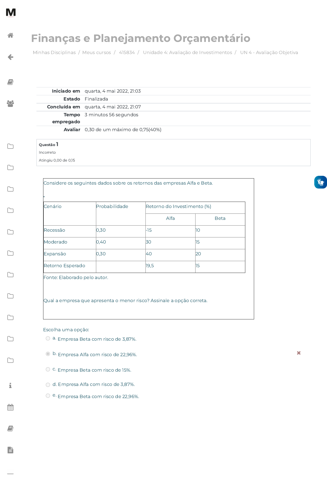 Minhas Disciplinas / Meus cursos / 415834 / Unidade 4: Avaliação de Investimentos / UN 4 - Avaliação Objetiva Finanças e Planejamento Orçamentário Iniciado em quarta, 4 mai 2022, 21:03 Estado Finalizada Concluída em quarta, 4 mai 2022, 21:07 Tempo empregado 3 minutos 56 segundos Avaliar 0,30 de um máximo de 0,75(40%) Questão 1 Incorreto Atingiu 0,00 de 0,15 Considere os seguintes dados sobre os retornos das empresas Alfa e Beta. Cenário Probabilidade Retorno do Investimento (%) Alfa Beta Recessão 0,30 -15 10 Moderado 0,40 30 15 Expansão 0,30 40 20 Retorno Esperado 19,5 15 Fonte: Elaborado pelo autor. Qual a empresa que apresenta o menor risco? Assinale a opção correta. Escolha uma opção: a. Empresa Beta com risco de 3,87%. b. Empresa Alfa com risco de 22,96%. c. Empresa Beta com risco de 15%. d. Empresa Alfa com risco de 3,87%. e. Empresa Beta com risco de 22,96%. https://avap.multivix.edu.br/my/ https://avap.multivix.edu.br/course/view.php?id=14104 https://avap.multivix.edu.br/course/view.php?id=14104§ion=5 https://avap.multivix.edu.br/mod/quiz/view.php?id=1032916 https://avap.multivix.edu.br/my/ https://avap.multivix.edu.br/course/view.php?id=14104 https://avap.multivix.edu.br/user/index.php?id=14104 https://avap.multivix.edu.br/course/view.php?id=14104§ion=1 https://avap.multivix.edu.br/course/view.php?id=14104§ion=2 https://avap.multivix.edu.br/course/view.php?id=14104§ion=3 https://avap.multivix.edu.br/course/view.php?id=14104§ion=4 https://avap.multivix.edu.br/course/view.php?id=14104§ion=5 https://avap.multivix.edu.br/course/view.php?id=14104§ion=6 https://avap.multivix.edu.br/course/view.php?id=14104§ion=7 https://avap.multivix.edu.br/course/view.php?id=14104§ion=8 https://avap.multivix.edu.br/course/view.php?id=14104§ion=9 https://avap.multivix.edu.br/course/view.php?id=14104§ion=10 https://avap.multivix.edu.br/course/view.php?id=14104§ion=11 https://avap.multivix.edu.br/mod/page/view.php?id=1252%2F%22%20target%3D%22_blank https://avap.multivix.edu.br/calendar/view.php/ https://avap.multivix.edu.br/local/staticpage/view.php?page=biblioteca https://portalweb.multivix.edu.br/gabaritos/login.aspx https://multivix.edu.br/office-365/ https://avap.multivix.edu.br/ Questão 2 Correto Atingiu 0,15 de 0,15 Leia as seguintes informações sobre o �uxo de caixa de um investimento: Ano I. Inicial FC 0 200.000 1 31.500 2 31.500 3 31.500 4 31.500 5 31.500 6 31.500 7 31.500 8 31.500 9 31.500 10 31.500 Fonte: Elaborado pelo autor. Com base nestas informações, calcule o payback descontado do investimento e se o projeto deve ser aceito, considerando que o prazo máximo para obter o retorno do dinheiro investido deve ser de 9 anos. Assinale a opção correta. Escolha uma opção: a. 9 anos, 10 meses e 2 dias. O projeto deve ser aceito b. 8 anos, 4 meses e 2 dias. O projeto deve ser aceito c. 9 anos, 10 meses e 2 dias. O projeto deve ser recusado d. 6 anos, 4 meses e 6 dias. O projeto deve ser recusado e. 6 anos, 4 meses e 6 dias. O projeto deve ser aceito https://avap.multivix.edu.br/my/ https://avap.multivix.edu.br/course/view.php?id=14104 https://avap.multivix.edu.br/user/index.php?id=14104 https://avap.multivix.edu.br/course/view.php?id=14104§ion=1 https://avap.multivix.edu.br/course/view.php?id=14104§ion=2 https://avap.multivix.edu.br/course/view.php?id=14104§ion=3 https://avap.multivix.edu.br/course/view.php?id=14104§ion=4 https://avap.multivix.edu.br/course/view.php?id=14104§ion=5 https://avap.multivix.edu.br/course/view.php?id=14104§ion=6 https://avap.multivix.edu.br/course/view.php?id=14104§ion=7 https://avap.multivix.edu.br/course/view.php?id=14104§ion=8 https://avap.multivix.edu.br/course/view.php?id=14104§ion=9 https://avap.multivix.edu.br/course/view.php?id=14104§ion=10 https://avap.multivix.edu.br/course/view.php?id=14104§ion=11 https://avap.multivix.edu.br/mod/page/view.php?id=1252%2F%22%20target%3D%22_blank https://avap.multivix.edu.br/calendar/view.php/ https://avap.multivix.edu.br/local/staticpage/view.php?page=biblioteca https://portalweb.multivix.edu.br/gabaritos/login.aspx https://multivix.edu.br/office-365/ https://avap.multivix.edu.br/ Questão 3 Incorreto Atingiu 0,00 de 0,15 Considere os seguintes cenários e seus retornos para os titulos X e Y. Cenário Probabilidade Retorno do Investimento (%) X Y Recessão 0,20 -20 5 Moderado 0,60 15 15 Expansão 0,20 50 20 Fonte: Elaborado pelo autor. Calcule o retorno esperado para cada título e de�na qual o melhor investimento, em seguida, assinale a opção correta. Escolha uma opção: a. Investir em qualquer titulo, ambos o titulos com retorno esperado de 15% b. Investir no titulo X com retorno esperado de 14% c. Investir no titulo Y com retorno esperado de 15% d. Investir no titulo Y com retorno esperado de 14% e. Investir no titulo X com retorno esperado de 15% https://avap.multivix.edu.br/my/ https://avap.multivix.edu.br/course/view.php?id=14104 https://avap.multivix.edu.br/user/index.php?id=14104 https://avap.multivix.edu.br/course/view.php?id=14104§ion=1 https://avap.multivix.edu.br/course/view.php?id=14104§ion=2 https://avap.multivix.edu.br/course/view.php?id=14104§ion=3 https://avap.multivix.edu.br/course/view.php?id=14104§ion=4 https://avap.multivix.edu.br/course/view.php?id=14104§ion=5 https://avap.multivix.edu.br/course/view.php?id=14104§ion=6 https://avap.multivix.edu.br/course/view.php?id=14104§ion=7 https://avap.multivix.edu.br/course/view.php?id=14104§ion=8 https://avap.multivix.edu.br/course/view.php?id=14104§ion=9 https://avap.multivix.edu.br/course/view.php?id=14104§ion=10 https://avap.multivix.edu.br/course/view.php?id=14104§ion=11 https://avap.multivix.edu.br/mod/page/view.php?id=1252%2F%22%20target%3D%22_blank https://avap.multivix.edu.br/calendar/view.php/ https://avap.multivix.edu.br/local/staticpage/view.php?page=biblioteca https://portalweb.multivix.edu.br/gabaritos/login.aspx https://multivix.edu.br/office-365/ https://avap.multivix.edu.br/ Questão 