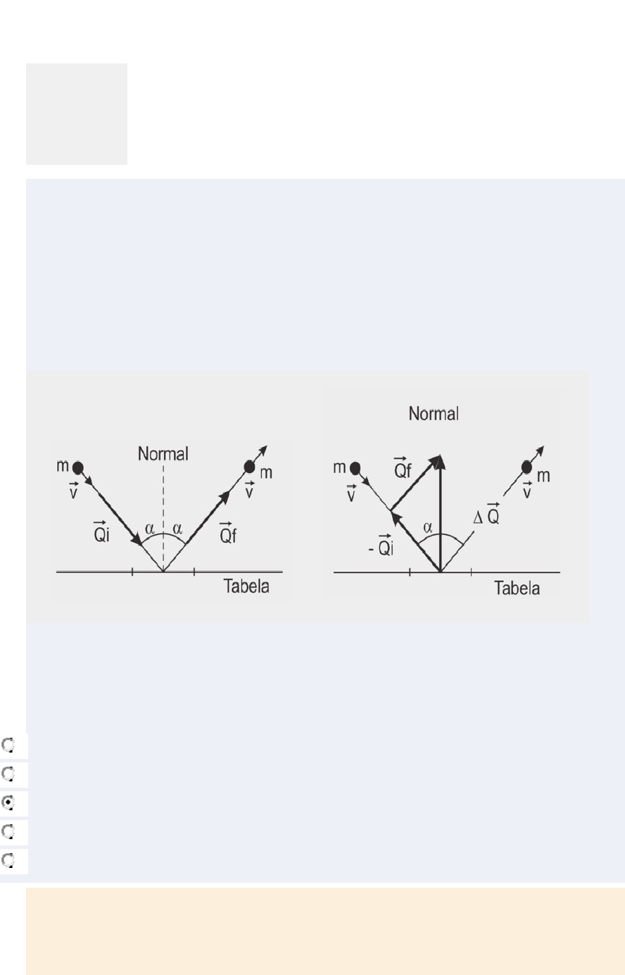 QUESTÃO 1 Correto Atingiu 2,0 de 2,0 Marcar questão Texto da questão A figura a seguir ilustra uma visão superior de uma mesa de sinuca, em que uma bola de massa 400g atinge a tabela com um ângulo de 60º com a normal e ricocheteia formando o mesmo ângulo com a normal. A velocidade da bola, de 9 m/s, altera apenas a direção do movimento durante o choque, que tem uma duração de 10ms. Qual o valor da força média da colisão da bola com a tabela? Escolha uma opção: a. 4000 N b. 5400 N c. 360 N d. 600 N e. 3600 N Feedback Sua resposta está correta. A resposta correta é: 360 N QUESTÃO 2 Correto Atingiu 2,0 de 2,0 Marcar questão Texto da questão Um bloco de massa 1kg move-se retilineamente com velocidade de módulo constante igual a 3m/s sobre urna superfície horizontal sem atrito. A partir de dado instante, o bloco recebe o impulso de sua força externa aplicada na mesma direção e sentido de seu movimento. A intensidade dessa força, em função do tempo, é dada pelo gráfico abaixo. A partir desse gráfico, pode-se afirmar que o módulo da velocidade do bloco após o impulso recebido é, em m/s de Escolha uma opção: a. -6 b. 1 c. 9 d. 5 e. 7 Feedback Sua resposta está correta. A resposta correta é: 9 QUESTÃO 3 Correto Atingiu 2,0 de 2,0 Marcar questão Texto da questão Uma esfera de massa m é lançada do solo verticalmente para cima, com velocidade inicial V, em módulo e atinge o solo 1 s depois. Desprezando todos os atritos, a variação no momento linear entre o instante do lançamento e o instante imediatamente antes do retorno ao solo é, em módulo: Escolha uma opção: a. 2mV b. mV c. mV2/2 d. mV/2 e. m Feedback Sua resposta está correta. A resposta correta é: 2mV QUESTÃO 4 Correto Atingiu 2,0 de 2,0 Marcar questão Texto da questão Considere uma esfera metálica em queda livre sob a ação somente da força peso. Sobre o módulo do momento linear desse corpo, pode-se afirmar corretamente que: Escolha uma opção: a. Nada se pode afirmar. b. É constante e diferente de zero durante a queda. c. Diminui durante a queda. d. É zero durante a queda. e. Aumenta durante a queda. Feedback Sua resposta está correta. A resposta correta é: Aumenta durante a queda. QUESTÃO 5 Correto Atingiu 2,0 de 2,0 Marcar questão Texto da questão Um objeto de massa igual a 2kg move-se em linha reta com velocidade constante de 4m/s. A partir de certo instante, uma força de módulo igual a 2N é exercida por 6s sobre o objeto, na mesma direção de seu movimento. Em seguida, o objeto colide frontalmente com um obstáculo e tem seu movimento invertido, afastando-se com velocidade de 3m/s. O módulo do impulso exercido pelo obstáculo e a variação da energia cinética do objeto, durante a colisão, foram, respectivamente: Escolha uma opção: a. 7 Ns e -7 J. b. 14 Ns e -7 J. c. 26 Ns e -7 J. d. 14 Ns e -91 J e. 26 Ns e -91 J Feedback Sua resposta está correta. A resposta correta é: 26 Ns e -91 J