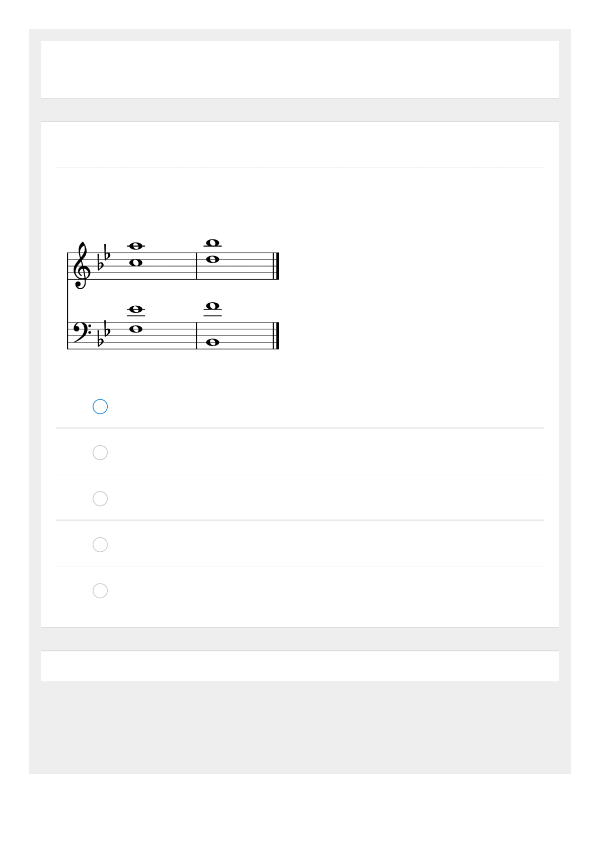 04/06/22, 09:59 Portal Educacional https://portaleducacional.redeclaretiano.edu.br/provas/9819517/editar 1/1 QO - Questões Online do ciclo 4 (Graduação EaD) Questão 2 de 4 2 - [269193] No trecho abaixo, temos: a) Cadência Autêntica (ou Final/Conclusiva) b) Cadência à Dominante (ou Cadência Suspensiva ou Semi-Cadência). c) Cadência Plagal. d) Cadência de Engano. e) Nenhuma das alternativas. © 2022 Claretiano - Rede de Educação