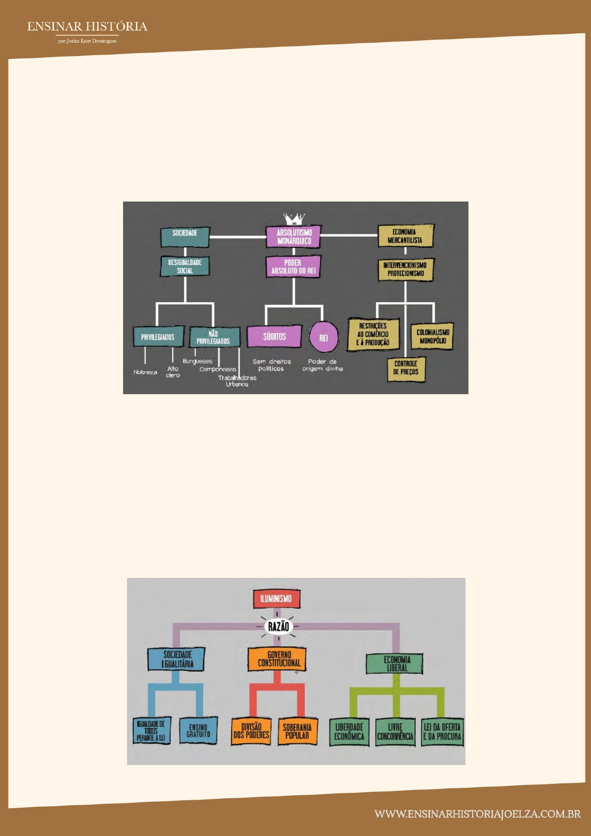 ANTIGO REGIME E ILUMISMO https://ensinarhistoriajoelza.com.br/iluminismo-do-antigo-regime-aos-nossos-dias/ Antigo Regime Os historiadores chamaram de Antigo Regime as instituições políticas e sociais dominantes em grande parte das potências europeias durante a Idade Modena (séculos XVI a XVIII). Observando o mapa mental abaixo, responda as questões a respeito do Antigo Regime. 1. Quais eram os três pilares que sustentavam o Antigo Regime? 2. O que caracterizava a sociedade estamental? Como ela era dividida? 3. Em que princípio se baseava o poder absoluto do rei? 4. O que caracterizava a economia mercantilista? 5. Qual era o papel do Brasil no Antigo Regime? Iluminismo O Iluminismo foi um movimento filosófico dominante na Europa ocidental no século XVIII. A palavra Iluminismo vem de Esclarecimento, no sentido de trazer luz, de iluminar a mente, isto é, a ideia dos indivíduos sobre todos os assuntos: política, sociedade, religião, economia etc. A maioria dos pensadores iluministas compartilhavaas ideias apresentadas no mapa mental abaixo. Observando-o, responda as questões a respeito do Iluminismo. 1. A partir de que condição os iluministas pensavam a sociedade, a política e a economia? 2. Que críticas os iluministas faziam à sociedade estamental? 3. Que críticas os iluministas faziam ao absolutismo monárquico? O que propunham? 4. Que críticas os iluministas faziam à economia mercantilista? O que propunham? 5. Quem foi o principal representante do liberalismo econômico? A que contexto histórico se referem as frases? Complete o quadro abaixo com as expressões correspondentes a cada contexto histórico. “O Estado sou eu”. “Nenhum homem tem uma autoridade natural sobre seu semelhante”. “A liberdade é um presente do céu, e cada indivíduo tem o direito de usufruir dela logo que utilize da razão”. “É exclusivamente na minha pessoa que reside o poder soberano”. “Nenhum homem tem uma autoridade natural sobre o seu semelhante”. “O trono real não é o trono de um homem, mas o próprio trono de Deus. O príncipe não precisa dar contas de seus atos a ninguém”. ANTIGO REGIME ILUMINISMO O que os iluministas criticavam? O que defendiam? Preencha o quadro a seguircom as afirmações que correspondam ao que os iluministas criticavam e defendiam. à reforma do Estado à liberdade de expressão à monarquia absolutista à perseguição política à liberdade de comércio à igualdade de todos perante a lei aos privilégios da nobreza e do clero à intolerância religiosa às restrições comerciais à educação laica, pública e gratuita OS ILUMINISTAS ERAM CONTRÁRIOS ERAM FAVORÁVEIS RESPOSTAS Antigo Regime 1. O antigo Regime apoiava-se na sociedade estamental, no absolutismo monárquico e na economia mercantilista. 2. A sociedade estamental era caracterizada pela desigualdade social e pela divisão da sociedade em privilegiados (nobreza e alto clero) e não privilegiados (todo restante da sociedade incluindo a burguesia, os camponeses e os trabalhadores urbanos). 3. O poder absoluto do rei baseava-se na origem divina do poder. 4. A economia mercantilista caracterizava-se pelo intervencionismo e protecionismo que impunham restrições ao comércio e à produção, o controle dos preços, o colonialismo e o monopólio. 5. O papel do Brasil como colônia era fornecer metais preciosos e produtos necessários à economia europeia, e consumir os artigos vendidos pela metrópole. Iluminismo 1. Os iluministas defendiam o uso da razão pois somente ela poderia iluminar o pensamento e modificar as condições da vida humana. 2. Os iluministas criticavam os privilégios de nascimento, característica da sociedade estamental. Propunham a igualdade jurídica (igualde perante a lei) e o ensino gratuito, público e laico. 3. Os iluministas criticavam a concentração de poderes nas mãos do governante (rei) e propunham um governo constitucional, com divisão dos poderes e respeito à soberania popular. 4. Os iluministas criticavam o controle do Estado sobre a economia, isto é, o intervencionismo e o protecionismo. Propunham a liberdade econômica, a livre concorrência entre empresas e nações. 5. O principal representante do liberalismo econômico foi o inglês Adam Smith. A que contexto histórico se referem as frases? ANTIGO REGIME ILUMINISMO “O Estado sou eu”. “Nenhum homem tem uma autoridade natural sobre seu semelhante”. “É exclusivamente na minha pessoa que reside o poder soberano”. “A liberdade é um presente do céu, e cada indivíduo tem o direito de usufruir dela logo que utilize da razão”. “O trono real não é o trono de um homem, mas o próprio trono de Deus. O príncipe não precisa dar contas de seus atos a ninguém”. “Nenhum homem tem uma autoridade natural sobre o seu semelhante”. O que os iluministas criticavam? O que defendiam? OS ILUMINIISTAS ERAM CONTRÁRIOS ERAM FAVORÁVEIS à monarquia absolutista à perseguição política aos privilégios da nobreza e do clero à intolerância religiosa às restrições comerciais à reforma do Estado à liberdade de expressão à liberdade de comércio à igualdade de todos perante a lei à educação laica, pública e gratuita Atividades baseadas no artigo e vídeo: Iluminismo: do Antigo Regime aos nossos dias https://ensinarhistoriajoelza.com.br/iluminismo-do-antigo-regime-aos-nossos-dias/ https://ensinarhistoriajoelza.com.br/iluminismo-do-antigo-regime-aos-nossos-dias/