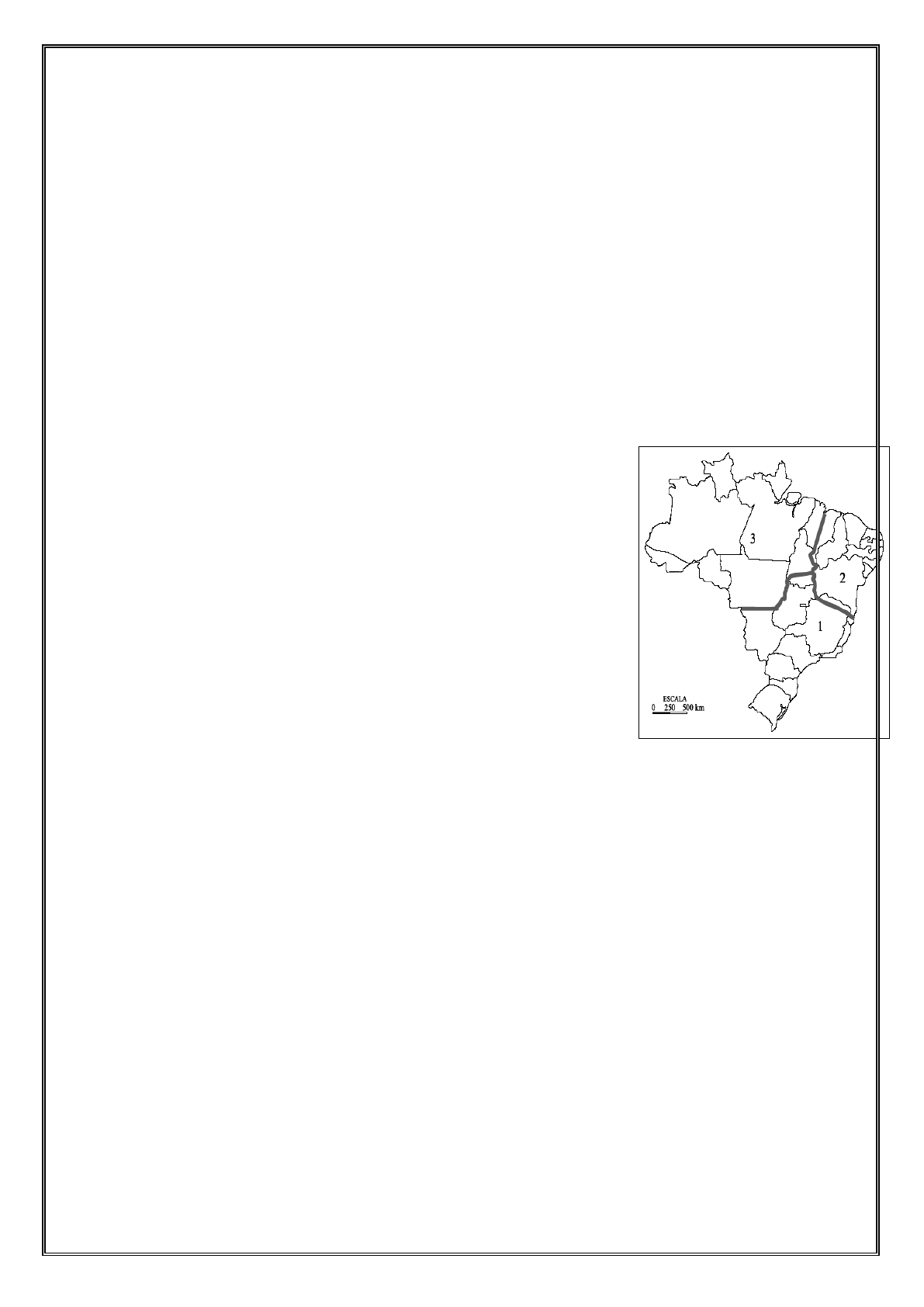 1 - Interprete o texto e o mapa a seguir: Os meus "nordestes" "Saio do sertão fugindo da seca. Vou para o Recife, onde o rio Capibaribe chega espremido. Passo pelo agreste onde vejo seca e terra verde. Onde os brejos têm capim viçoso, bom para o gado. E antes de chegar ao meu destino, passo pela zona da mata, onde sinto o cheiro da moagem, do bagaço da cana e do caldo no tacho. É hora de chegar e de lembrar do Maranhão de minha mãe, onde a densa floresta, a chuva, os buritis e grandes rios que penetram nas terras baixas são o forte da paisagem, tão diferente da terra de meu pai, do Jequitinhonha mineiro, onde posso ver serras e serras, caatinga e mandacarus, um lugar pobre, barrento e seco, onde parece que o Sol bebeu suas águas." Adaptado de um conto de José Severino Moraes (www.aprendebrasil.org.br) A partir dos dados apresentados e de seus conhecimentos geográficos, responda às questões propostas: a) Por que na regionalização apresentada no mapa, o sul do estado do Mato Grosso faz parte da Região Geoeconômica do Centro-Sul e o restante deste estado faz parte da Amazônia? ______________________________________________________________________________ ______________________________________________________________________________ b) Quais características apresentadas no texto, encontradas no norte de Minas Gerais, são típicas da Região Geoeconômica do Nordeste? ______________________________________________________________________________ ______________________________________________________________________________ ______________________________________________________________________________ 2 – Quais são as vantagens e as desvantagens de o Brasil ter extensas áreas de fronteiras? ______________________________________________________________________________ ______________________________________________________________________________ 3 – A falta de integração interna dos mercados regionais caracterizou o Brasil como economia de arquipélago. Quais medidas governamentais começaram a integração entre as regiões brasileiras? ______________________________________________________________________________ ______________________________________________________________________________ 4 – O geógrafo Pedro Pinchas Geiger, regionalizou o território brasileiro em três complexos regionais ou regiões geoeconômicas. Brasil: Complexos regionais ou Regiões Geoeconômicas a) Quais critérios foram utilizados pelo Pedro Pinchas Geiger para regionalizar o Brasil? ______________________________________________________________________________ ______________________________________________________________________________ b) Caracterize o Complexo Regional do Nordeste? ______________________________________________________________________________ ______________________________________________________________________________ c) Qual é o nome do complexo regional onde nós moramos? Caracterize-o. ______________________________________________________________________________ ______________________________________________________________________________ d) Esta divisão é definitiva? Justifique sua resposta. ______________________________________________________________________________ ______________________________________________________________________________ e) A divisão do Brasil em Regiões Geoeconômicas permite entender melhor como o espaço geográfico brasileiro está organizado. Por que o governo brasileiro utiliza os dados da regionalização do IBGE e não utiliza essa regionalização? ( Explique através de exemplos.) ______________________________________________________________________________ ______________________________________________________________________________ 5 – Observe os mapas abaixo. Brasil: Regiões Geoeconômicas Brasil: Divisão Regional IBGE Com base nos mapas e em seus conhecimentos sobre o assunto, marque V para as afirmativas verdadeiras e F para as falsas. a) ( ) De acordo com a Divisão Regional do IBGE, o país foi dividido em cinco regiões: Norte, Nordeste, Sul, Sudeste e Centro-Oeste, definidas pela combinação de aspectos naturais e socioeconômicos semelhantes. b) ( ) A regionalização conhecida como Regiões Geoeconômicas teve como um dos seus principais critérios, o desenvolvimento socioeconômico semelhante, e também a obediência aos limites territoriais dos estados. c) ( ) Apesar de não ser reconhecida como a divisão oficial do Brasil, as Regiões Geoeconômicas possibilitam a verificação de desigualdades sociais e os diferentes graus de desenvolvimento econômico existentes no país. 6. Com base no mapa abaixo e em seus conhecimentos adquiridos em sala de aula, responda às questões a seguir. a) Qual é a divisão regional apontada no mapa? ______________________________________________________________________________ ______________________________________________________________________________ ______________________________________________________________________________ ______________________________________________________________________________ b) Dê os nomes das regiões correspondentes aos números. ______________________________________________________________________________ ______________________________________________________________________________ ______________________________________________________________________________ ______________________________________________________________________________ ______________________________________________________________________________ 7. Explique o que é regionalizar o espaço geográfico. ______________________________________________________________________________ ______________________________________________________________________________ ______________________________________________________________________________ ______________________________________________________________________________ ______________________________________