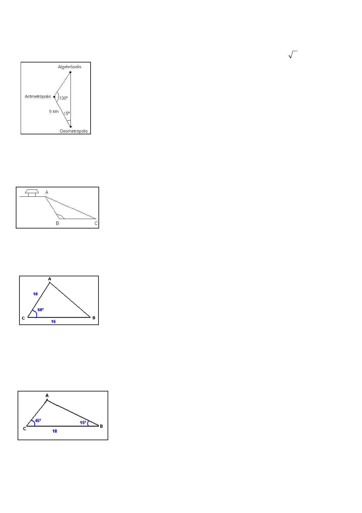 01. Algebrópolis, Geometrópolis e Aritmetrópolis são cidades do país Matematiquistão, localizadas conforme a figura. A partir dos dados fornecidos, determine a distância aproximada de Geometrópolis a Algebrópolis. Considere 4,12 . 02. (UEPA) A figura abaixo mostra o corte lateral de um terreno onde será construída uma rampa reta, _____ AC , que servirá para o acesso de veículos à casa, que se encontra na parte mais alta do terreno. A distância de A a B é de 6 m, de B a C é de 10 m e o ângulo ABC mede 120º.Qual deve ser o valor do comprimento da rampa em metros? 03. Dado o triângulo ABC e sabendo que o lado a mede 16, o lado b mede 10 e o ângulo formado por estes lados é 60º, qual é o valor do lado c do triângulo? 04. Dado o triângulo abaixo, e sabendo que dois de seus ângulos são de 15 o e 45o respectivamente e que o lado em comum mede 18, quais são os valores dos lados b e c? Dados: sen15º = 0,26; sen120º = 0,86 e sen45º = 0,70 05. Calcule o cosseno do ângulo obtuso x do triângulo ABC. 06. Um topógrafo pretende medir a distância entre dois pontos (A e B) situados em margens opostas de um rio. Para isso, ele escolheu um ponto C na margem em que está, e mediu os ângulos BCA ˆ e BAC ˆ , encontrando, respectivamente, 45° e 75º. Determine _____ AB , sabendo que _____ AC mede 16 m. (Utilize 4,12 ). 07. Calcule a distância dos pontos A e B, entre os quais há uma montanha, sabendo que suas distâncias a um ponto fixo M são de 2km e 3km, respectivamente. A medida do ângulo BMA ˆ é igual a 60º. 08. Determine a distância d indicada na figura. 45 75 300m d Slide 1 Slide 2