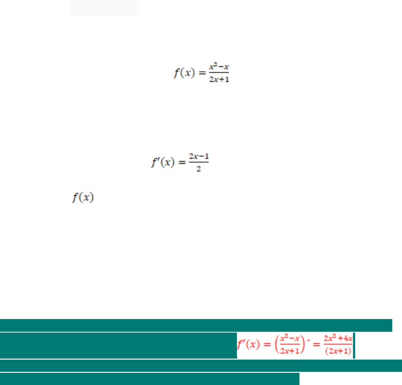 Atividade 2 CÁLCULO APLICADO UMA VARIÁVEL Questão 4) Numa avaliação, um professor solicitou que os alunos encontrassem a derivada da seguinte função racional polinomial: . Chamou a atenção do professor a resolução do aluno Paulo, que derivou a função uma vez e fez as afirmações descritas nas asserções I e II, a seguir. A partir do apresentado, analise as asserções I e II e a relação proposta entre elas. I. A derivada da função é igual Pois: II. para derivar nesse caso é necessário usar a regra do quociente. A seguir, assinale a alternativa correta. Resposta Correta: A asserção I é uma proposição falsa, e a II é uma proposição verdadeira. Resposta correta. A asserção I é uma proposição falsa. De acordo com a regra do quociente, a derivada da função racional é igual a , diferentemente da derivada proposta na afirmativa I. É evidente que a afirmativa II é verdadeira, pois foi utilizada a regra do quociente para derivar.