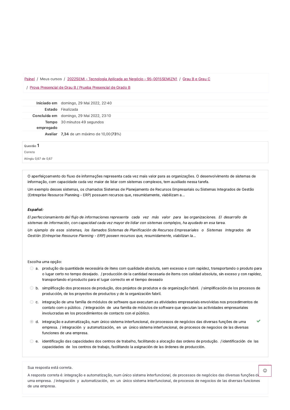 6/5/22, 11:02 PM Prova Presencial de Grau B / Prueba Presencial de Grado B: Revisão da tentativa https://eadgraduacao.ftec.com.br/mod/quiz/review.php?attempt=765600&cmid=384783#question-785678-7 1/9 Painel / Meus cursos / 2022SEMI - Tecnologia Aplicada ao Negócio - 95-0015SEMIZN1 / Grau B e Grau C / Prova Presencial de Grau B / Prueba Presencial de Grado B Iniciado em domingo, 29 Mai 2022, 22�40 Estado Finalizada Concluída em domingo, 29 Mai 2022, 23�10 Tempo empregado 30 minutos 49 segundos Avaliar 7,34 de um máximo de 10,00(73%) Questão 1 Correto Atingiu 0,67 de 0,67 O aperfeiçoamento do fluxo de informações representa cada vez mais valor para as organizações. O desenvolvimento de sistemas de informação, com capacidade cada vez maior de lidar com sistemas complexos, tem auxiliado nessa tarefa. Um exemplo desses sistemas, os chamados Sistemas de Planejamento de Recursos Empresariais ou Sistemas Integrados de Gestão (Entreprise Resource Planning - ERP) possuem recursos que, resumidamente, viabilizam a... Español: El perfeccionamiento del flujo de informaciones representa cada vez más valor para las organizaciones. El desarrollo de sistemas de información, con capacidad cada vez mayor de lidiar con sistemas complejos, ha ayudado en esa tarea. Un ejemplo de esos sistemas, los llamados Sistemas de Planificación de Recursos Empresariales o Sistemas Integrados de Gestión (Entreprise Resource Planning - ERP) poseen recursos que, resumidamente, viabilizan la... Escolha uma opção: a. produção da quantidade necessária de itens com qualidade absoluta, sem excesso e com rapidez, transportando o produto para o lugar certo no tempo desejado. / producción de la cantidad necesaria de ítems con calidad absoluta, sin exceso y con rapidez, transportando el producto para el lugar correcto en el tiempo deseado b. simplificação dos processos de produção, dos projetos de produtos e da organização fabril. / simplificación de los procesos de producción, de los proyectos de productos y de la organización fabril. c. integração de uma família de módulos de software que executam as atividades empresariais envolvidas nos procedimentos de contato com o público. / integración de una familia de módulos de software que ejecutan las actividades empresariales involucradas en los procedimientos de contacto con el público. d. integração e automatização, num único sistema interfuncional, de processos de negócios das diversas funções de uma empresa. / integración y automatización, en un único sistema interfuncional, de procesos de negocios de las diversas funciones de una empresa. e. identificação das capacidades dos centros de trabalho, facilitando a alocação das ordens de produção. / identificación de las capacidades de los centros de trabajo, facilitando la asignación de las órdenes de producción. Sua resposta está correta. A resposta correta é: integração e automatização, num único sistema interfuncional, de processos de negócios das diversas funções de uma empresa. / integración y automatización, en un único sistema interfuncional, de procesos de negocios de las diversas funciones de una empresa. https://eadgraduacao.ftec.com.br/course/view.php?id=4863 https://eadgraduacao.ftec.com.br/my/ https://eadgraduacao.ftec.com.br/course/view.php?id=4863 https://eadgraduacao.ftec.com.br/course/view.php?id=4863§ion=6 https://eadgraduacao.ftec.com.br/mod/quiz/view.php?id=384783 6/5/22, 11:02 PM Prova Presencial de Grau B / Prueba Presencial de Grado B: Revisão da tentativa https://eadgraduacao.ftec.com.br/mod/quiz/review.php?attempt=765600&cmid=384783#question-785678-7 2/9 Questão 2 Correto Atingiu 0,67 de 0,67 Normalmente ouvimos falar em groupware ou sistemas de CSCW, que significam Computer Supported Cooperative Work, ou seja, falamos de sistemas que suportam ou apoiam o trabalho de forma colaborativa e que utilizam computadores para facilitar o trabalho dos grupos e seu contato. Para a elaboração de um sistema colaborativo necessitamos de: I - hardware que corresponde aos computadores, notes, smartphones, rede, etc., II - softwares utilizados para conectar os hardwares e fazer funcionar o sistema como um todo III - pessoas, que utilizam este sistema para trabalharem em grupo e tomarem decisões, desenvolverem soluções, resolverem problemas que surgem no decorrer da atividade empresarial. Considerando-se as afirmativas acima, conclui-se que: Español: Normalmente escuchamos hablar sobre groupware o sistemas de CSCW, que significan Computer Supported Cooperative Work, o sea, hablamos de sistemas que soportan o apoyan el trabajo de forma colaborativa y que utilizan computadoras para facilitar el trabajo de los grupos y su contacto. Para la elaboración de un sistema colaborativo necesitamos: I - hardware que corresponde a las computadoras, portátiles, smartphones, red, etc., II - softwares utilizados para conectar los hardwares y hacer funcionar el sistema como un todo III - personas, que utilizan este sistema para trabajar en grupo y tomar decisiones, desarrollar soluciones, resolver problemas que surgen en el transcurso de la actividad empresarial. Considerando las afirmaciones de arriba, concluye que: Escolha uma opção: a. Todas as afirmativas estão erradas. / Todas las afirmaciones están incorrectas. b. Todas as afirmativas estão corretas. / Todas las afirmaciones están correctas. c. Apenas as afirmativas I e II estão corretas. / Apenas las afirmaciones I y II están correctas. d. Apenas as afirmativas II e III estão corretas. / Apenas las afirmaciones II y III están correctas. e. Apenas as afirmativas I e III estão corretas. / Apenas las afirmaciones I y III están correctas. Sua resposta está correta. A resposta correta é: Todas as afirmativas estão corretas. / Todas las afirmaciones están correctas. 6/5/22, 11:02 PM Prova Presencial de Grau B / Prueba Presencial de Grado B: Revisão da tentativa https://eadgraduacao.ftec.com