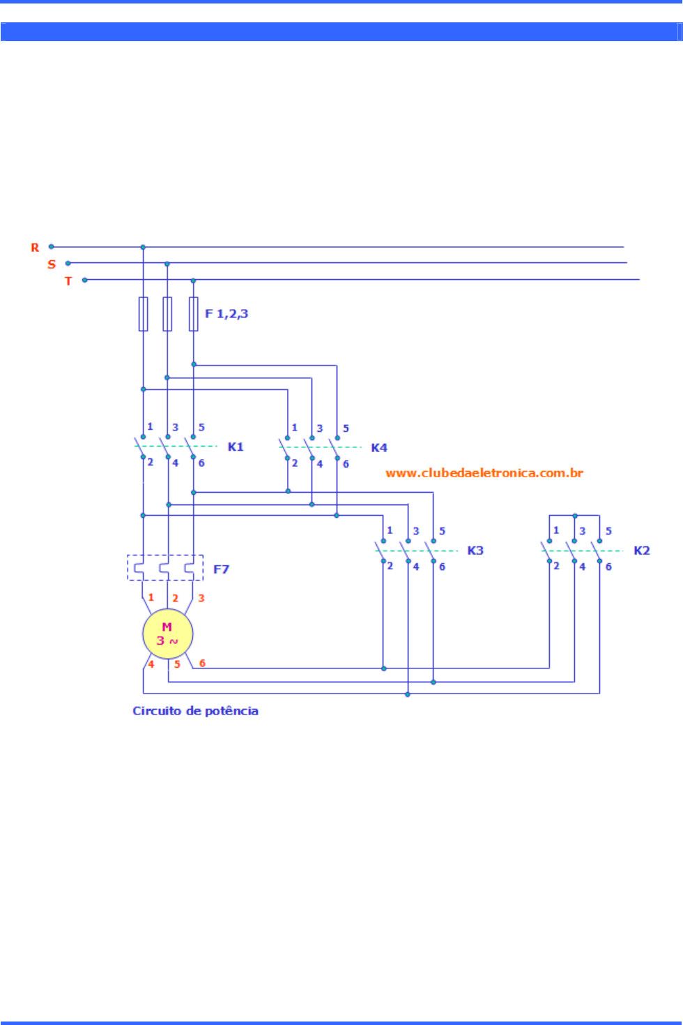 www.clubedaeletronica.com.br Eletricidade Autor: Clodoaldo Silva – Partida estrela triângulo com reversão – Revisão: 05fev2015. 1 Atividade prática – Partida estrela triângulo com reversão A partida estrela triângulo, consiste na alimentação do motor com redução de tensão nas bobinas, durante a partida. Assim, as bobinas do motor recebem somente 58% (1 ÷ √3) da tensão nominal e após a haverá comutação automática para triângulo e as bobinas passam a receber 100% da tensão nominal. A partida direta reversa proporciona ao operador, duas botoeiras, uma para que o motor gire no sentido horário e outra no sentido anti-horário. A partida estrela triângulo com reversão une as duas partidas supracitadas em uma só. O diagrama de potência A sequência operacional Botoeira BL1 – Energiza-se k1 e k2 (Y horário) e após o tempo pré-determinado desenergiza-se k2 e energizando k3. (∆ horário). Botoeira BL2 – Energiza-se k4 e k2 (Y anti-horário) e após o tempo pré-determinado desenergiza-se k2 e energizando k3. (∆ anti-horário). www.clubedaeletronica.com.br Eletricidade Autor: Clodoaldo Silva – Partida estrela triângulo com reversão – Revisão: 05fev2015. 2 O diagrama de comando Descrição de funcionamento Sentido horário Pressionando BL1 energizam-se os contatores k1 e k2 e o temporizador d1 que dá inicio a contagem de tempo. Neste momento, o motor está ligado em estrela e girando no sentido horário, terminando o tempo fecha-se o contado do temporizador d1 muda de posição desenergizando k2 e energisando k3. Agora o motor está ligado em triângulo no sentido horário. Sentido anti-horário Pressionando BL2 energizam-se os contatores k4 e k2 (observe no diagrama de potência que k4 inverte as fases do motor) e o temporizador d1 que dá inicio a contagem de tempo. Neste momento, o motor está ligado em estrela no sentido anti-horário, terminando o tempo o preestabelecido o contato do temporizador d1 muda de posição desenergizando k2 e energizando k4. Agora o motor está ligado em triângulo no sentido anti-horário. Os intertravamentos impedem k1 e k4 de serem acionados ao mesmo tempo. Também foi colocado um intertravamentos para evitar que k2 e k3 fiquem energizados ao mesmo tempo. Não existe vento favorável para aquele que não sabe para onde vai. (Arthur Schopenhauer) Boa aula... www.clubedaeletronica.com.br
