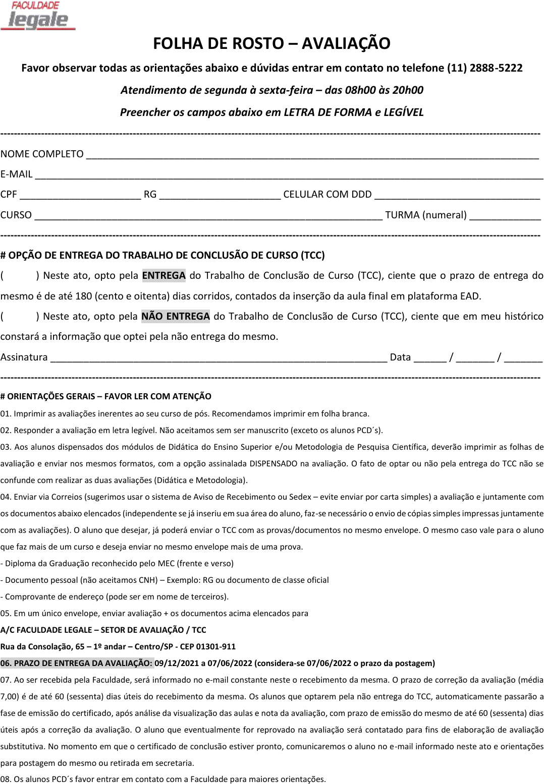 FOLHA DE ROSTO – AVALIAÇÃO Favor observar todas as orientações abaixo e dúvidas entrar em contato no telefone (11) 2888-5222 Atendimento de segunda à sexta-feira – das 08h00 às 20h00 Preencher os campos abaixo em LETRA DE FORMA e LEGÍVEL --------------------------------------------------------------------------------------------------------------------------------------------------------------- NOME COMPLETO __________________________________________________________________________________ E-MAIL ____________________________________________________________________________________________ CPF ______________________ RG ______________________ CELULAR COM DDD ______________________________ CURSO _______________________________________________________________ TURMA (numeral) _____________ --------------------------------------------------------------------------------------------------------------------------------------------------------------- # OPÇÃO DE ENTREGA DO TRABALHO DE CONCLUSÃO DE CURSO (TCC) ( ) Neste ato, opto pela ENTREGA do Trabalho de Conclusão de Curso (TCC), ciente que o prazo de entrega do mesmo é de até 180 (cento e oitenta) dias corridos, contados da inserção da aula final em plataforma EAD. ( ) Neste ato, opto pela NÃO ENTREGA do Trabalho de Conclusão de Curso (TCC), ciente que em meu histórico constará a informação que optei pela não entrega do mesmo. Assinatura _____________________________________________________________ Data ______ / _______ / _______ --------------------------------------------------------------------------------------------------------------------------------------------------------------- # ORIENTAÇÕES GERAIS – FAVOR LER COM ATENÇÃO 01. Imprimir as avaliações inerentes ao seu curso de pós. Recomendamos imprimir em folha branca. 02. Responder a avaliação em letra legível. Não aceitamos sem ser manuscrito (exceto os alunos PCD´s). 03. Aos alunos dispensados dos módulos de Didática do Ensino Superior e/ou Metodologia de Pesquisa Científica, deverão imprimir as folhas de avaliação e enviar nos mesmos formatos, com a opção assinalada DISPENSADO na avaliação. O fato de optar ou não pela entrega do TCC não se confunde com realizar as duas avaliações (Didática e Metodologia). 04. Enviar via Correios (sugerimos usar o sistema de Aviso de Recebimento ou Sedex – evite enviar por carta simples) a avaliação e juntamente com os documentos abaixo elencados (independente se já inseriu em sua área do aluno, faz-se necessário o envio de cópias simples impressas juntamente com as avaliações). O aluno que desejar, já poderá enviar o TCC com as provas/documentos no mesmo envelope. O mesmo caso vale para o aluno que faz mais de um curso e deseja enviar no mesmo envelope mais de uma prova. - Diploma da Graduação reconhecido pelo MEC (frente e verso) - Documento pessoal (não aceitamos CNH) – Exemplo: RG ou documento de classe oficial - Comprovante de endereço (pode ser em nome de terceiros). 05. Em um único envelope, enviar avaliação + os documentos acima elencados para A/C FACULDADE LEGALE – SETOR DE AVALIAÇÃO / TCC Rua da Consolação, 65 – 1º andar – Centro/SP - CEP 01301-911 06. PRAZO DE ENTREGA DA AVALIAÇÃO: 09/12/2021 a 07/06/2022 (considera-se 07/06/2022 o prazo da postagem) 07. Ao ser recebida pela Faculdade, será informado no e-mail constante neste o recebimento da mesma. O prazo de correção da avaliação (média 7,00) é de até 60 (sessenta) dias úteis do recebimento da mesma. Os alunos que optarem pela não entrega do TCC, automaticamente passarão a fase de emissão do certificado, após análise da visualização das aulas e nota da avaliação, com prazo de emissão do mesmo de até 60 (sessenta) dias úteis após a correção da avaliação. O aluno que eventualmente for reprovado na avaliação será contatado para fins de elaboração de avaliação substitutiva. No momento em que o certificado de conclusão estiver pronto, comunicaremos o aluno no e-mail informado neste ato e orientações para postagem do mesmo ou retirada em secretaria. 08. Os alunos PCD´s favor entrar em contato com a Faculdade para maiores orientações. Nattalia Rayanne Gomes da Silva Oliveira - 09713694457 AVALIAÇÃO PÓS EM DIREITO CIVIL E PROCESSO CIVIL – TURMA 11 01. O princípio da inércia jurisdicional pressupõe: a) Que os Juízes somente devem se pronunciar de ofício; b) Que o Judiciário está autorizado a instalar ações judiciais sem prévia provocação; c) Que a prestação jurisdicional necessita de prévia provocação da parte; d) Nenhuma das alternativas. 02. Dentra os temas abaixo, pode-se afirmar que representam preliminares de contestação: a) Prescrição e Decadência; b) Ilegitimidade de parte e incompetência absoluta ou relativa do Juízo; c) Ausência do direito material discutido; d) Fato impeditivo, modificativo ou extintivo do direito do autor. 03. Dentra os temas abaixo, pode-se afirmar que representam matéria de mérito da contestação: a) Prescrição e Decadência; b) Ilegitimidade de parte e incompetência absoluta ou relativa do Juízo; c) Ausência do direito material discutido; d) As alternativas “a” e “c” estão corretas. 04. Não é requisito explicito da petição inicial e que obrigatoriamente deve ser formulado pela parte: a) Informar interesse pela conciliação nas causas de procedimento comum; b) Partes e respectiva qualificação; c) Construção das causas de pedir remota e próxima; d) Requerimento de citação do Réu. 05. O recurso de apelação possui como principal(pais) efeito(s): a) Devolutivo somente; b) Suspensivo somente; c) Devolutivo e suspensivo; d) Retratativo somente. 06. O agravo de instrumento será sempre admitido: a) Contra decisões interlocutórias decorrentes da fase de conhecimento; b) Contra decisões interlocutórias decorrentes da fase recursal; c) Contra decisões interlocutórias decorrentes dos pr