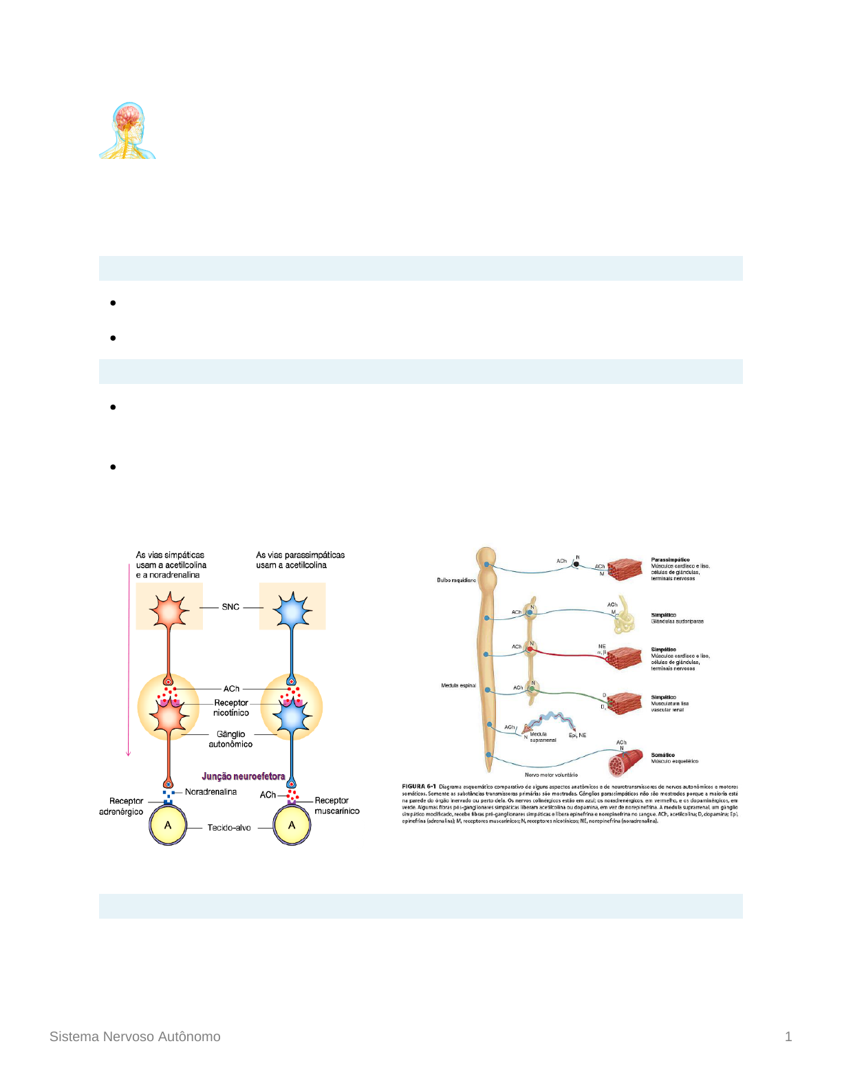 Sistema Nervoso Autônomo 1 Sistema Nervoso Autônomo Fibras Nervosas Cervicosacral → parassimpáticas Toracolombar → simpáticas Diferenças Anatômicas SNA Simpático: fibras pré-ganglionares curtas e fibras pós-ganglionares compridas → no geral, as pré liberam acetilcolina e as pós noradrenalina SNA Parassimpático: fibras pré-ganglionares compridas e fibras pós-ganglionares curtas → as pré liberam acetilcolina e as pós acetilcolina também Receptores Colinérgicos Se a transmissão é mediada pela acetilcolina, o neurônio é denominado colinérgico. A acetilcolina intermedeia a transmissão do impulso nervoso por meio dos gânglios Sistema Nervoso Autônomo 2 autônomos nos sistemas nervosos simpático e parassimpático. Na porção pós- ganglionar tem mais relação com o SNA Parassimpático. Muscarínicos (M1): receptores transmembrana acoplados à proteína G Atropina é antagonista para todos N1, N2, N3, N4, N5 Nicotínicos: receptores tipo canais iônicos (ROC) → passagem de sódio Ng (Nn) → Ng = ganglionar / Nn = da placa motora Nm Receptores Adrenérgicos Quando a norepinefrina e a epinefrina são os neurotransmissores, a fibra é denominada adrenérgica. No sistema simpático, a norepinefrina intermedeia a Sistema Nervoso Autônomo 3 transmissão dos impulsos dos nervos pós-ganglionares autônomos para o órgão efetor. Mais relacionados ao SNA Simpático A norepinefrina e a epinefrina são ligantes endógenos, perifericamente pela secreção da glândula adrenal (80% adrenalina) e noradrenalina sendo secretada pelas fibrs simpáticas Ambos os tipos de receptores são do tipo transmembrana acoplados à proteína G Receptores Alfa (α): α1 e α2 Receptores Beta (β): β1, β2 e β3 (tecido adiposo apenas) Ações do Simpático e Parassimpático no Organismo O SNA possui dois estados: Luta e fuga → SNA Simpático (conta para exercícios físicos também) Digestão e repouso → SNA Parassimpático Sistema Nervoso Autônomo 4 OLHOS A miose (contração da pupila) é efeito do SNA Parassimpático, por intermédio de receptores muscarínicos A midríase (dilatação da pupila) é efeito do SNA Simpático, por intermédio de receptores α1 Clínica: fármacos para causar midríase são antagonistas competitivos muscarínicos, ou seja, não deixam que haja a ligação do receptor com a acetilcolina, assim não havendo a contração da pupila Canal de Schlemm Tem como função drenar o humor aquoso - a ligação do receptor muscarínico com a acetilcolina faz com que o canal relaxe, assim, a administração de agonistas muscarínicos irão aumentar a drenagem Sistema Nervoso Autônomo 5 Pacientes com glaucoma (elevação da pressão intraocular) não podem tomar fármacos antagonistas muscarínicos, pois assim terá uma contração do canal, causando piora do caso Glaucoma de ângulo fechado é devido à um problema anatômico, pelo fechamento do canal pelo processo ciliar Glaucoma de ângulo fechado é devido à um problema funcional, no qual a drenagem falha GLÂNDULAS LACRIMAIS Pelo SNA Simpático, os receptores α1 são responsáveis pela formação das lágrimas Pelo SNA Parassimpático, os receptores muscarínicos são responsáveis pela secreção lacrimal GLÂNDULAS SALIVATÓRIAS Pelo SNA Simpático, os receptores α1 são responsáveis pela secreção de saliva mais viscosa, pobre em água, deixa a boca seca Pelo SNA Parassimpático, os receptores muscarínicos são responsáveis pela secreção da saliva fluida/aquosa Sistema Nervoso Autônomo 6 GLÂNDULAS SUDORÍPARAS E MÚSCULO PIlOERETOR Pelo SNA Simpático, ocorre a sudorese e piloereção TRATO RESPIRATÓRIO Não há inervação simpática na musculatura lisa Pelo SNA Simpático, os receptores β2 (ativados pela adrenalina) causa a broncodilatação Pelo SNA Parassimpático, os receptores muscarínicos causam broncoconstrição e mucosecreção TRATO GASTROINTESTINAL Boa parte da invervação é parassimpática, e o simpático tem pouca participação Ácido é secretado pelas células parietais nos dois terços proximais (corpo) do estômago. O ácido gástrico facilita a digestão criando um pH ideal para a pepsina e a lipase gástrica e estimulando a secreção de bicarbonato pelo pâncreas. A secreção ácida se inicia pela alimentação: pensar, cheirar ou saborear o alimento estimula uma via vagal, estimulando as células G localizadas no terço distal (antro) do estômago. A chegada de proteína ao estômago estimula mais ainda a liberação de gastrina. A gastrina circulante causa a liberação de histamina pelas células semelhantes a enterocromafim no corpo gástrico. A histamina estimula as células parietais por meio de receptores H2. As células parietais secretam ácido, o que causa queda do pH, estimulando células D antrais a liberarem somatostatina, a qual inibe a liberação de gastrina (feedback negativo). Existem 3 esfíncteres no trato intestinal (estômago e dudodeno, intestino delgado e grosso e anal) que são involuntários e relaxados após a recepção de acetilcolina nos receptores muscarínicos - que estão presentes também nas células parietais e auxiliam na secreção de HCl e no peristaltismo O movimento peristáltico é funcional, por ordenamento da contração dos feixes musculares Sistema Nervoso Autônomo 7 Há mecanoreceptores no feixe nervoso mioentérico, ativados pela pressão contea a parede do estômago e percorrendo todo o trato gastrointestinal FÍGADO O SNA Simpático tem paticipação importante, por meio dos receptores β2 na glicogenólise (produção de insulina) O SNA Parassimpático, por meio da ativação de receptores muscarínicos regula a secreção de enzimas digestivas do pâncreas e secreção da bile → ação na vesícula biliar GLÂNDULA ADRENAL Recebe apenas inervação pré-ganglionar, sendo assim seu neuroreceptor é colinérgico (responde à acetilcolina) do tipo N-nicotínico (Ng), devido à embriologia é considerado um gân