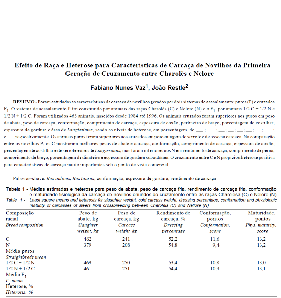 Atividade Disciplina: Melhoramento Animal Professora: Chiara Rodrigues 1. O resumo e as tabelas abaixo foram retirados de um artigo científico publicado na Revista Brasileira de Zootecnia em 2001. Preencha as tabelas 1, 2, 3 e 4 com as médias dos puros, as médias da F1 e com os valores de heterose calculado para cada característica. Em seguida, no resumo, insira os valores de heterose para as características nas quais os cruzados foram superiores aos puros, na ordem que está descrita no texto.